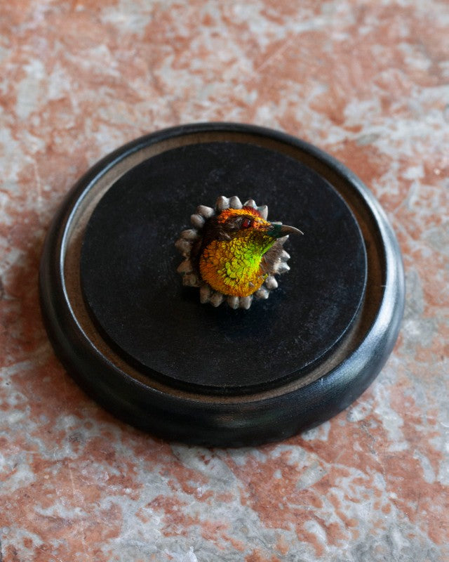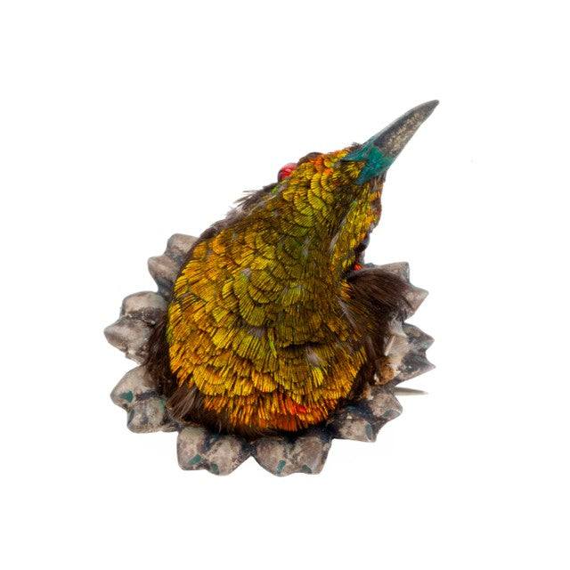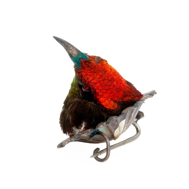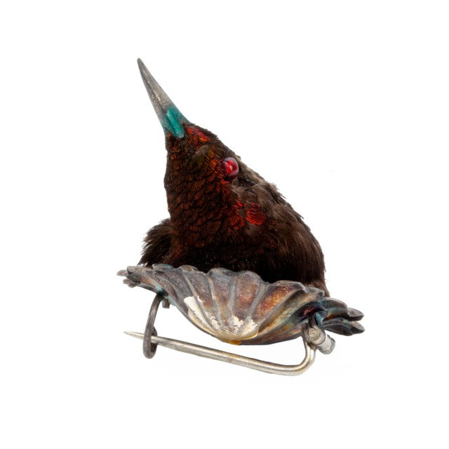 Measures 1" in length, with original brooch fitting. We recommend that this piece be used for display purposed only and not worn. Comes with wooden pedestal and glass cover. There is some patina on the metal we have not attempted to remove in fear cleaning could damage the well preserved taxidermy.