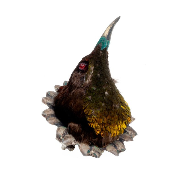 Rare Victorian taxidermy hummingbird brooch, set in gilded metal. English in origin. Circa 1860. Iridescent feathers change color depending on angle viewed. The Victorians were known for their love of naturalism. This delicate well preserved antique hummingbird displays vibrant feathers with garnet eyes. These naturalist pieces are delicate in nature and make for wonderful display objects.