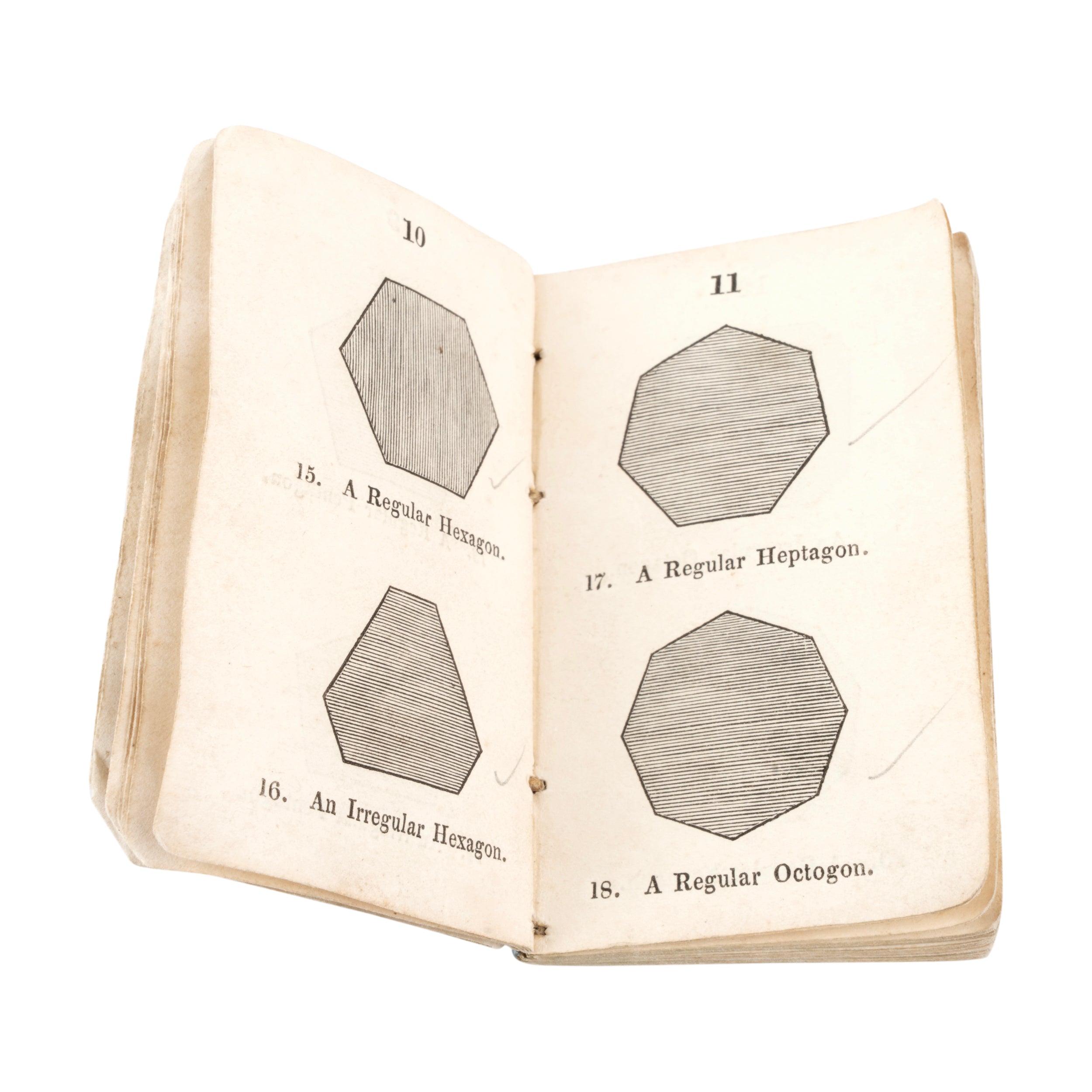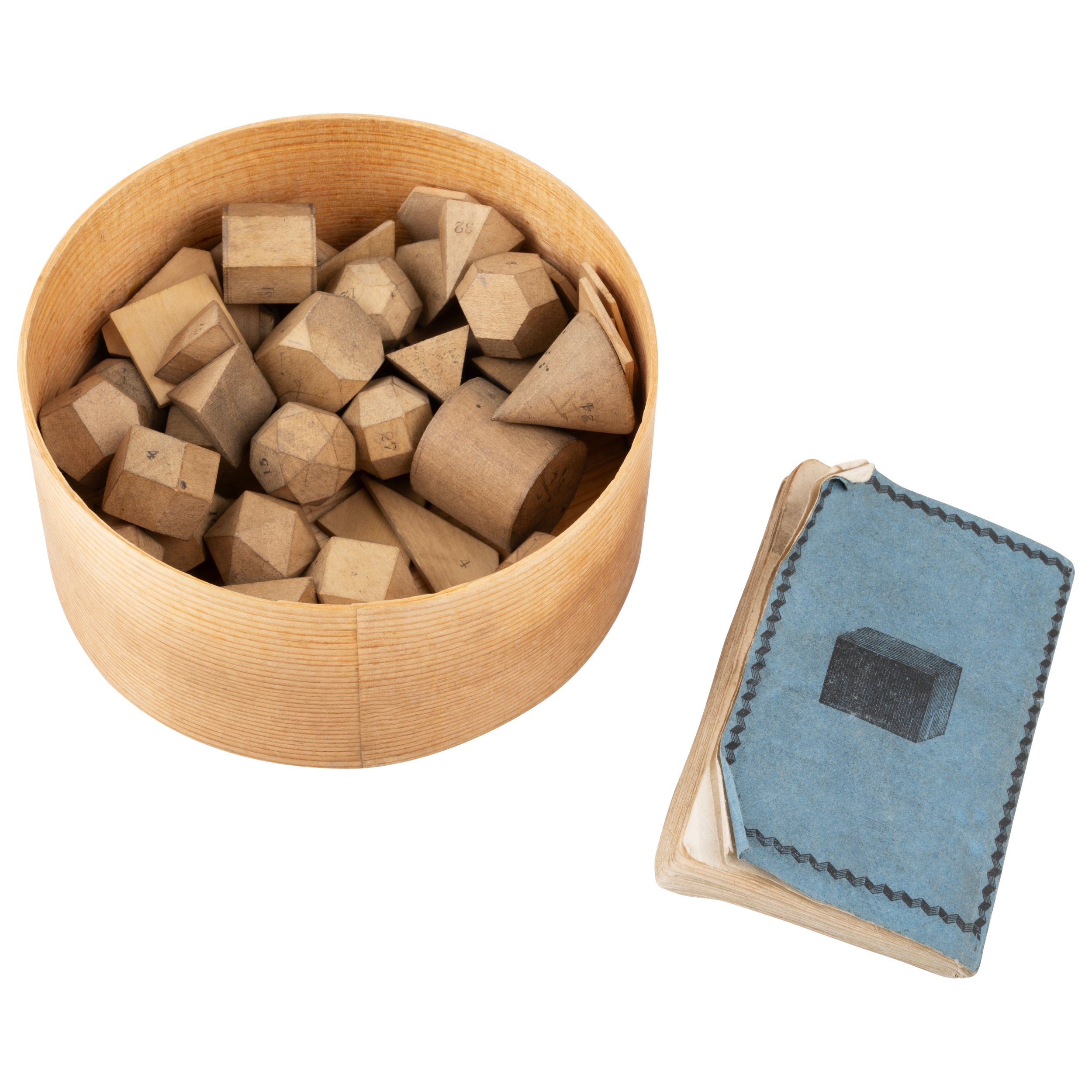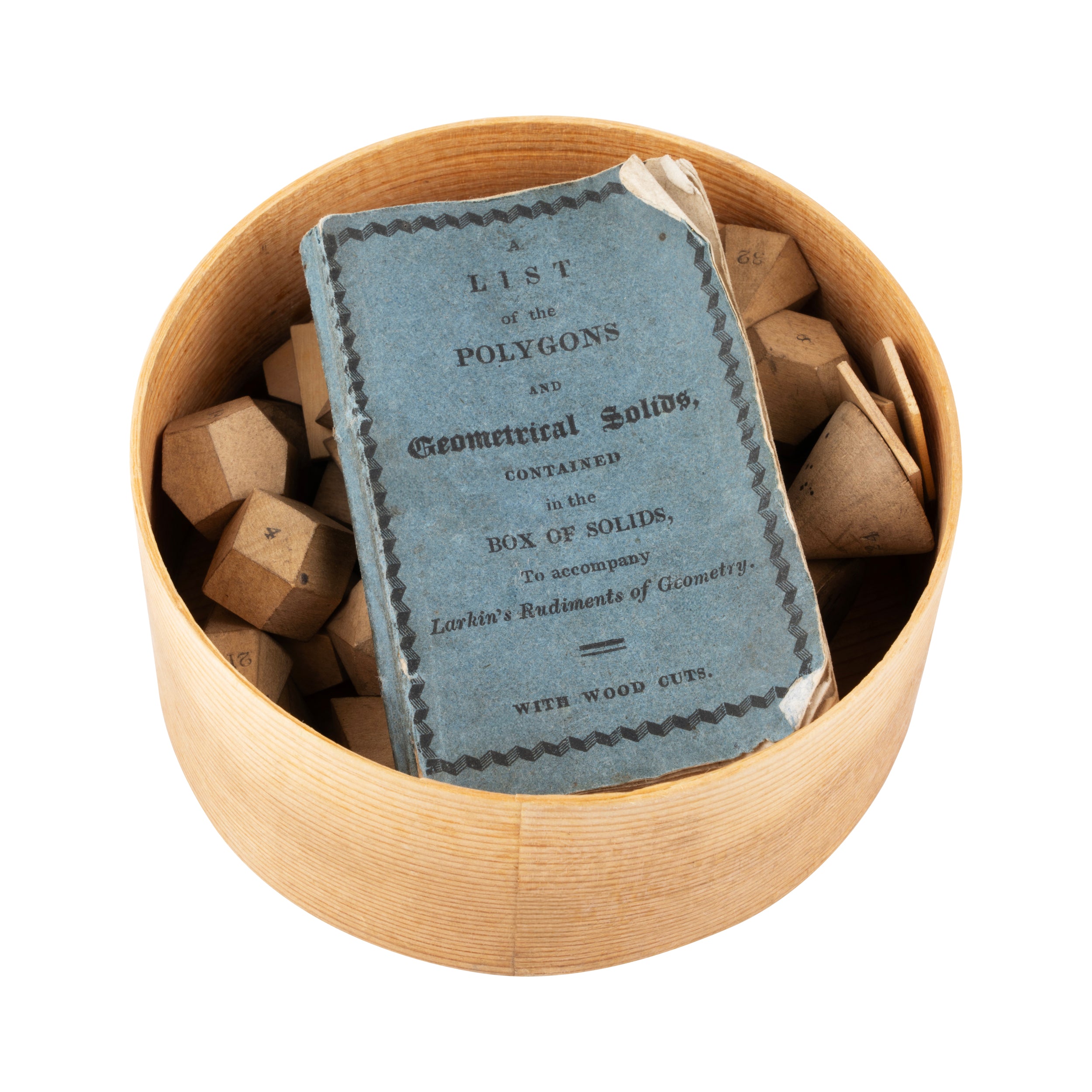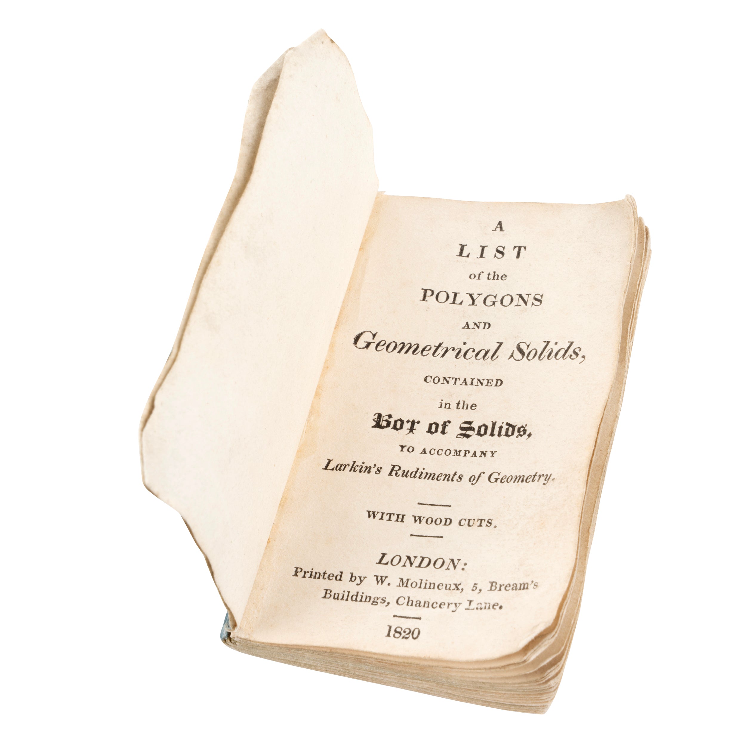 A Regency 'Box of Solids', with a booklet 'A List of the Polygons and Geometrical Solids'. An educational, carved wooden geometry instructional set. Various three-dimensional woodcut shapes, an original box, and a booklet. Printed by W. Molinex,5, Bream's Buildings, Chancery Lane.