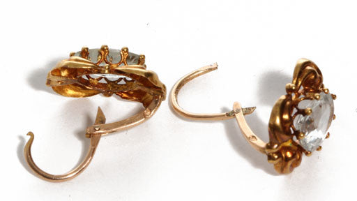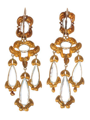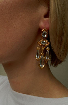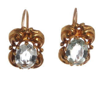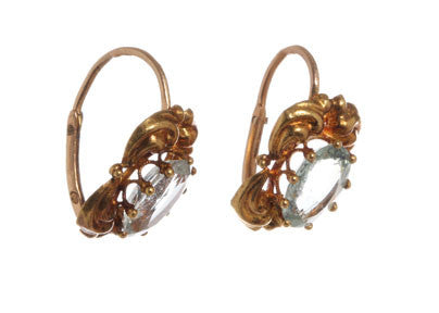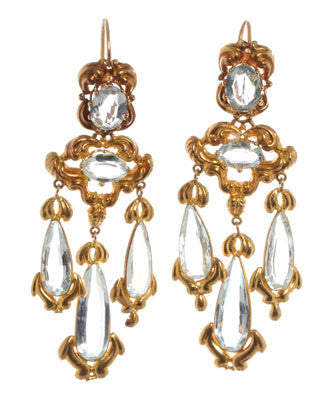 1830's repoussé aquamarine earrings in 18k gold. Long and light for day and night the bottom portion of each earring detaches to reveal an additional look for day.