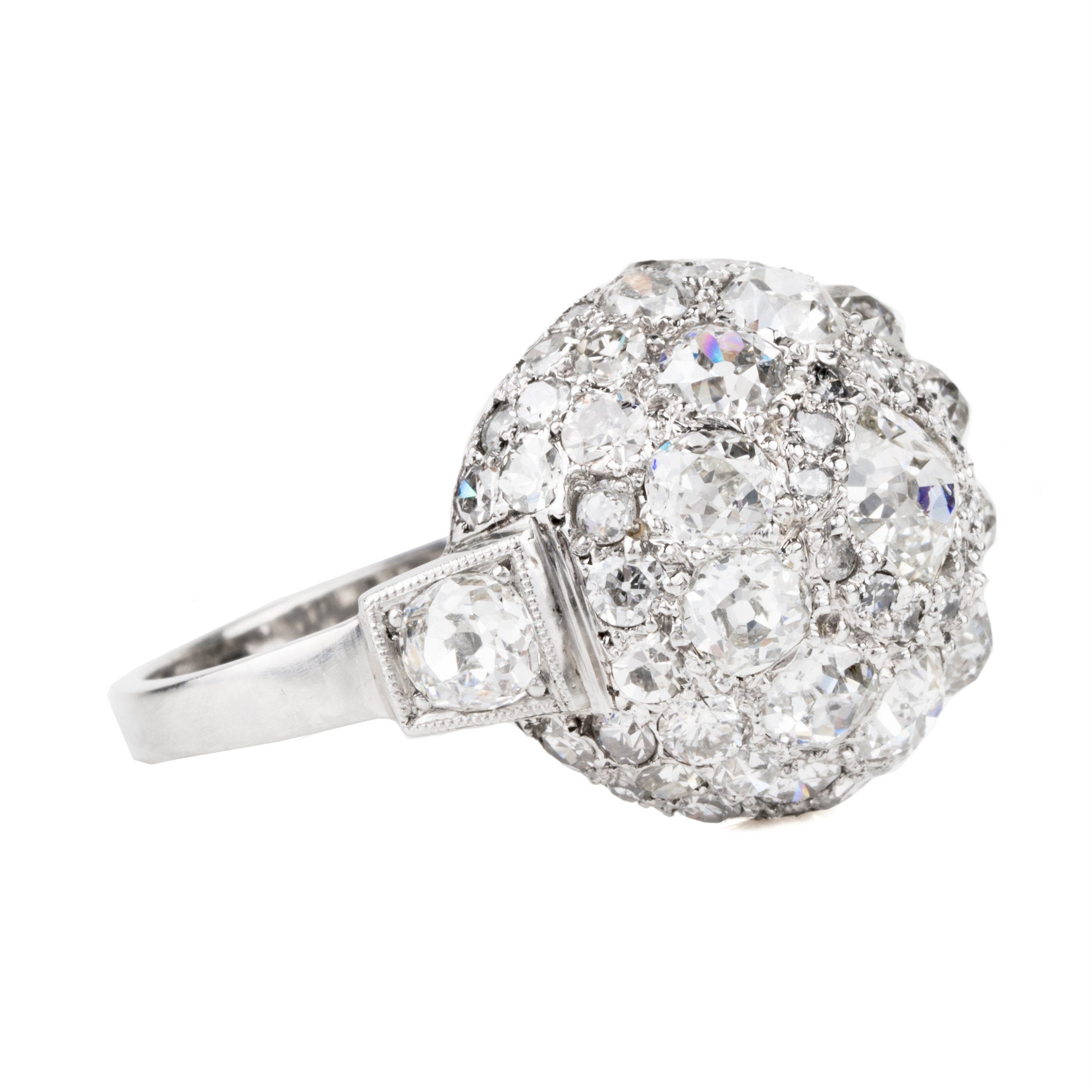 This platinum ring was made in the mid-20th century, likely after World War II in the late 1940s. The stones are from an earlier time. There are an estimated 4.5 carats in total weight made up of a mixture of old mine-cut diamonds and old European-cut diamonds set in a dramatic dome shape. America, circa 1945.