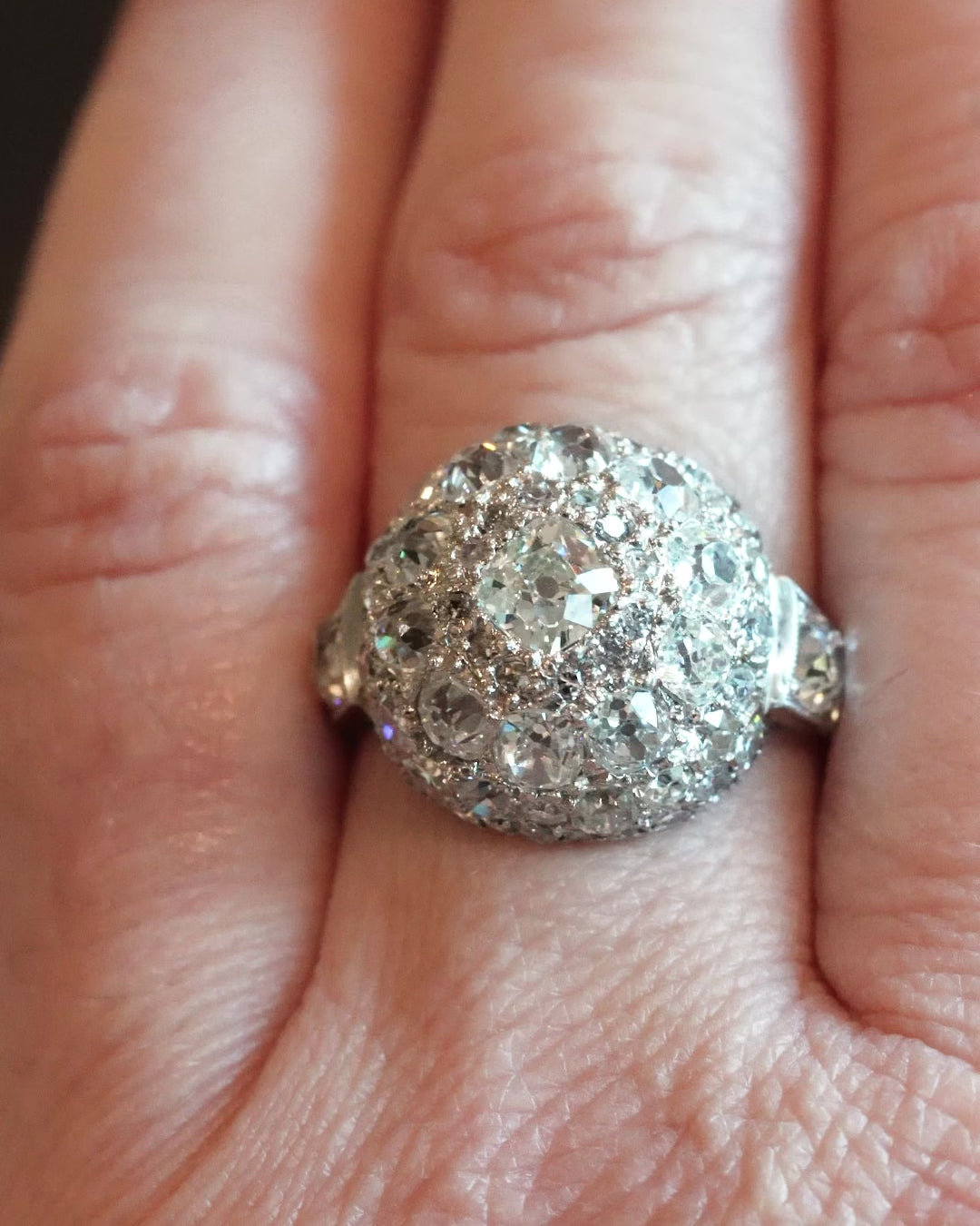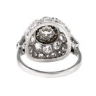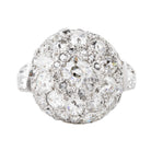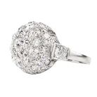 This platinum ring was made in the mid-20th century, likely after World War II in the late 1940s. The stones are from an earlier time. There are an estimated 4.5 carats in total weight made up of a mixture of old mine-cut diamonds and old European-cut diamonds set in a dramatic dome shape. America, circa 1945.
