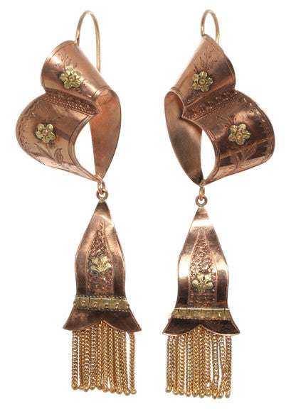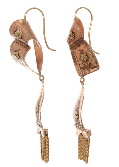 Long ribbon drops dating to 1860/70. English in origin. 15k multi colored gold. Forget-me-not flower detail is a Victorian era symbol of true and lasting love.