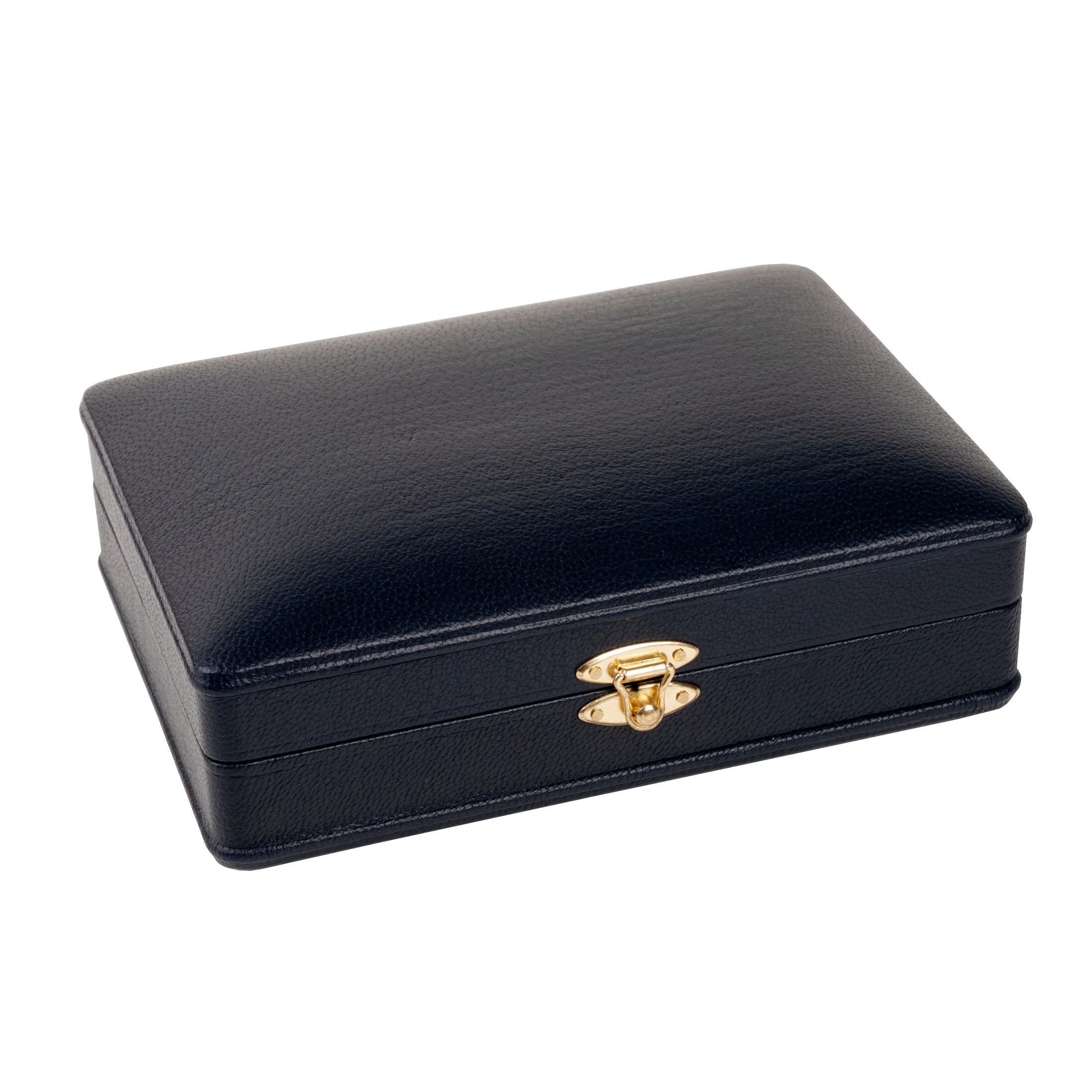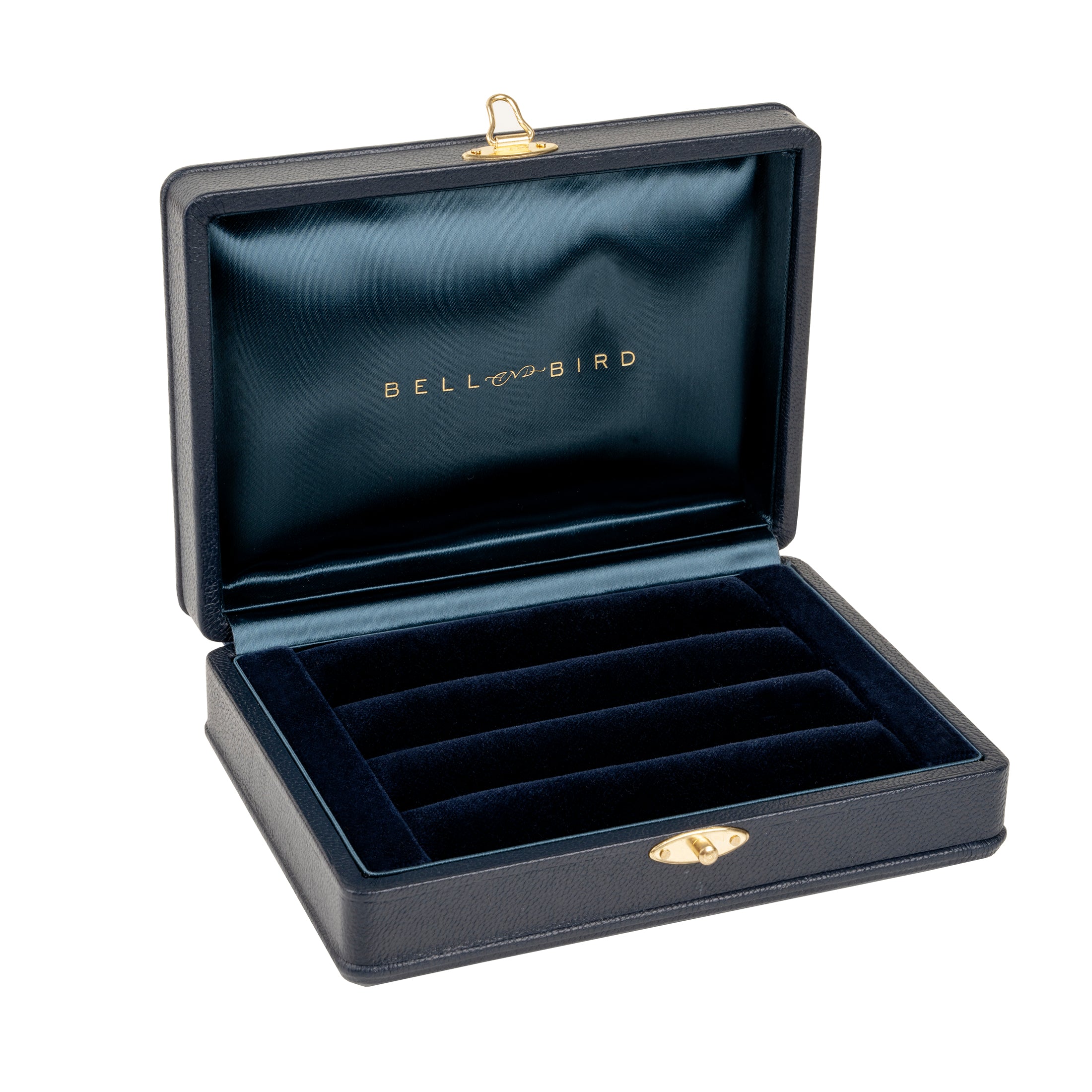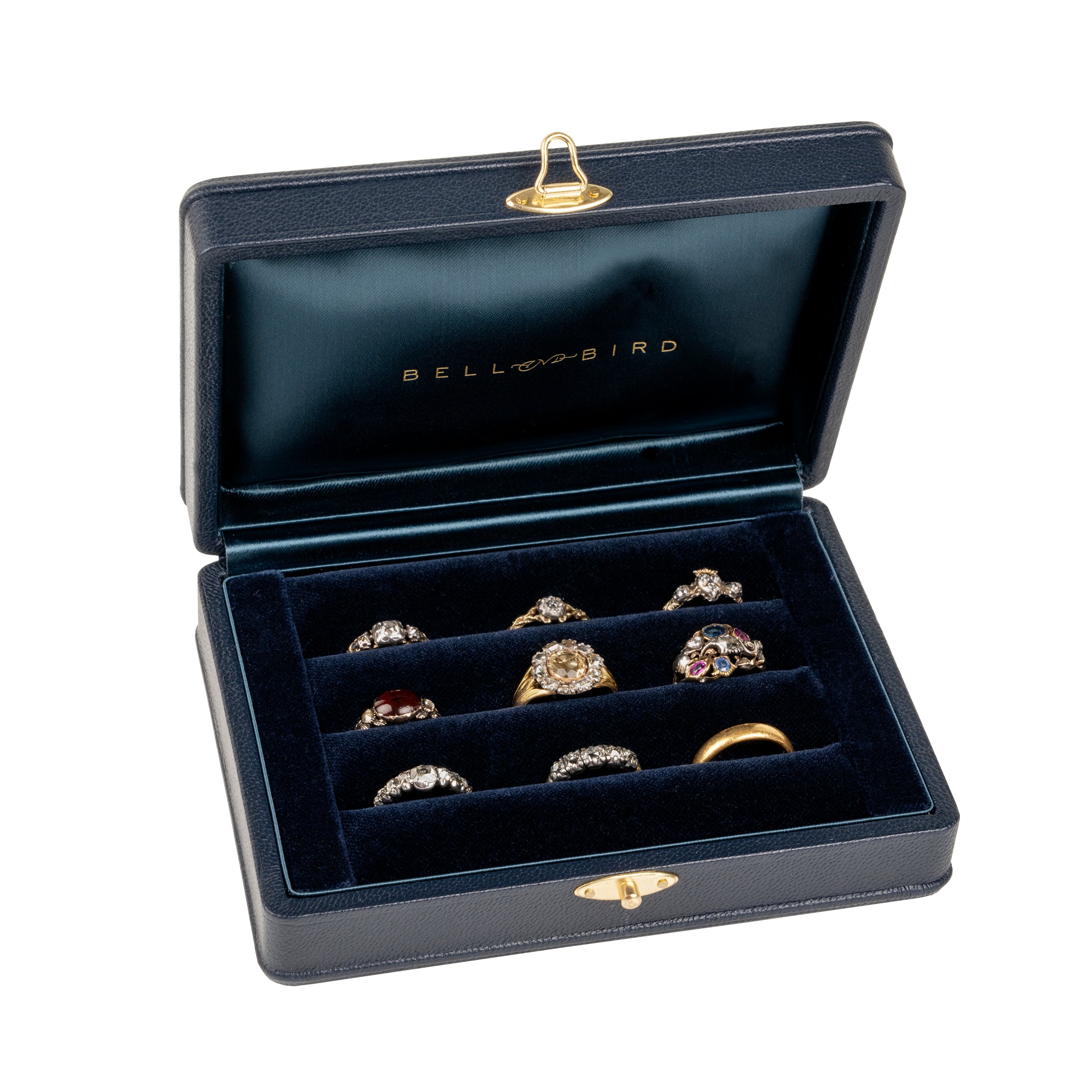 House your curated collection in this stunning ring collection case. Small enough to travel and perfect for the safe. The three row ring holder can safely store 9 rings. Made with blue lamp leather, blue silk, blue velvet interior, and brass closure.