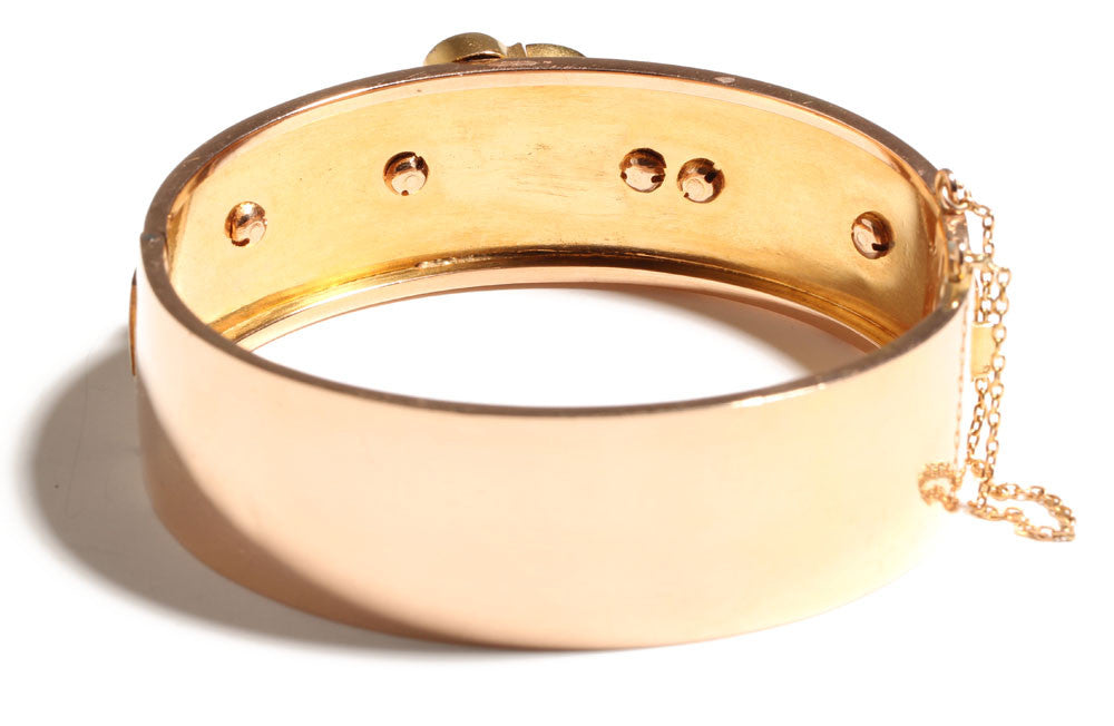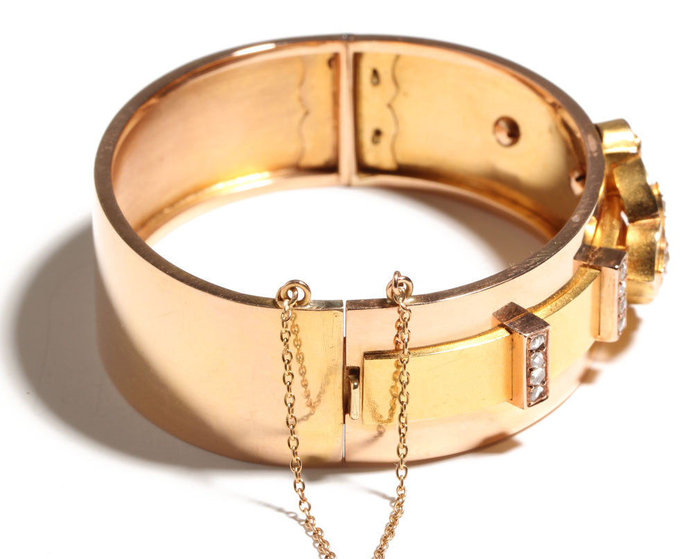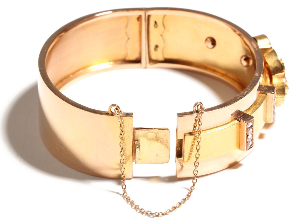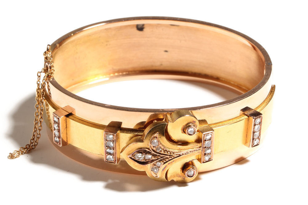 Fleur-de-lis design with sparkling rose cut diamonds all set in bright mercury gilded gold. The rest of the bangle is done in a nice pink rose gold.