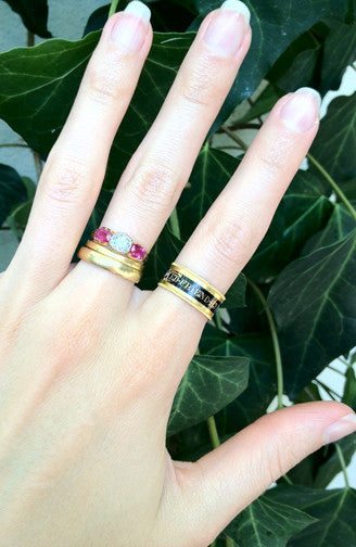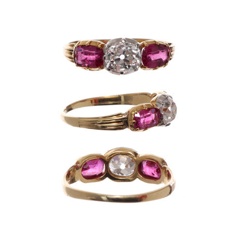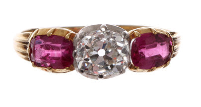 Circa 1840-1850 English ruby and diamond ring set in 15k gold.Size 6.25, can be sized. Pictured on model with our antique plain gold bands (available in-store only) and model’s own bell and bird antique mourning ring.