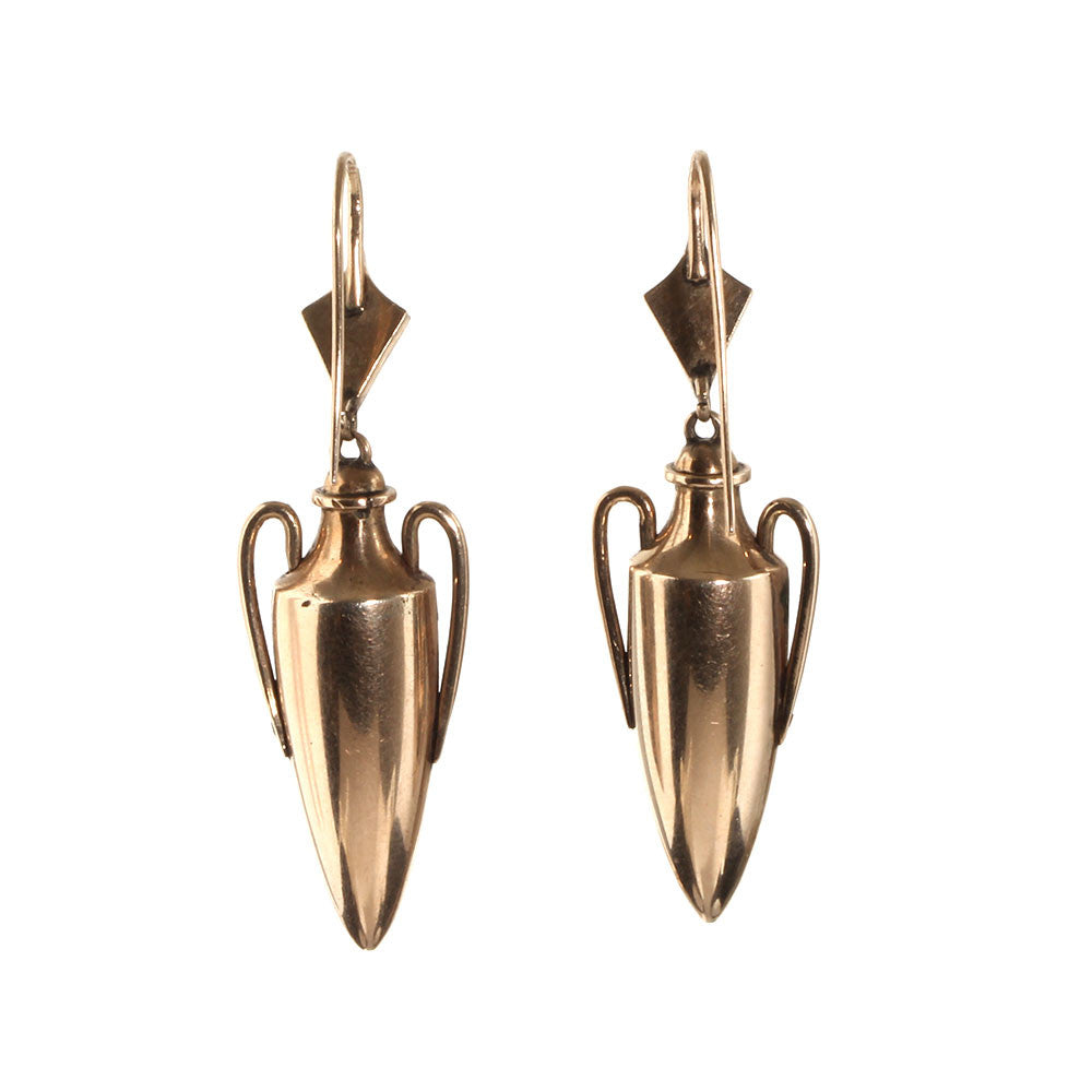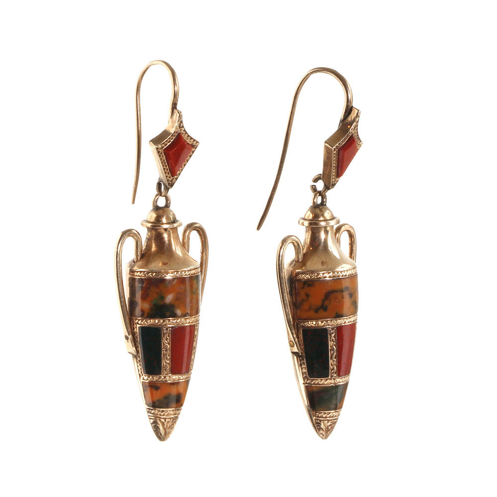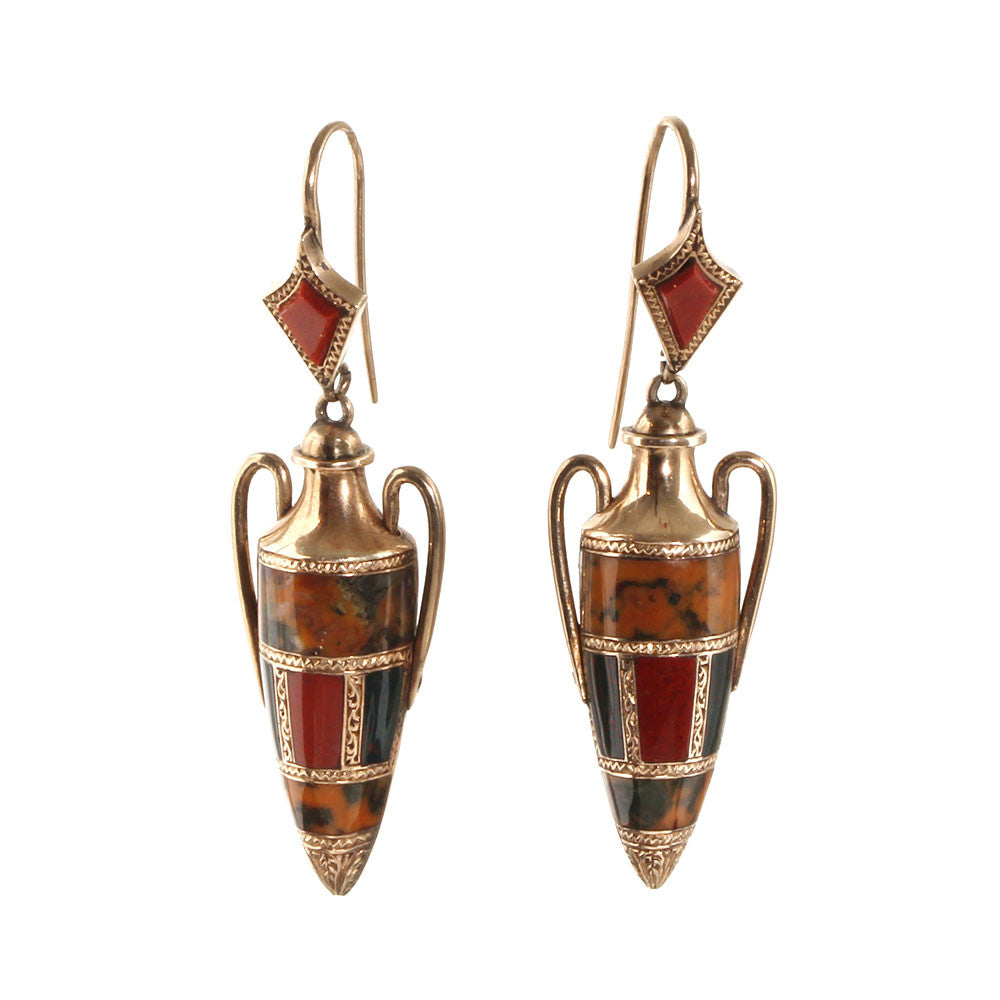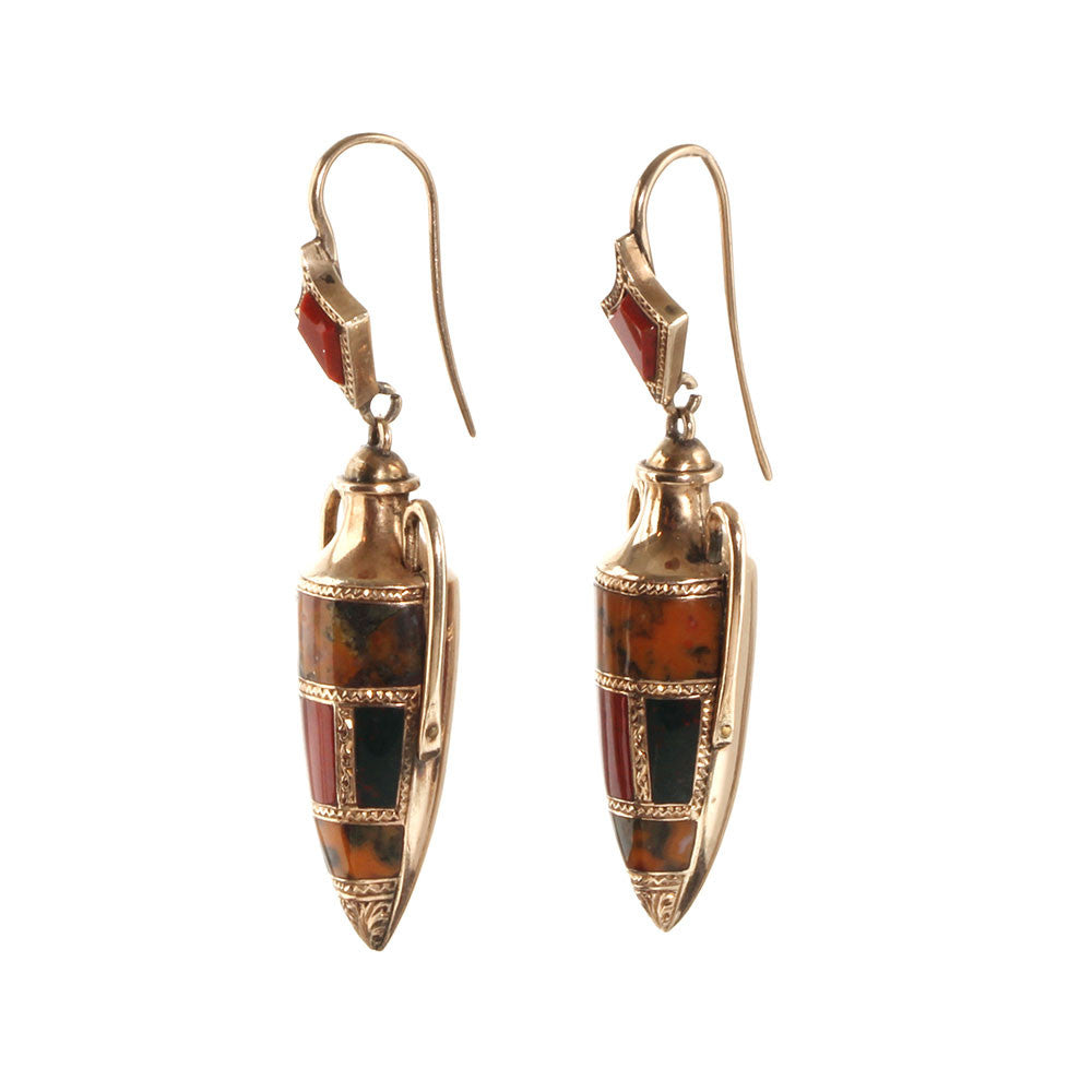 Victorian era amphora drop earrings in 15k rose gold with scottish agate stones. It is unusual to find the scottish agate stones in gold, they are more typically found in silver.