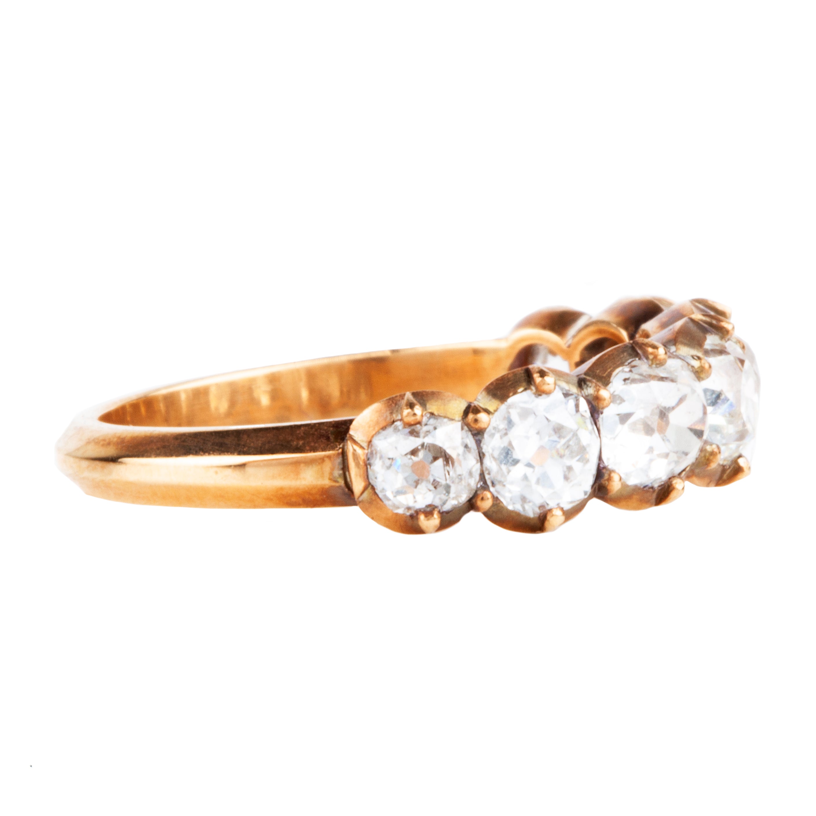 Featuring 7 antique old mine cut diamonds totaling 1.98 carats. Set in our 18k "old" gold. The inspiration for this signature B&B design is the labor-intensive cut-down setting technique common in 18th and 19th-century diamond jewelry. The production of these rings takes many months of collecting antique stones as each stone must match in color, clarity, and size.