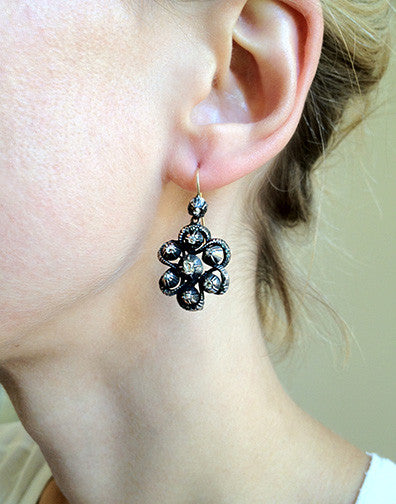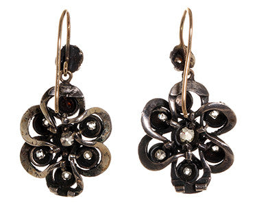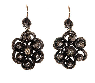 19th century diamond earrings set in silver with gold backs. Old mine cut diamonds in open back settings.