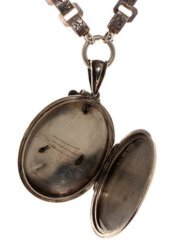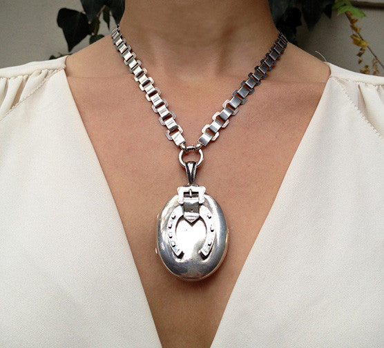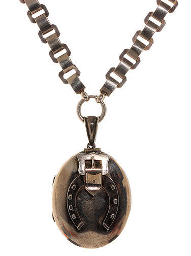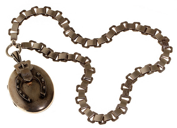 Sterling locket with horseshoe and buckle details hanging on sterling book chain. Both Circa 1870/80. English in origin.