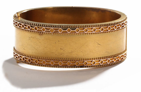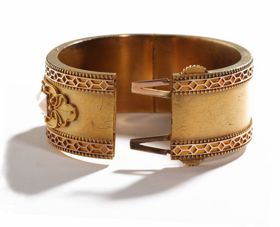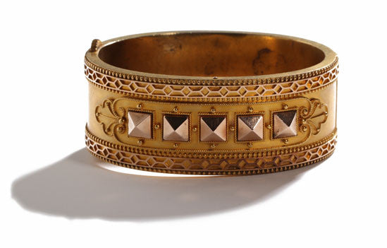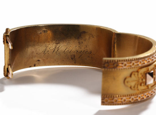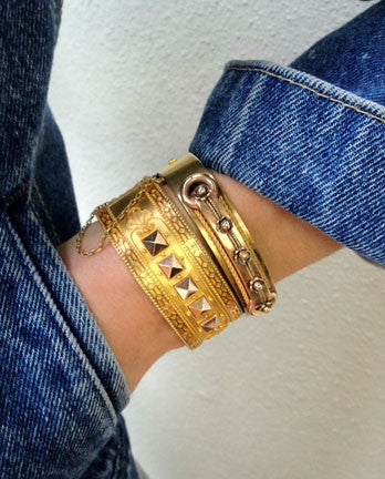 By the 1850s bracelets had become an indispensable accessory. Up to seven or eight of differing design might be worn between the wrist and elbow on both arms. Alternatively they could be worn in pairs and even over gloves.