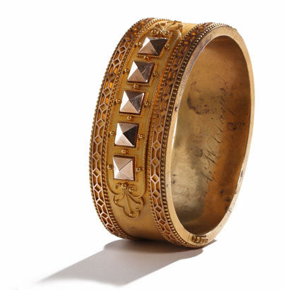 Striking Victorian gold bangle in 18k bloomed gold with rose gold accents. Engraved A.W. Clayes Circa 1850/60