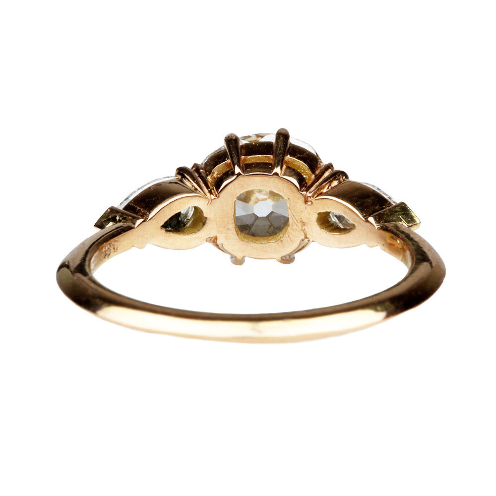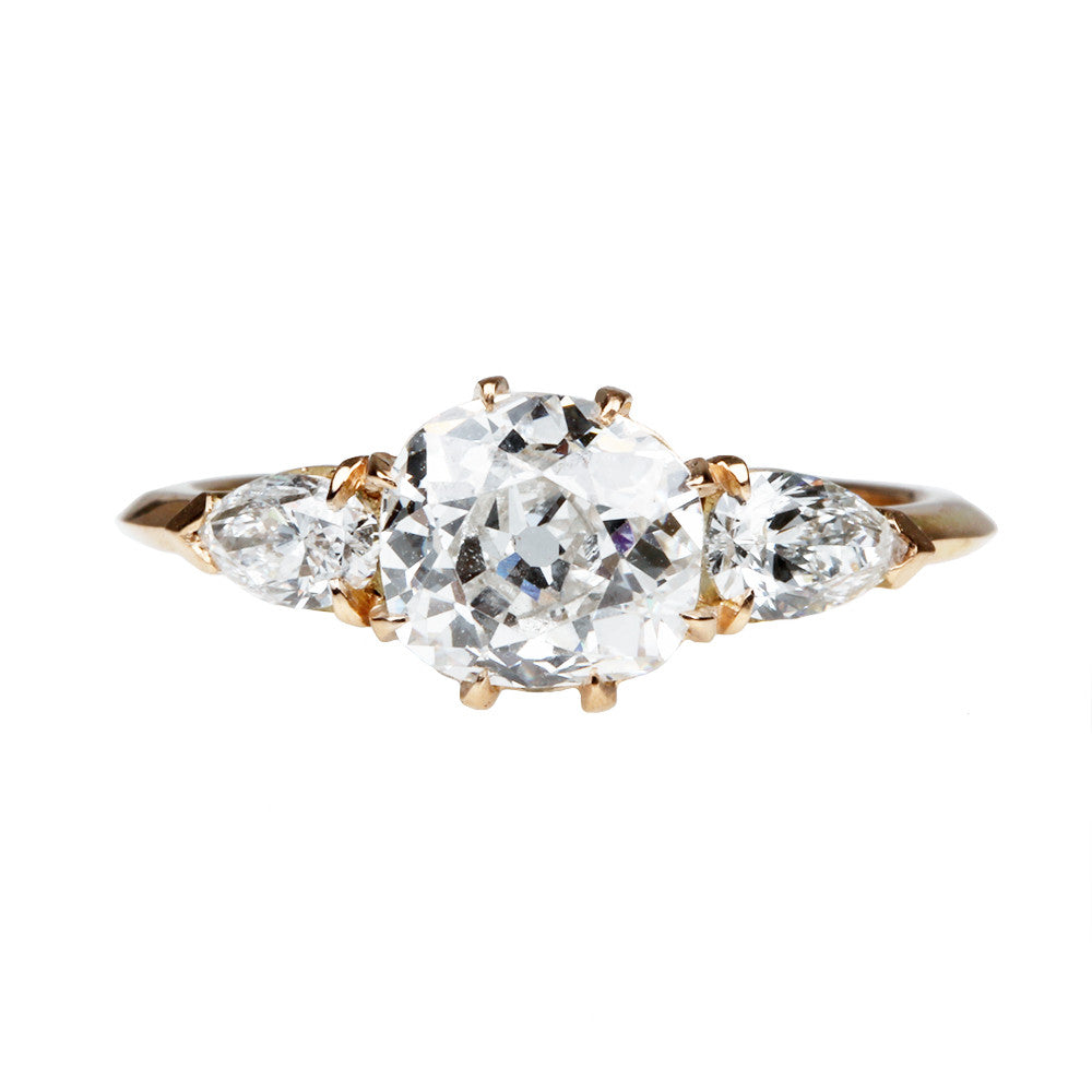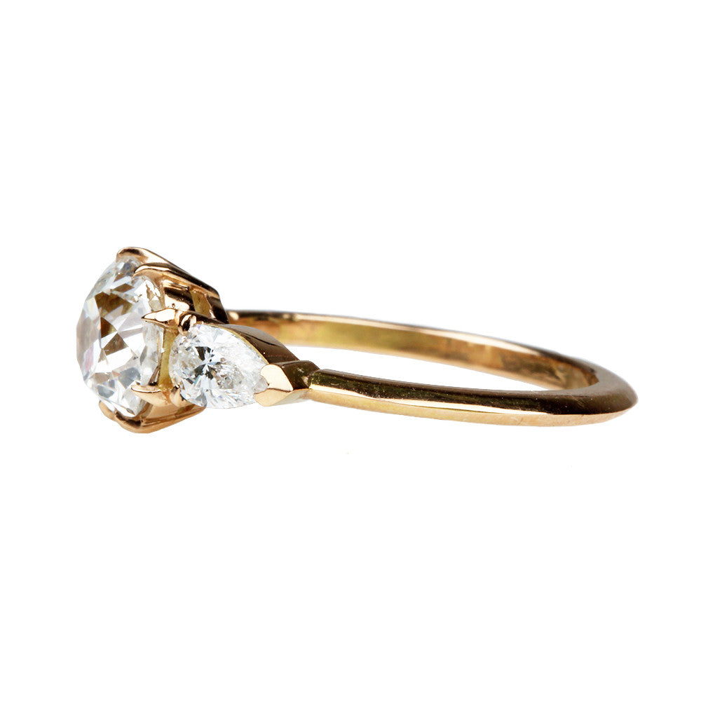 Classic three stone diamond ring with an antique old mine cut center stone flanked by two pear shaped stones. Handcrafted in our 18k old gold and featuring a knife edge band. This example features a cushion shaped antique old mine cut diamond of 1.4 carats with an additional .3 carats for each side stone, making 2 carats of total weight.