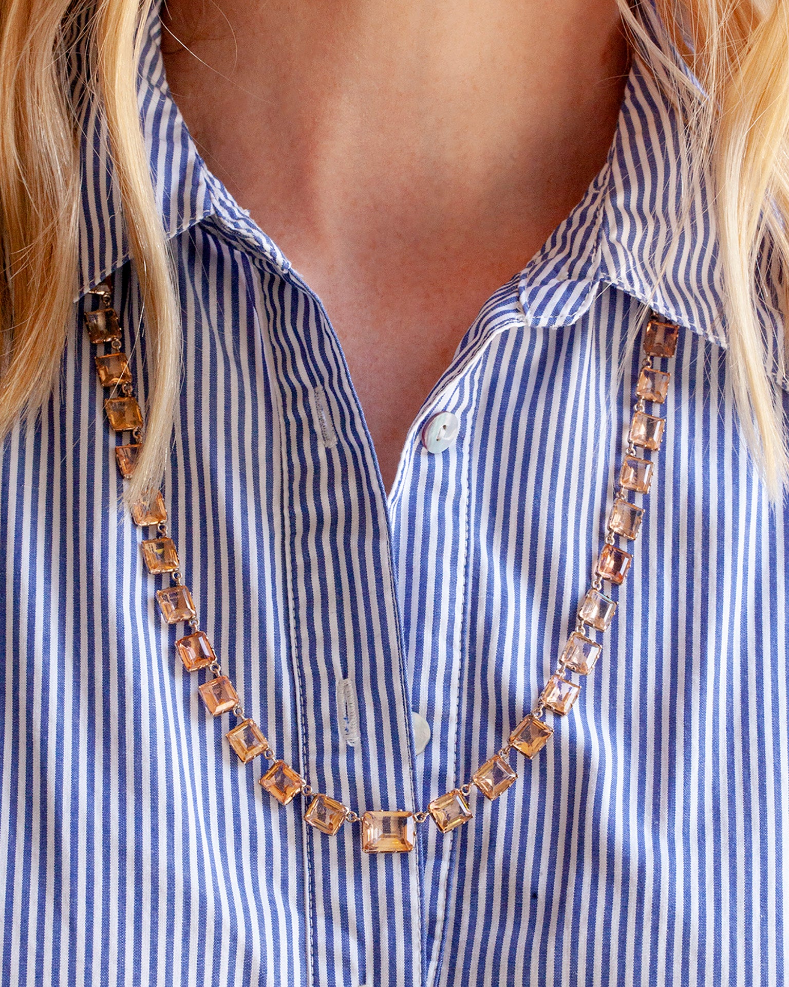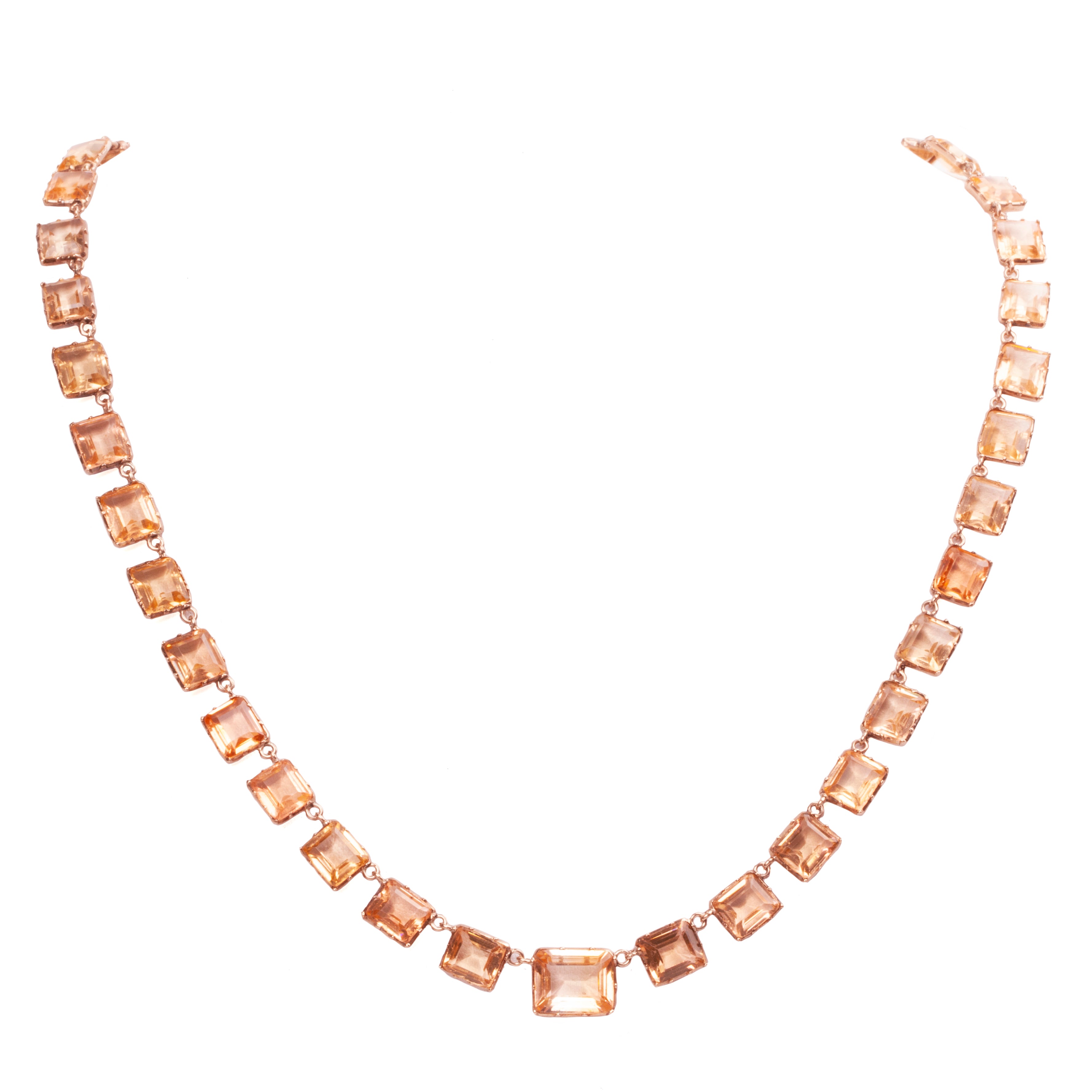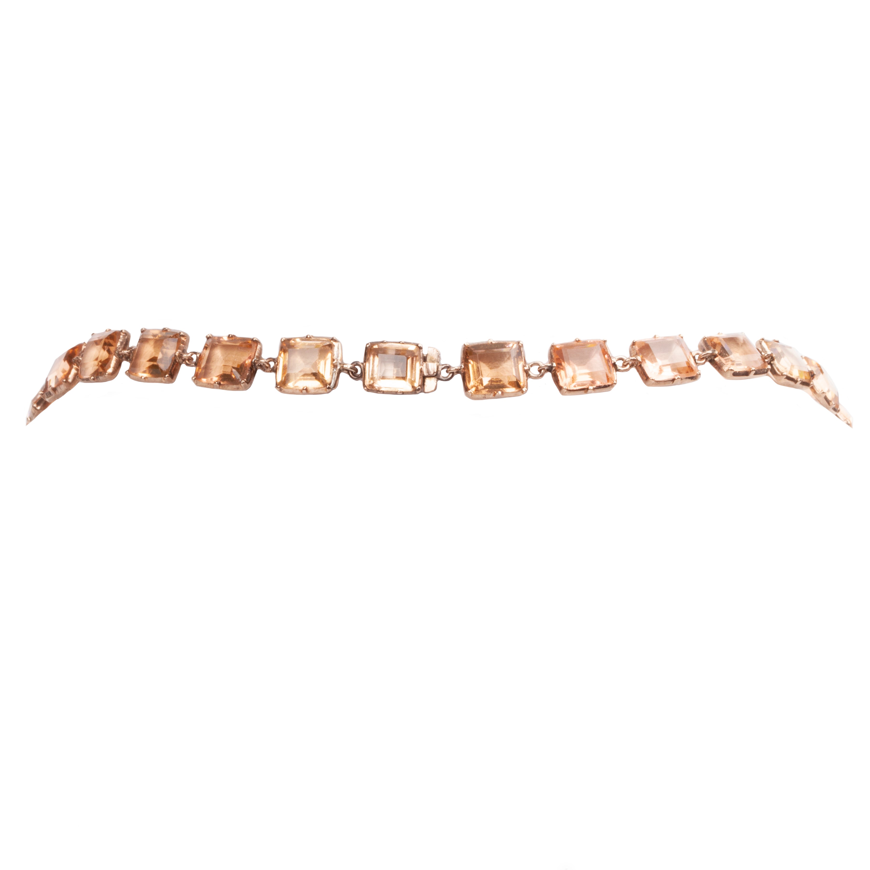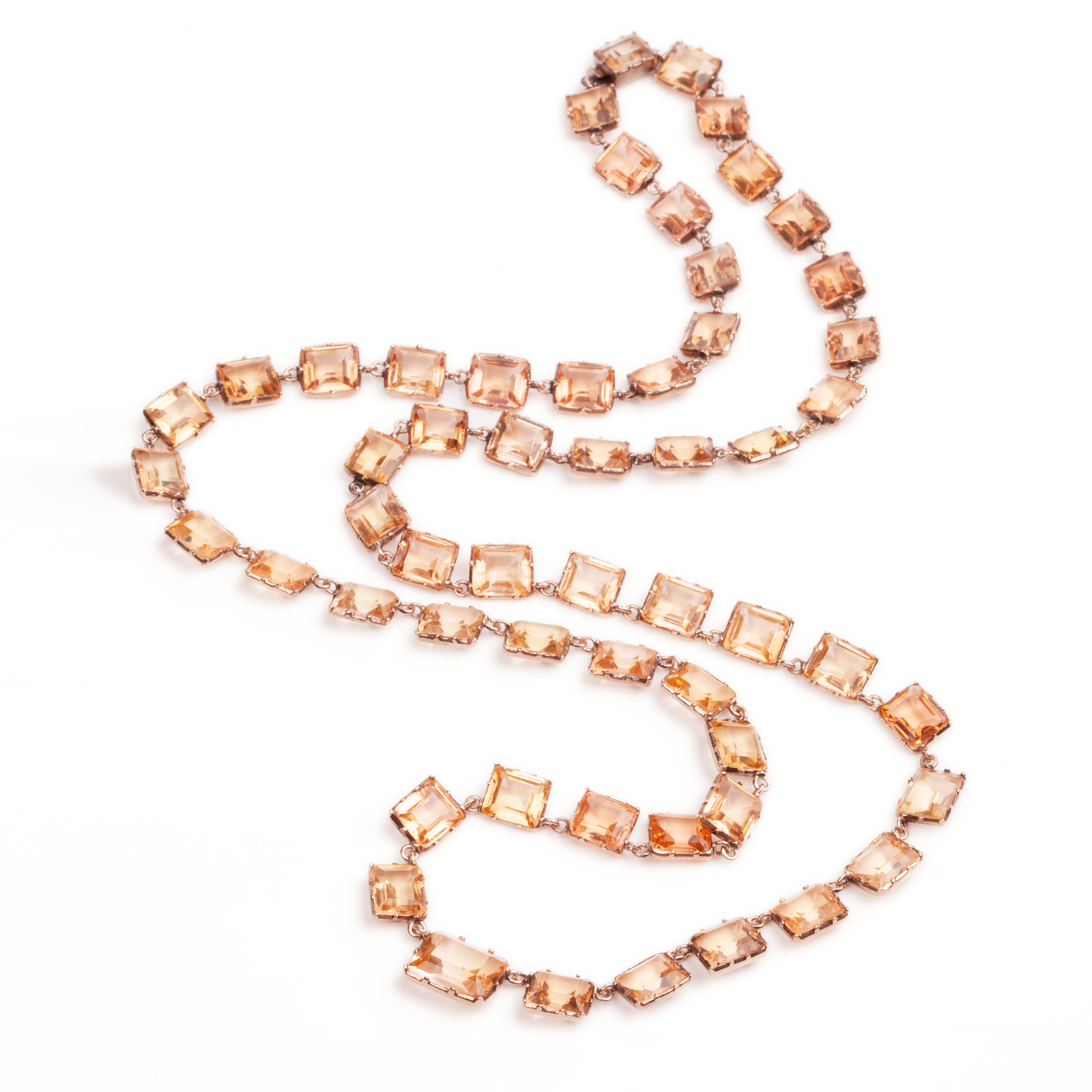 Victorian topaz paste long necklace. Cushion shaped topaz paste set in 9k gold frames. Originally a bracelet and necklace, later converted into a longer necklace. English in origin. Circa 1850.