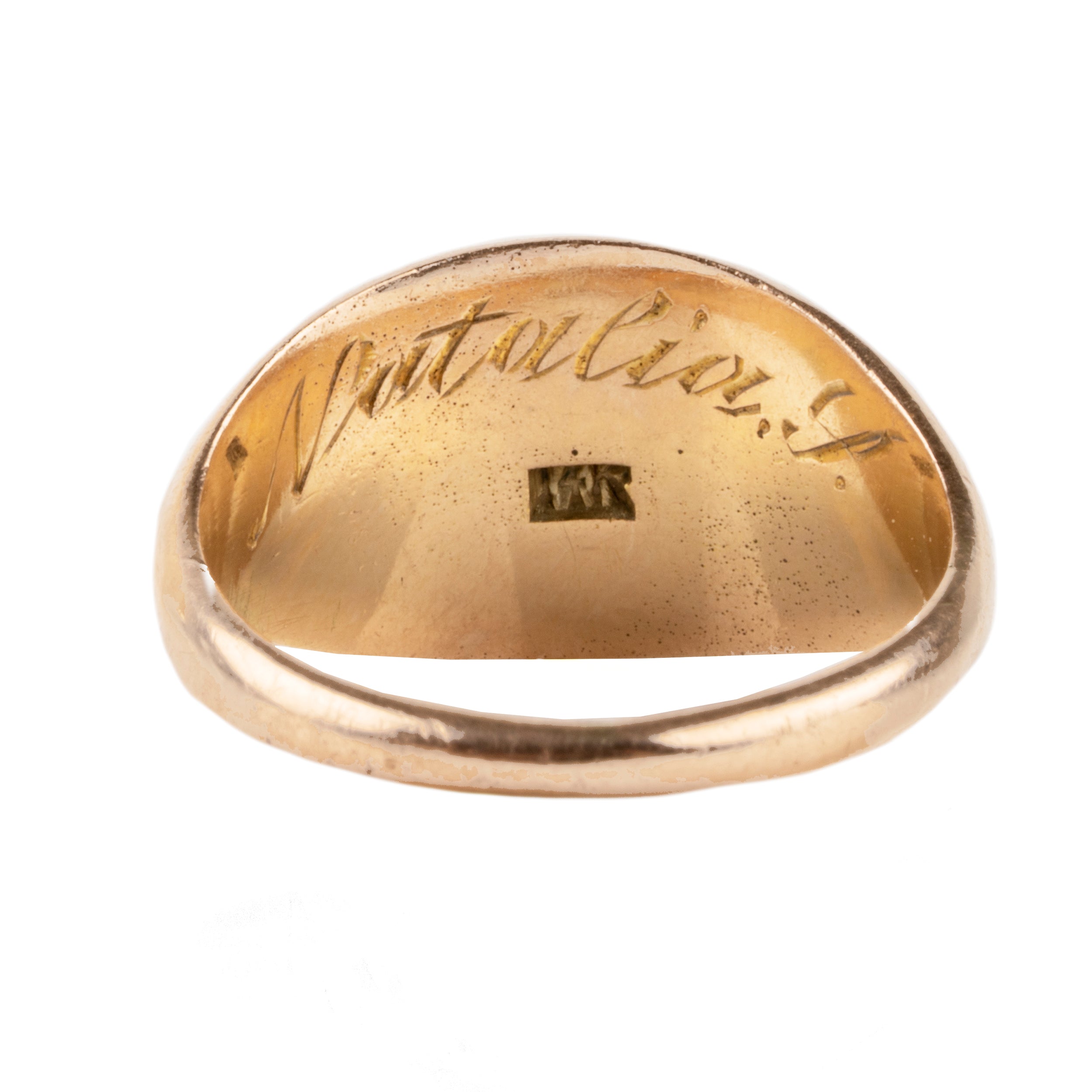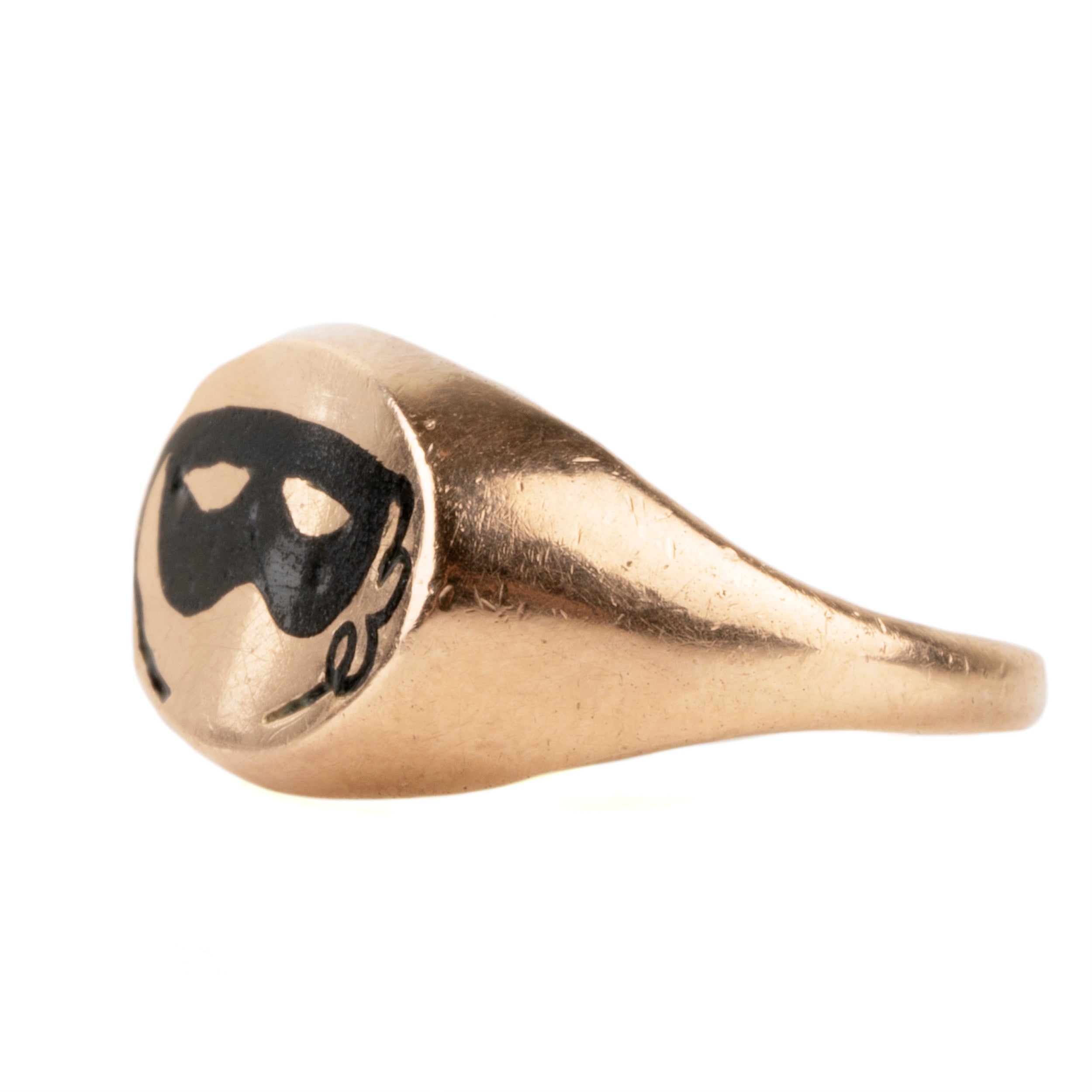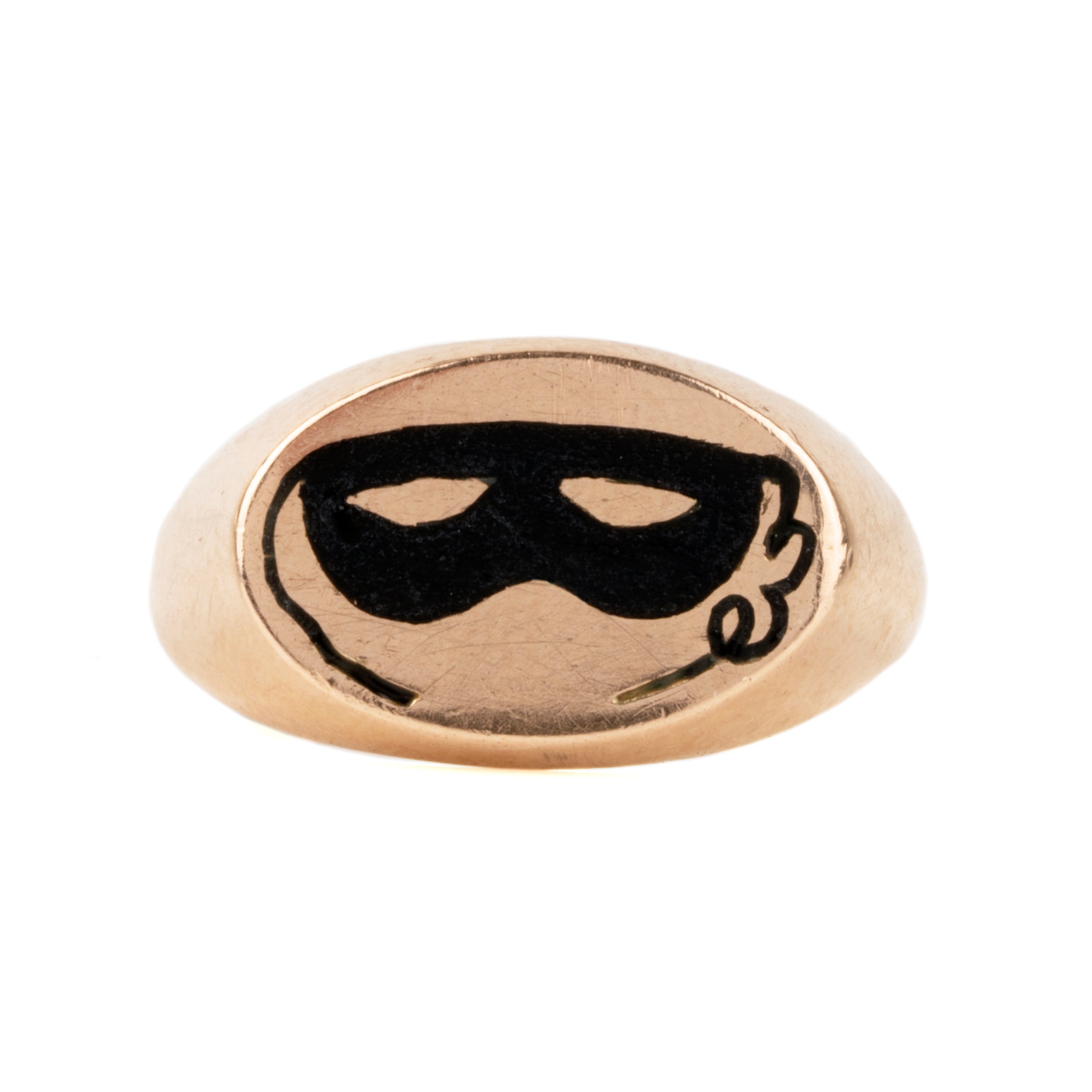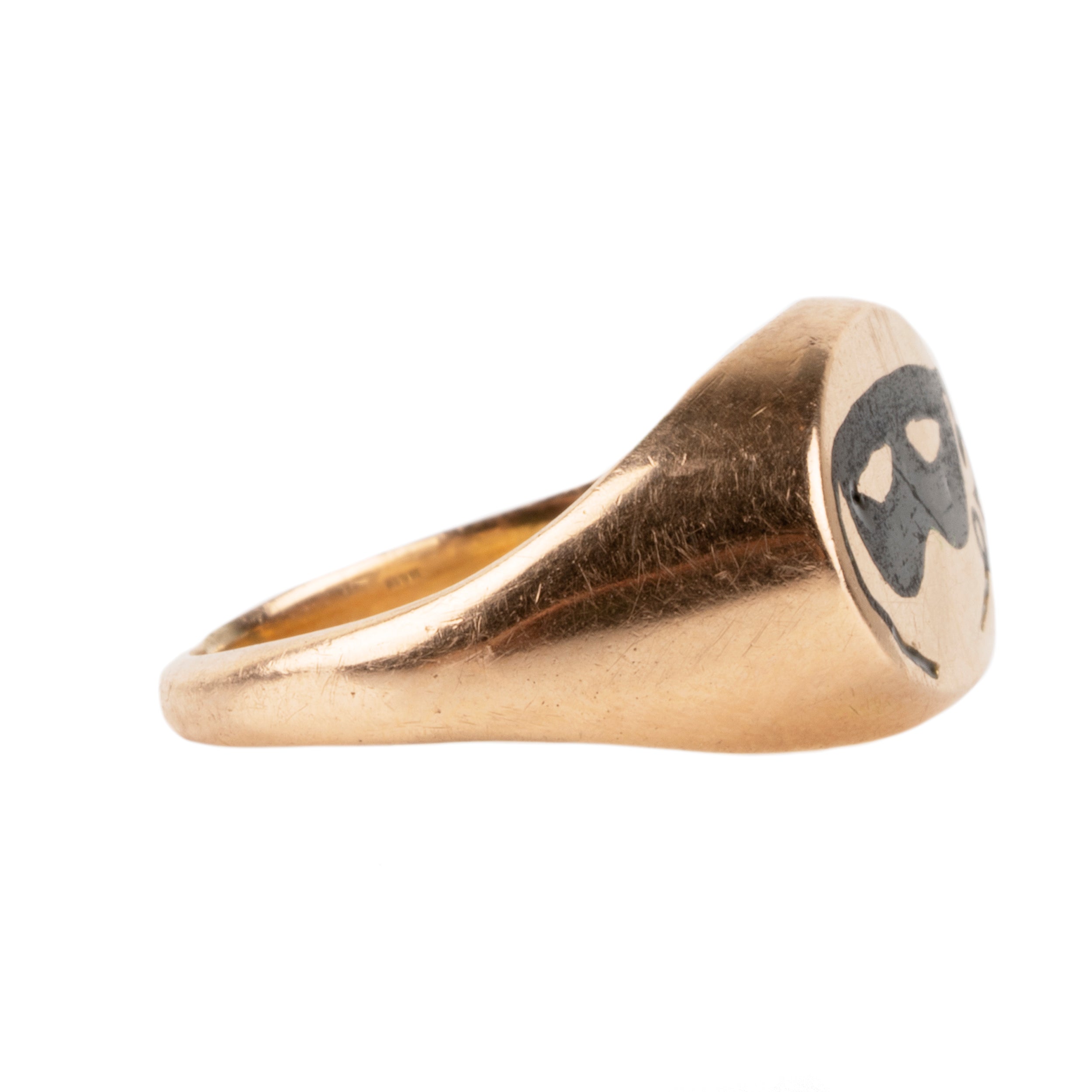 Turn of the century black enamel and gold signet, 14k rose gold. Black enamel mask motif. In a Georgian revival style. Interior hand engraving 'Natalia P.' Circa 1900.