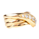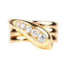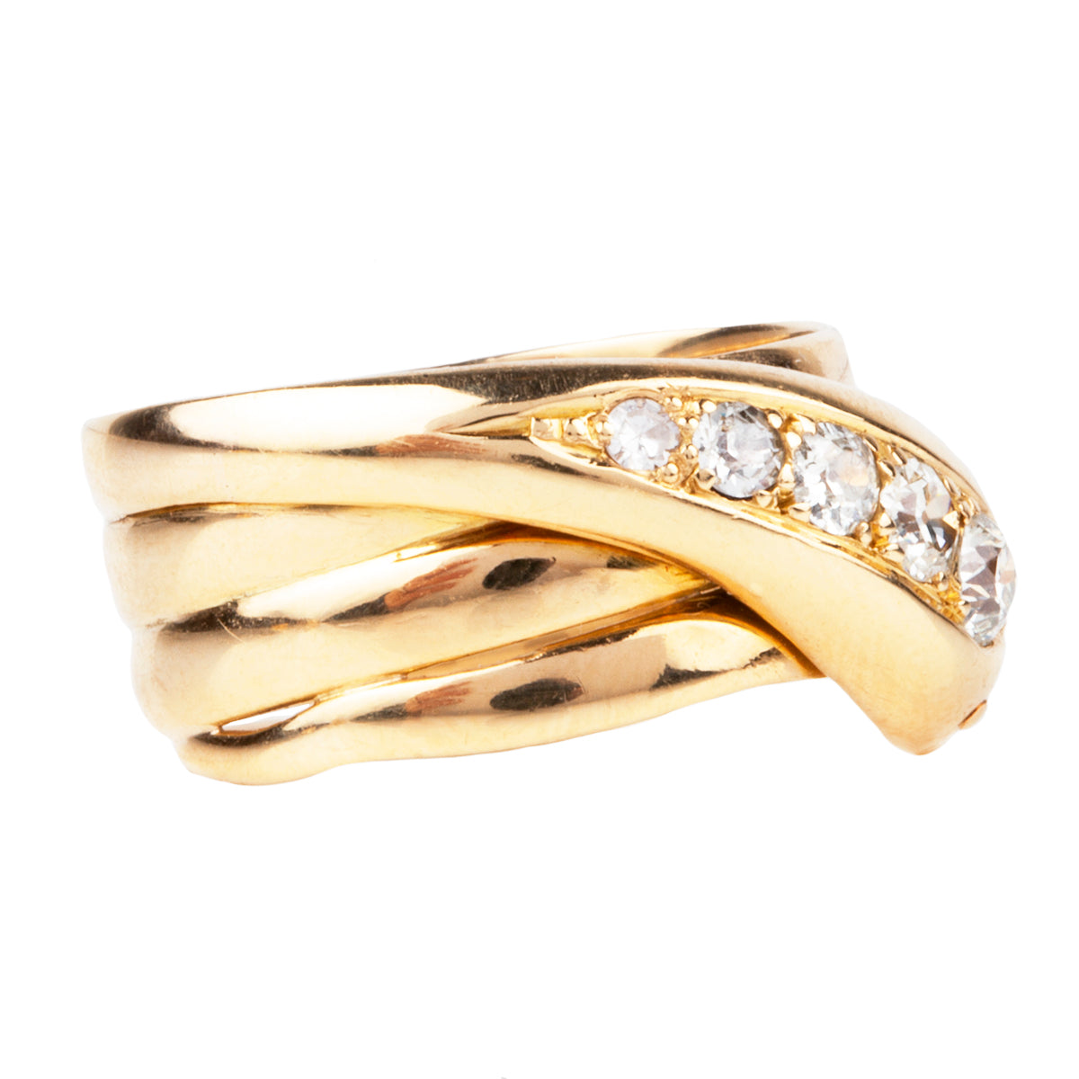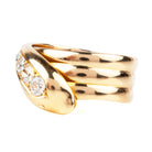 Bold snake ring coiling three times around the finger crafted in 18k gold. Five graduated old European cut diamonds are set in the head. London hallmarks for 1901.