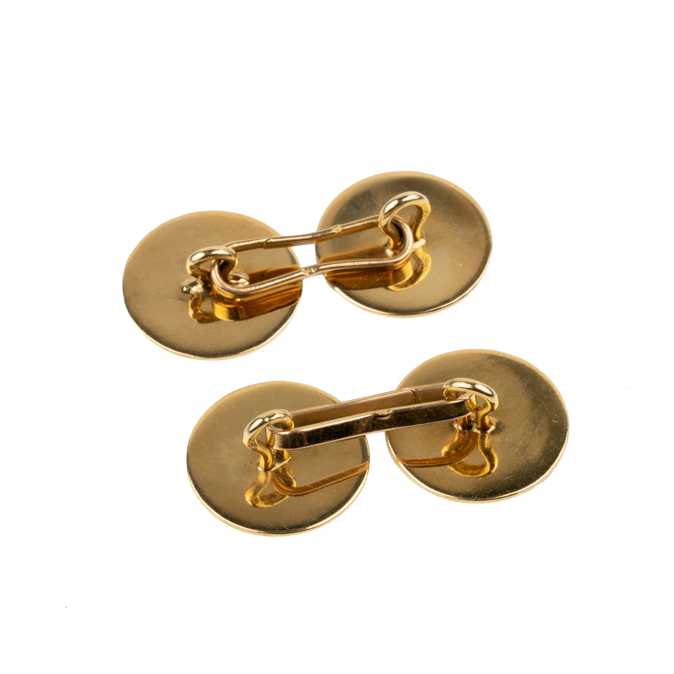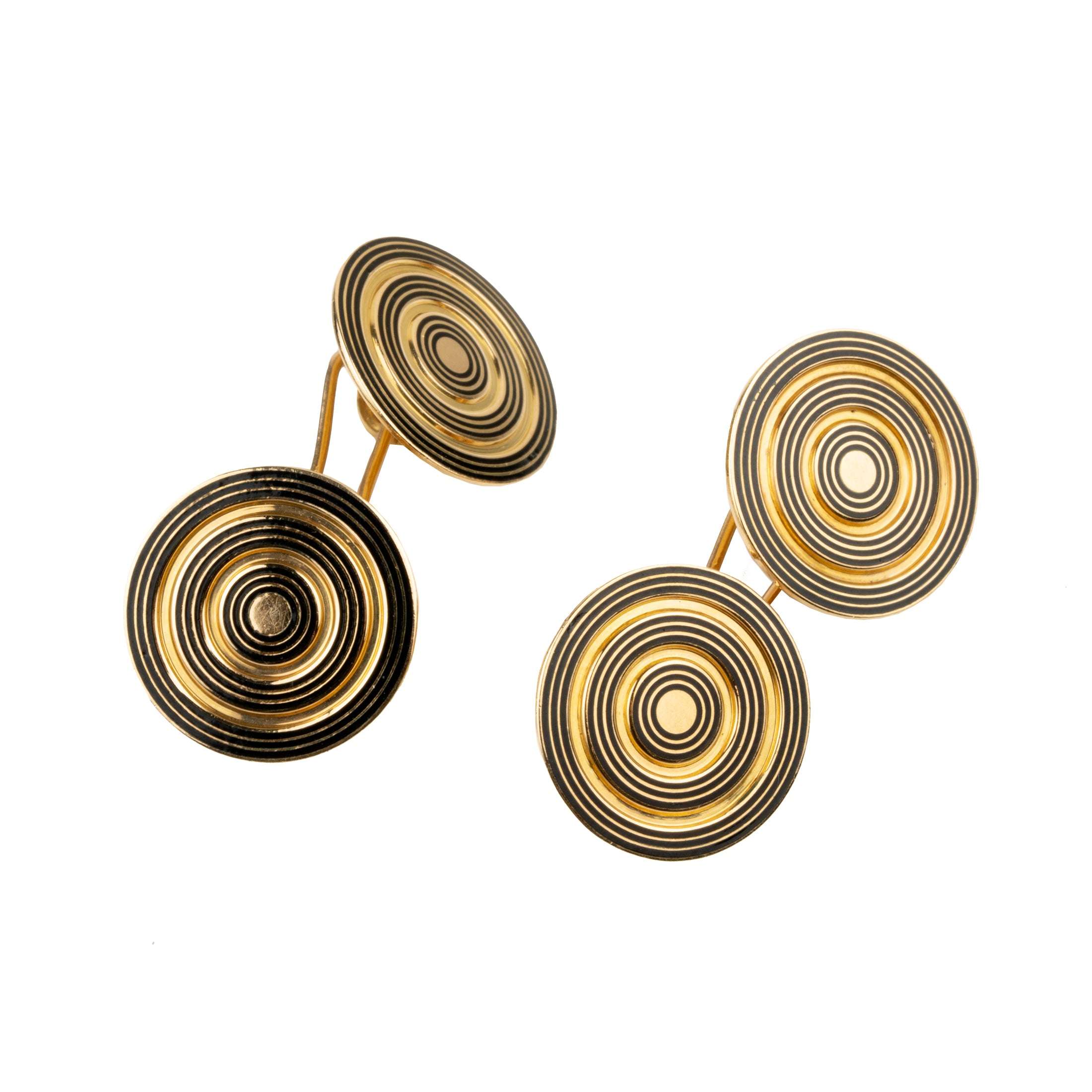 A pair of turn of the century black enamel cufflinks, in 18k gold. Striped bullseye black enamel design. French hallmarks. Circa 1900.