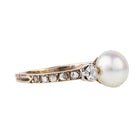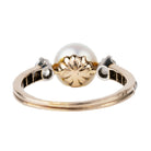 A beautifully made platinum and 18k gold ring. A single bright white round pearl is set between an unusual asymmetric arrangement of eight rose-cut diamonds, three on one side and five on the other. Two additional old mine-cut diamonds flank the central stone. Size 5.5, limited sizing options. France, circa 1900