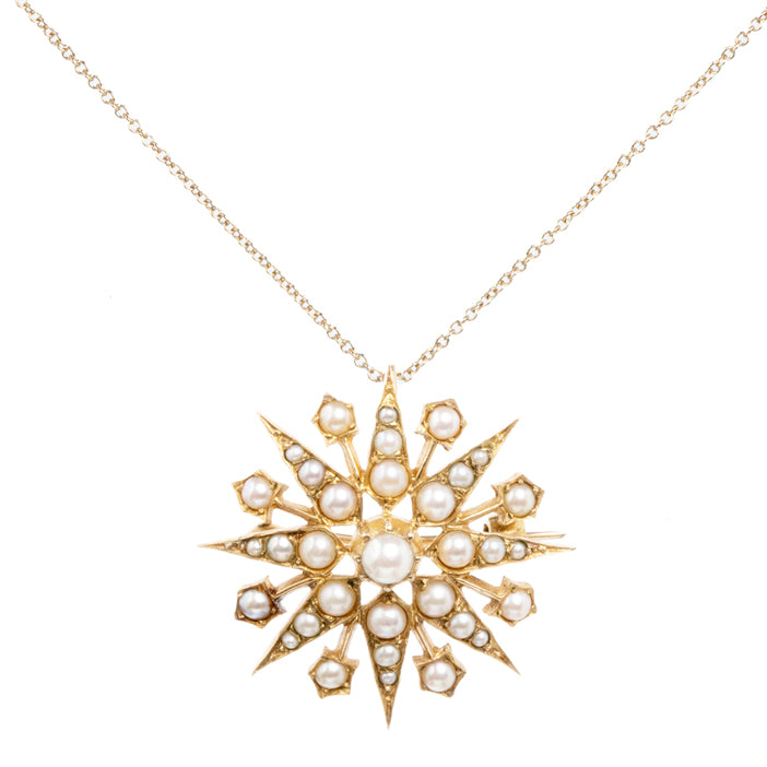 Turn of the century pearl starburst pendant and brooch, in 18k gold. The diamond starburst style had been popularised by Queen Mary. English in origin. Circa 1900.