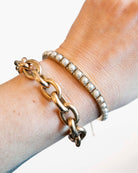 Hidden push clasp with safety chain. It measures 8" in length but would best fit a small to medium sized wrist.