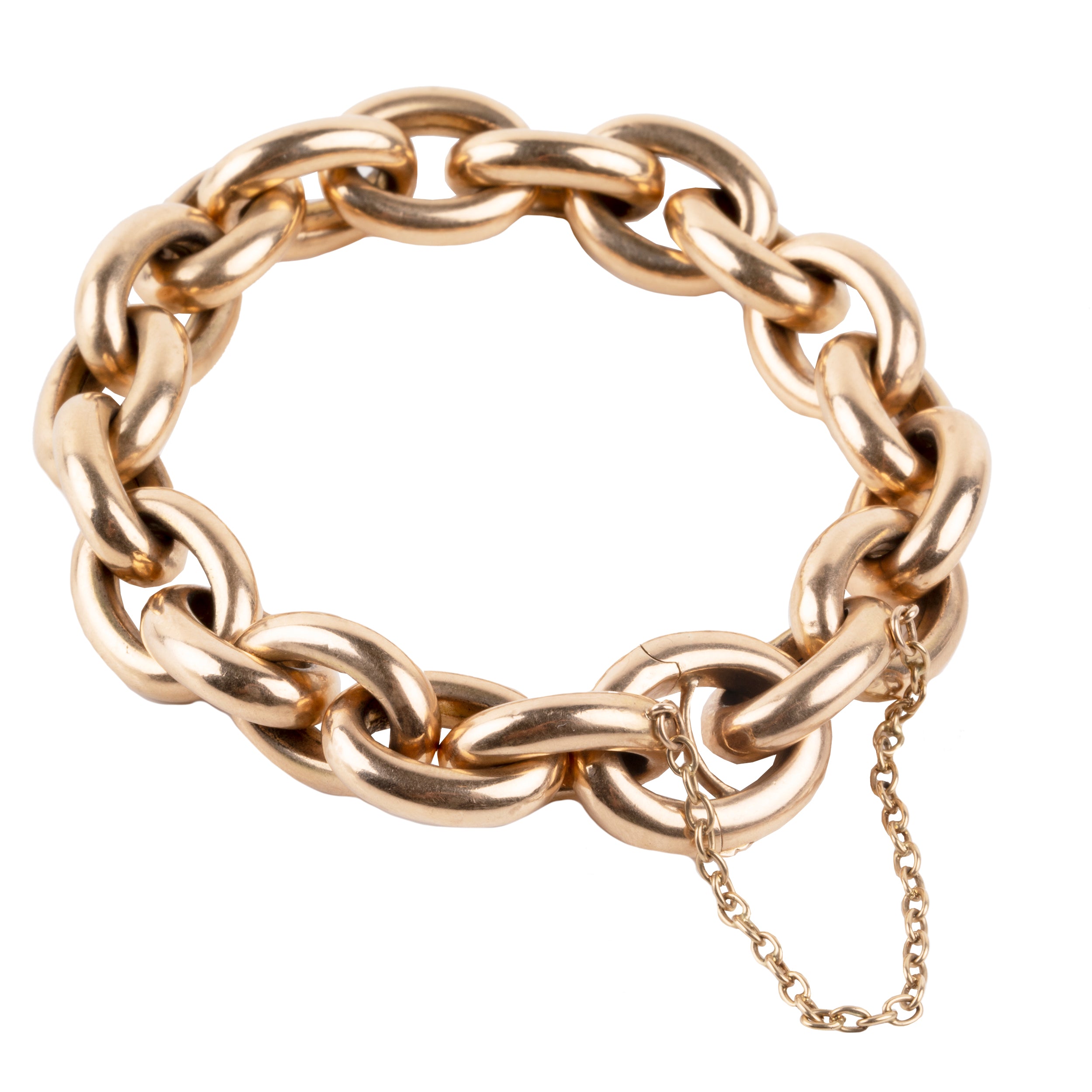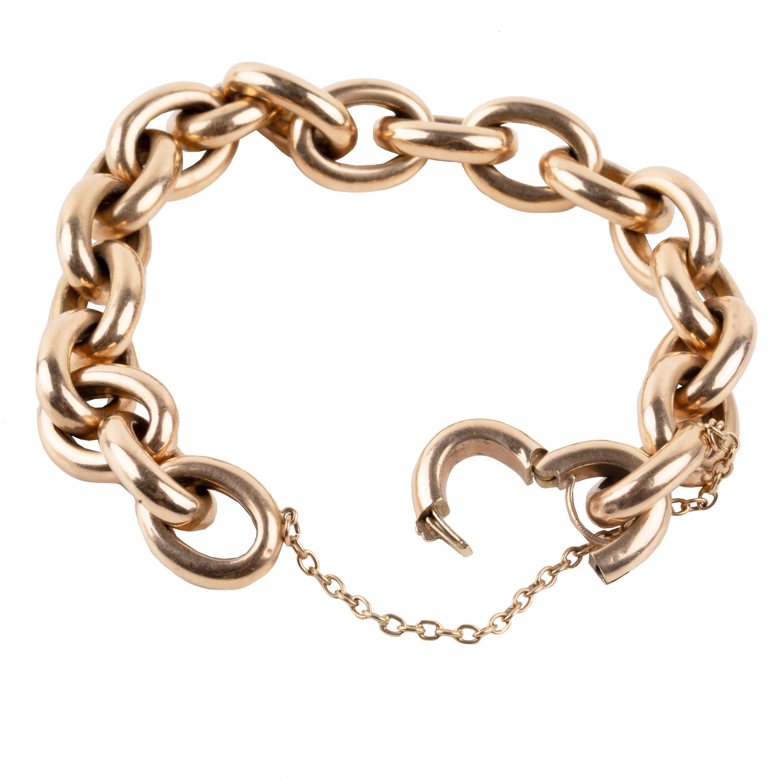 A turn-of-the-century rose gold bracelet in 15k gold. The oversized links are hollow, making the bracelet light and easy to layer. Perfect for everyday wear. A finely crafted clasp is hidden as a link. Small in size. England, circa 1900.