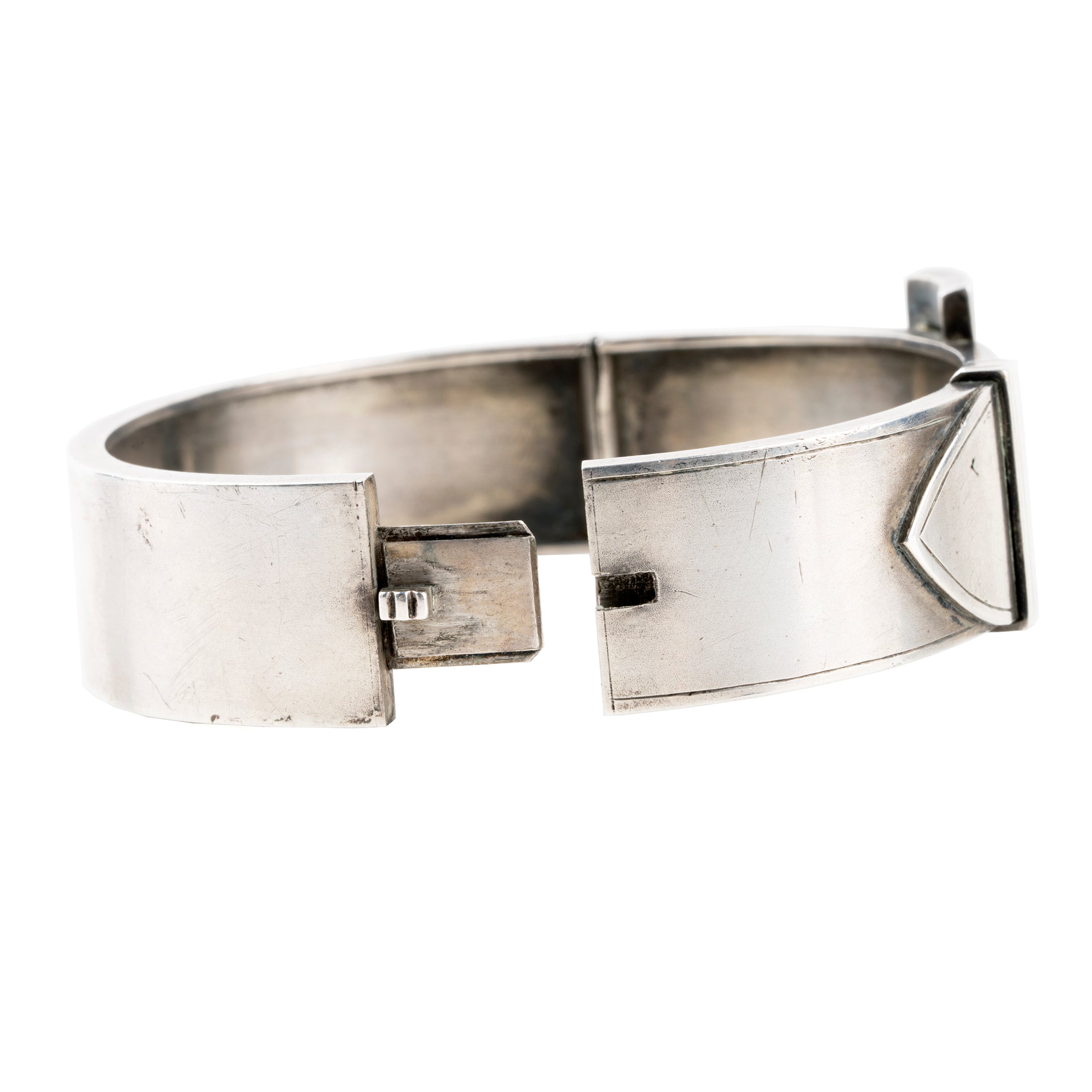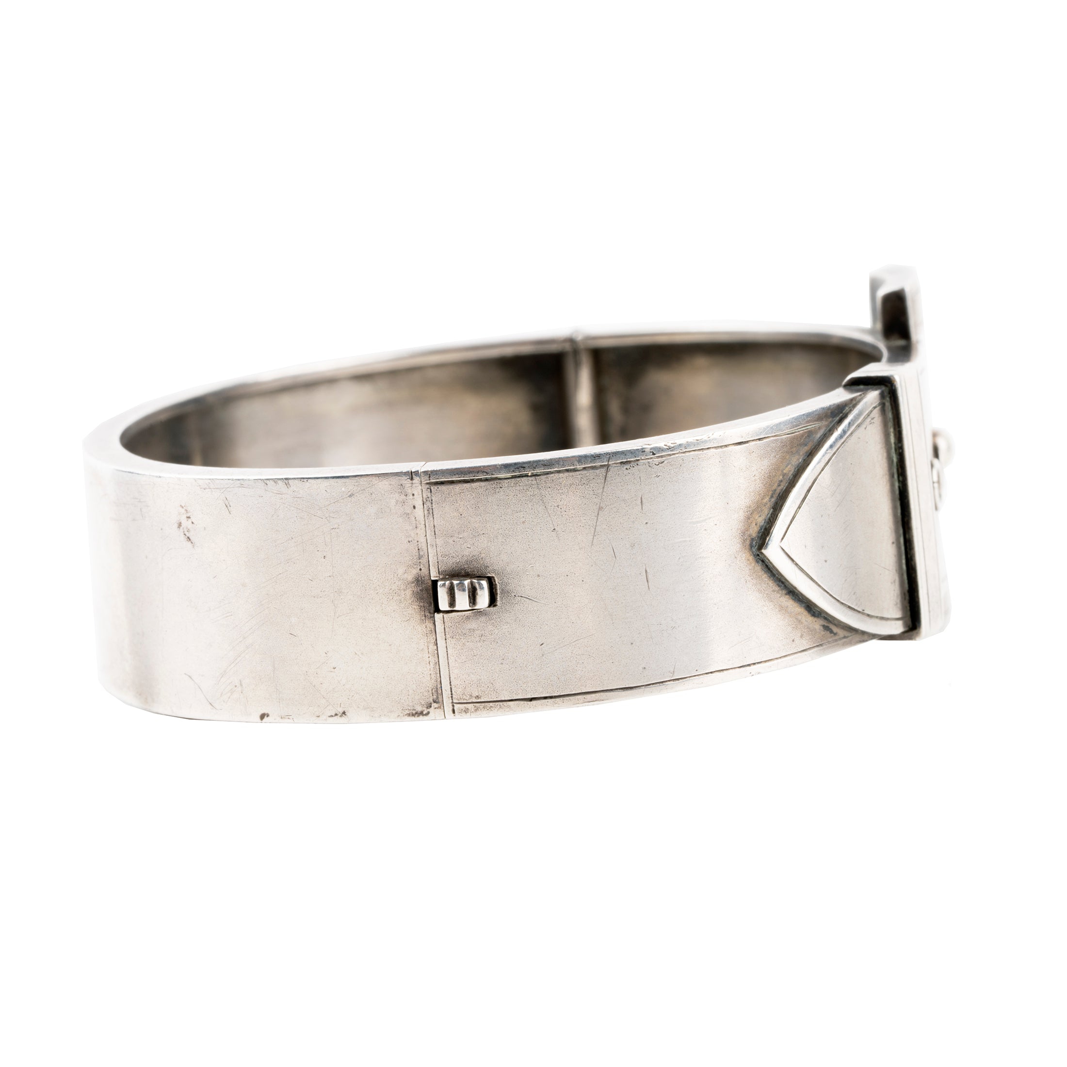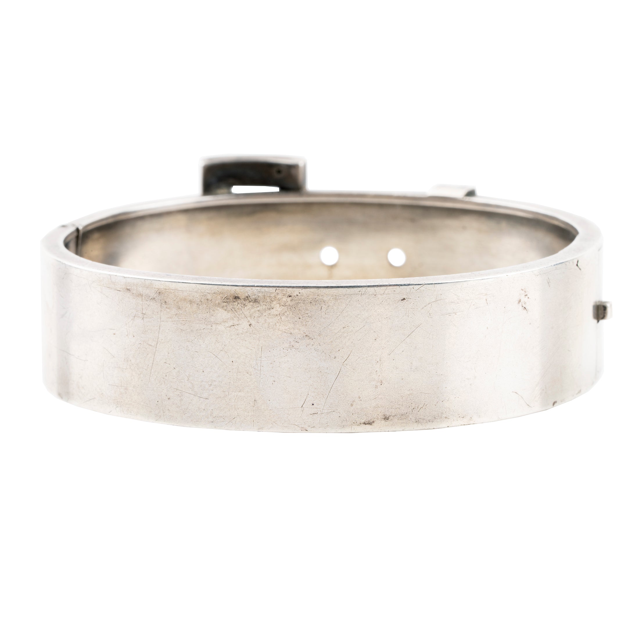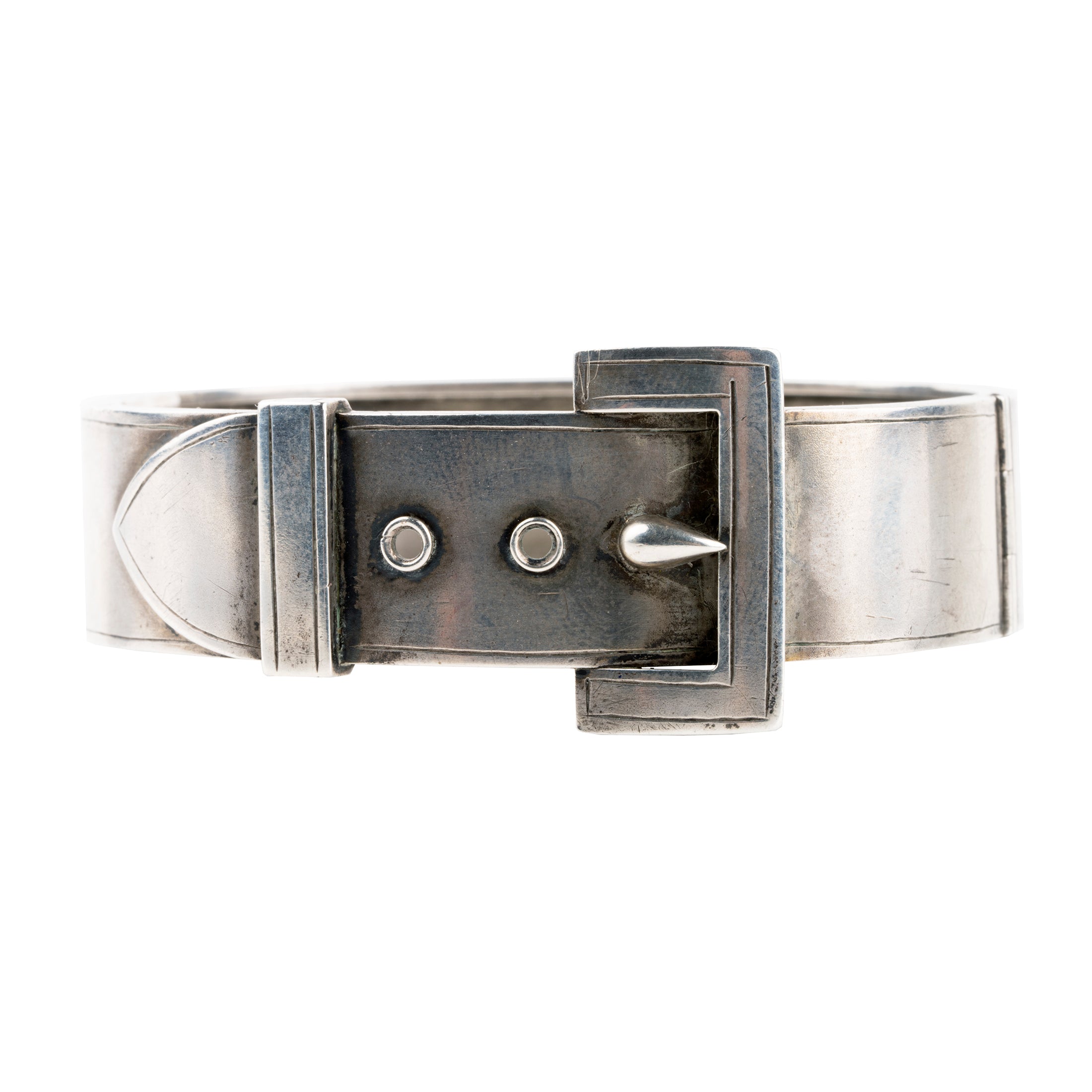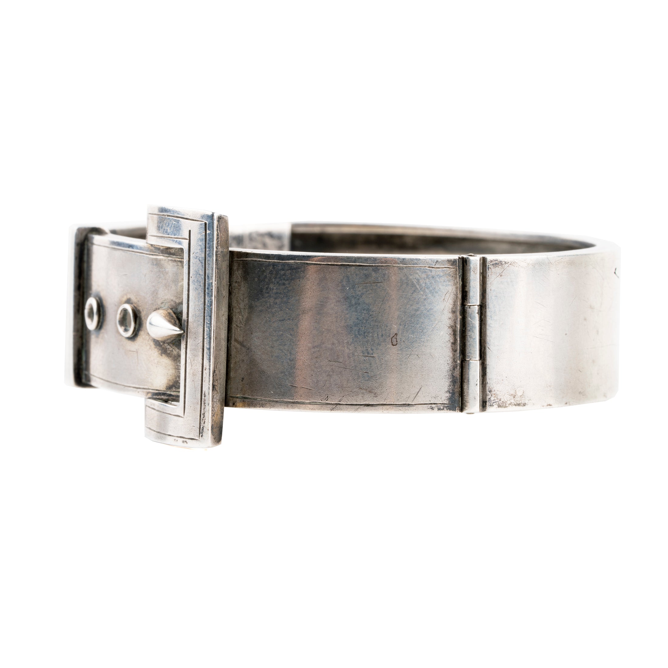 Victorian era sterling silver buckle bangle. The buckle motif represents strength and loyalty. English in origin. Circa 1880.