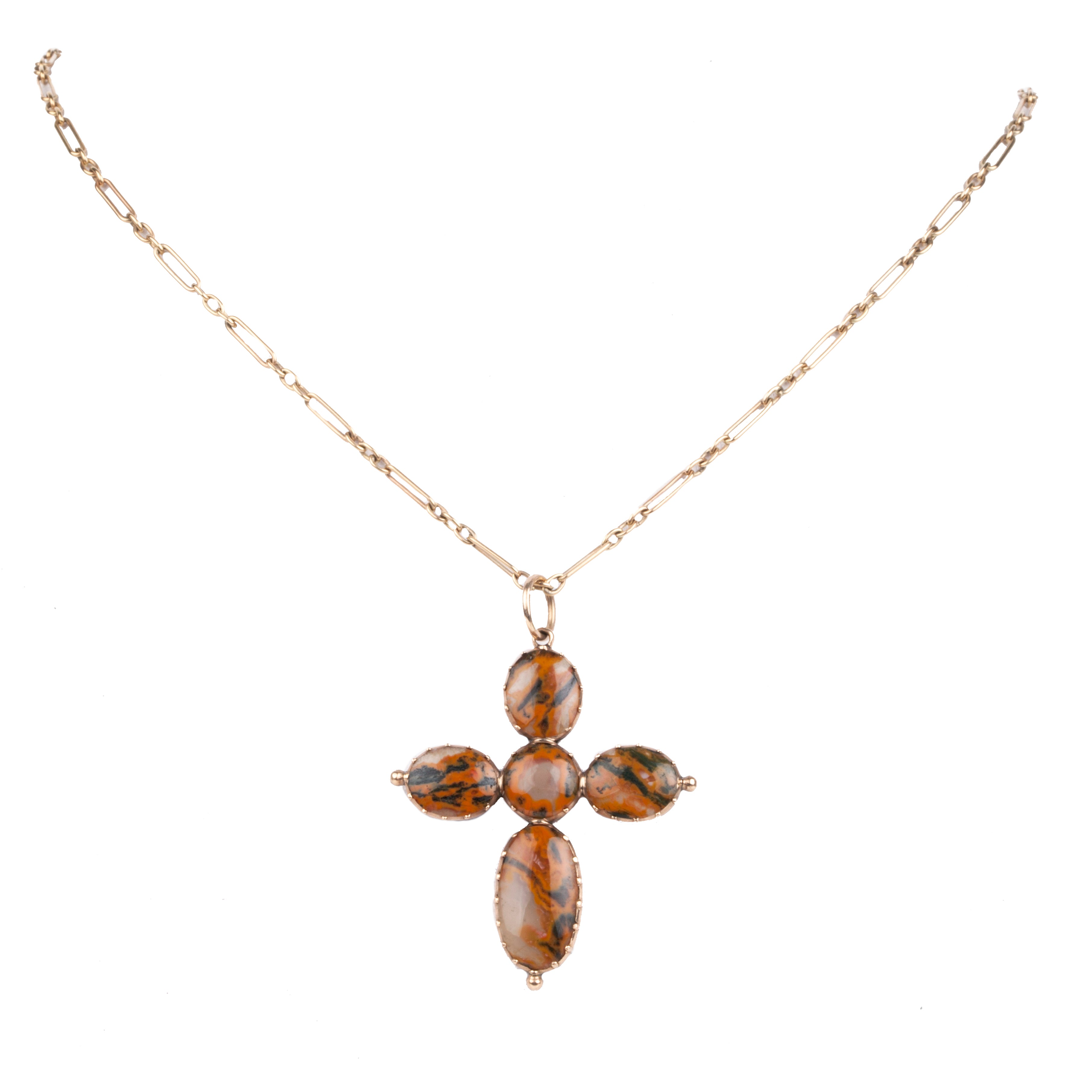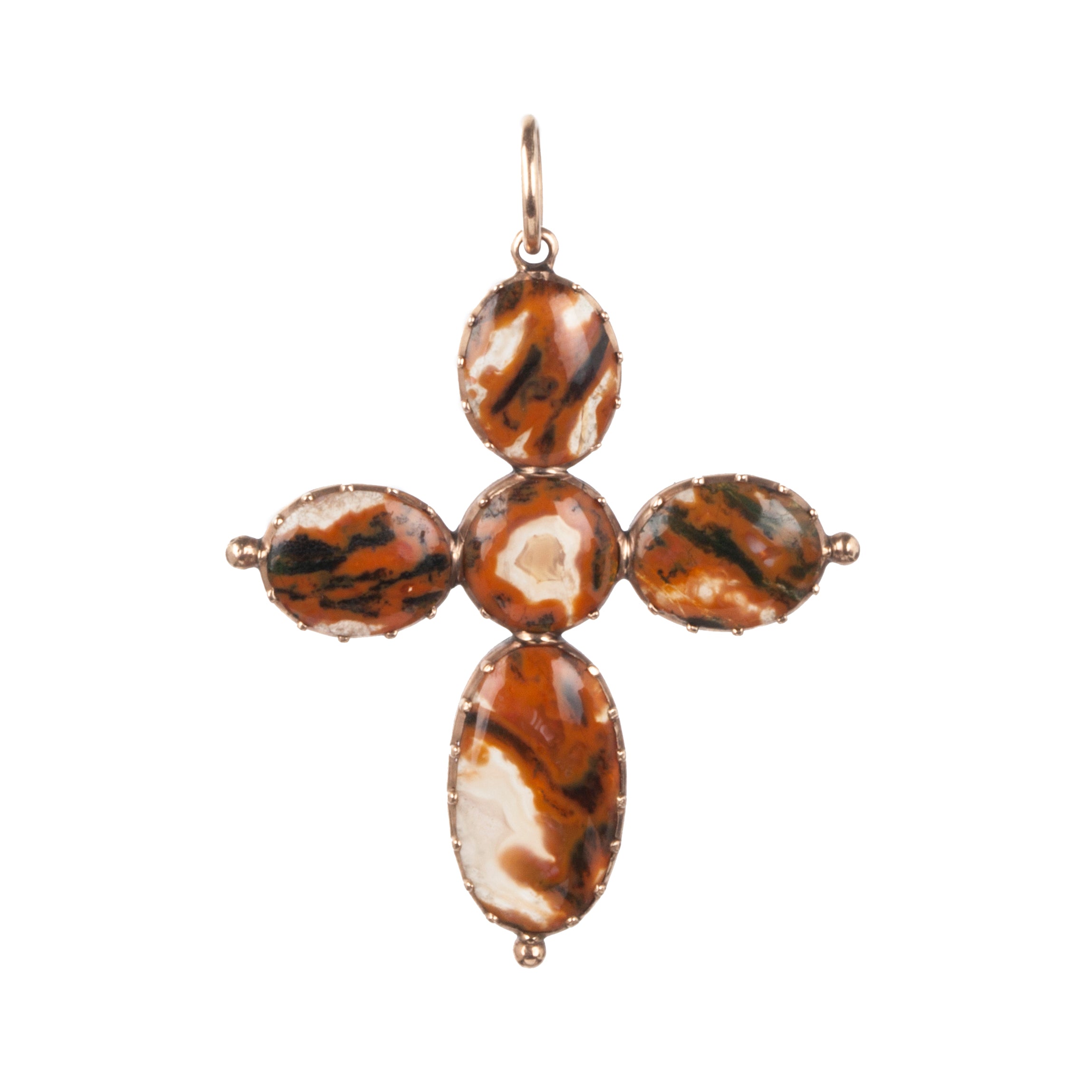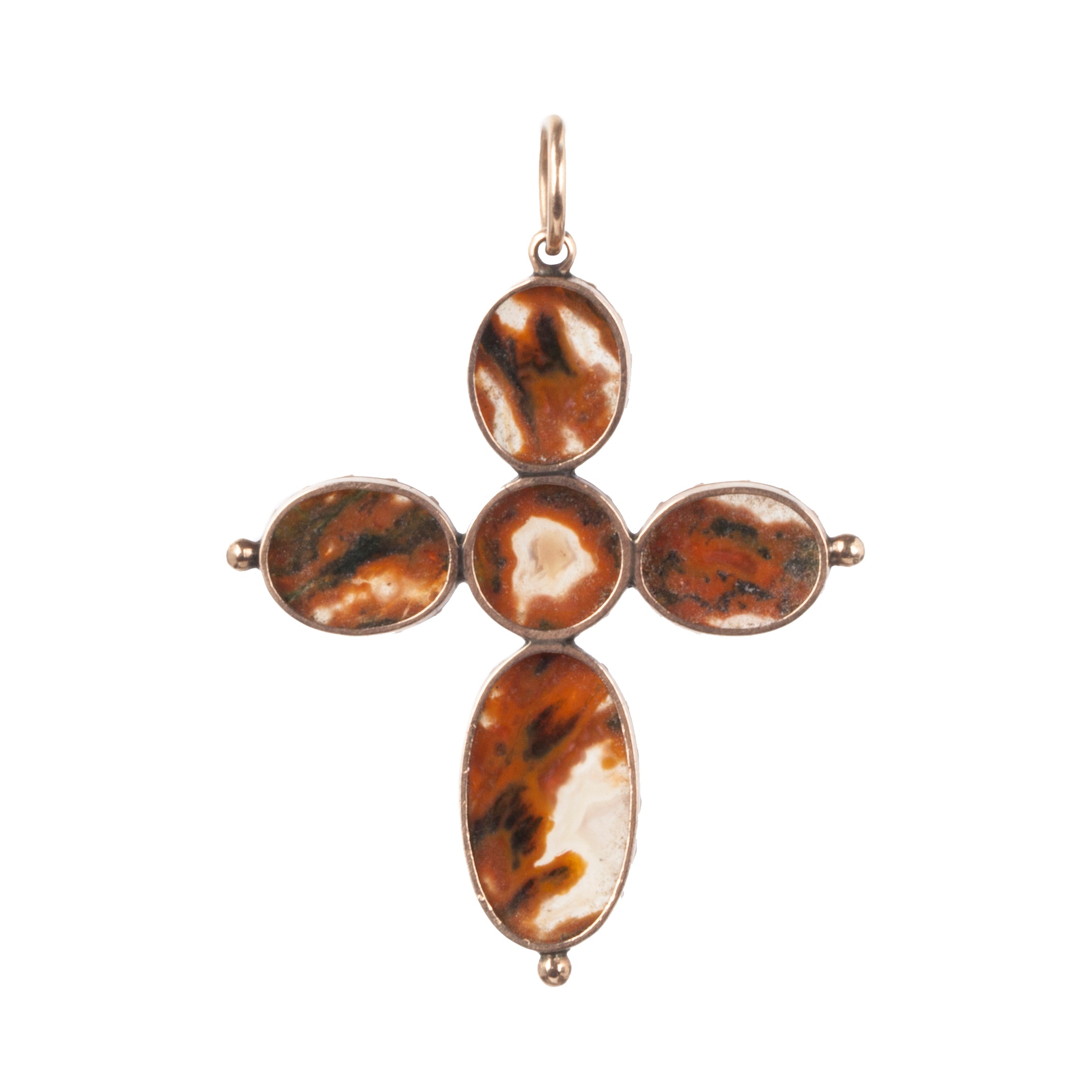 Victorian agate cross, in rose gold open back setting. Beautiful variation in stone pattern and color. English in origin. Circa 1830.