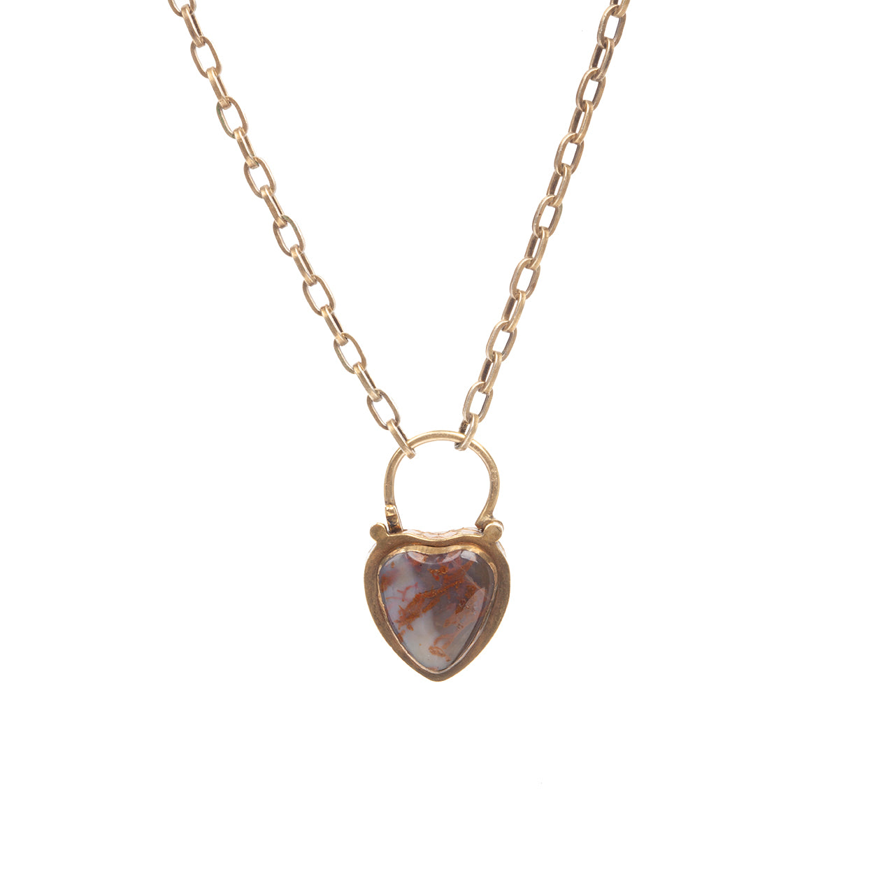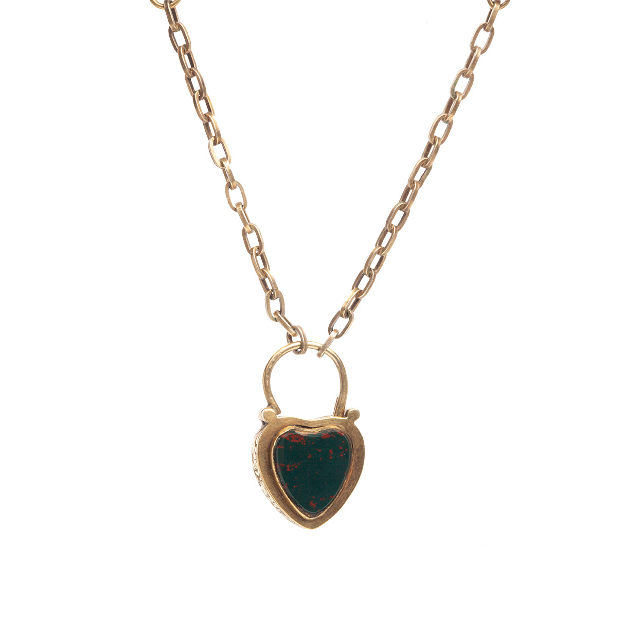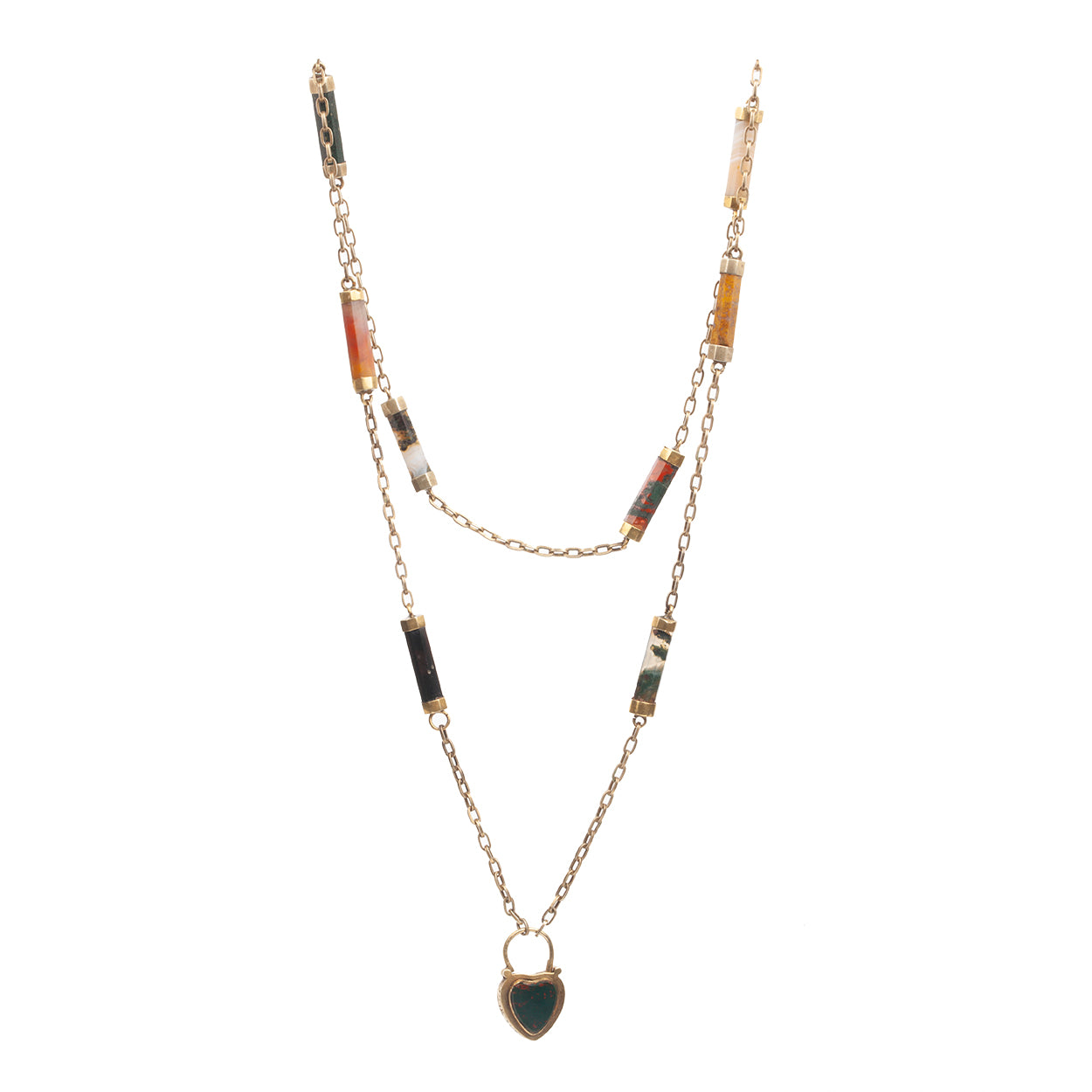 Victorian agate silver gilded chain with padlock clasps pendant. Eight varied agate specimen segments. Padlock clasp has bloodstone on one side and agate on the other. English in origin. Circa 1880.