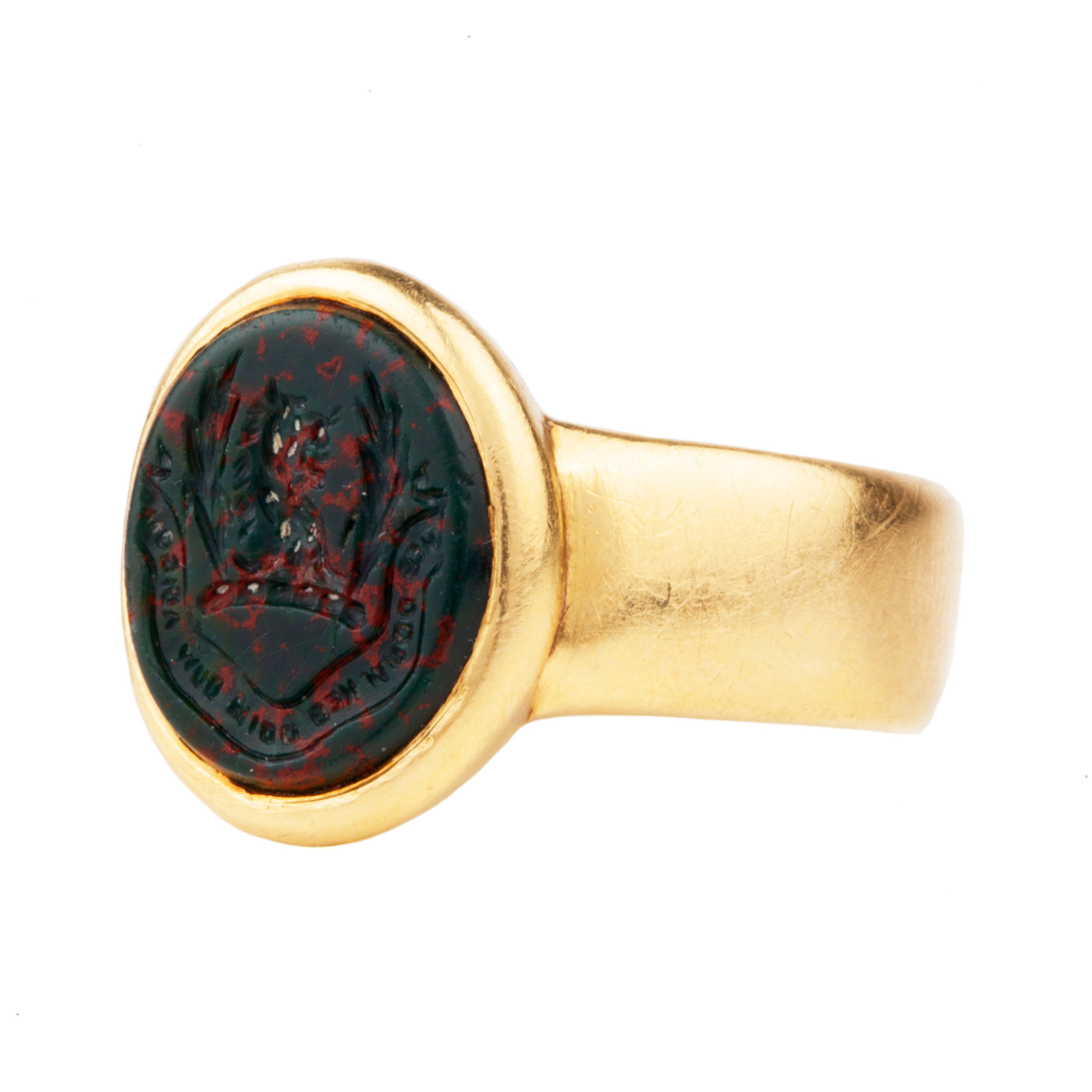 Heavy Victorian bloodstone signet style ring, in 18k gold. Bloodstone is hand-carved with a lion head crest with a Welsh motto "Heb dduw heb ddim, dhuw a digon" - "Without God without anything, God is enough". London make's marks, 1874.