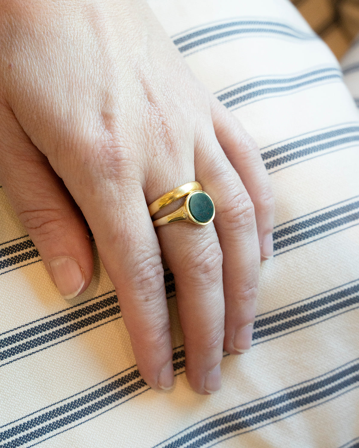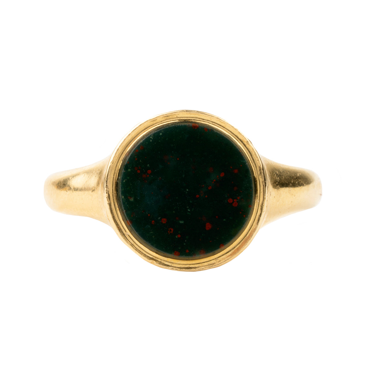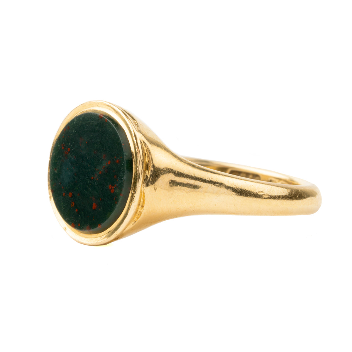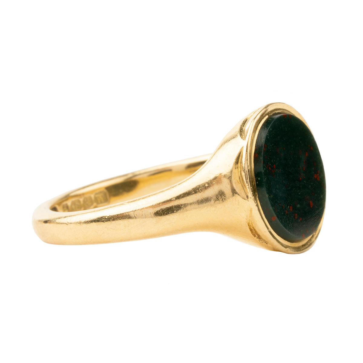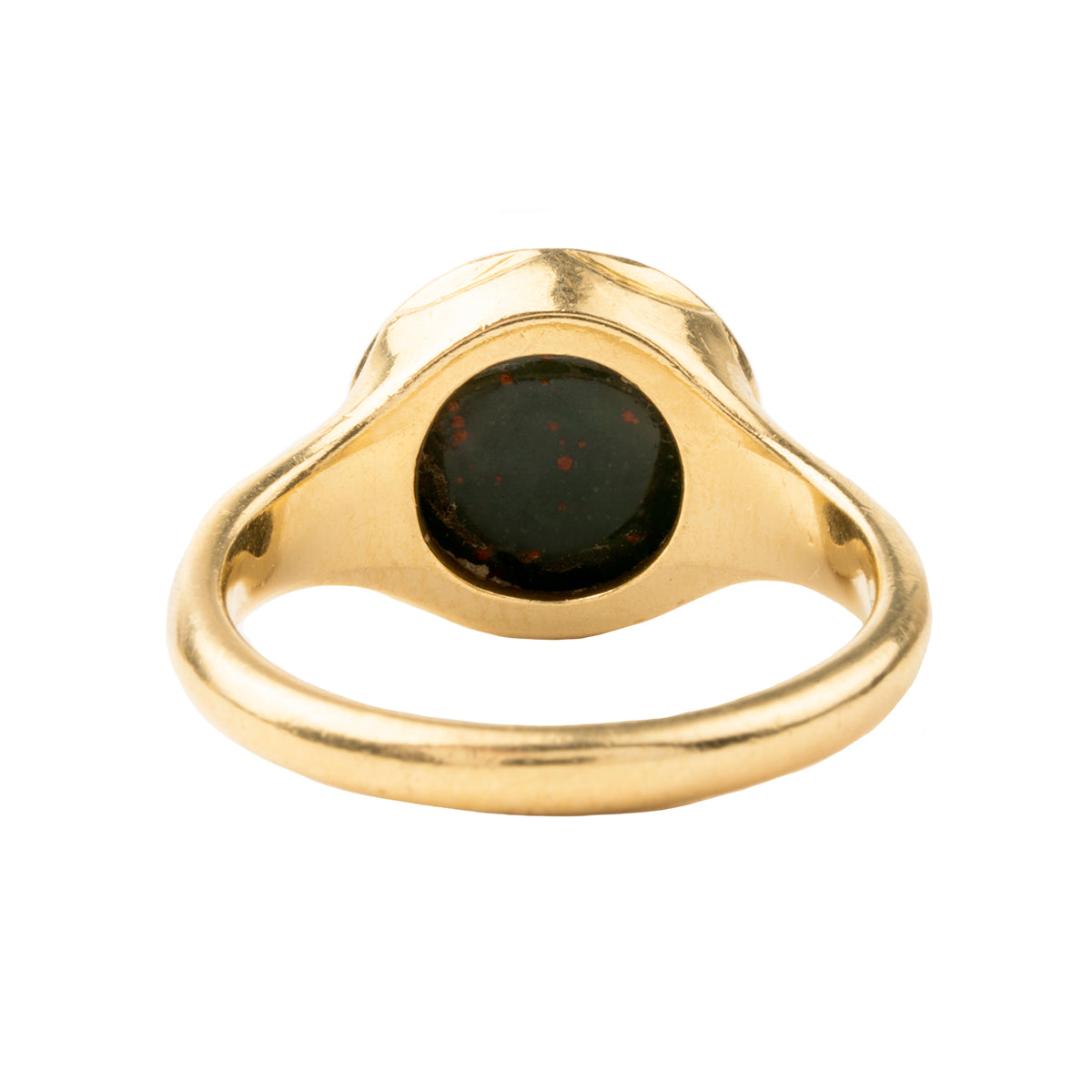 Victorian Revival bloodstone signet ring, in 18k gold. Hallmarked Charles Green & Sons Markers. English in origin. Circa 1946.