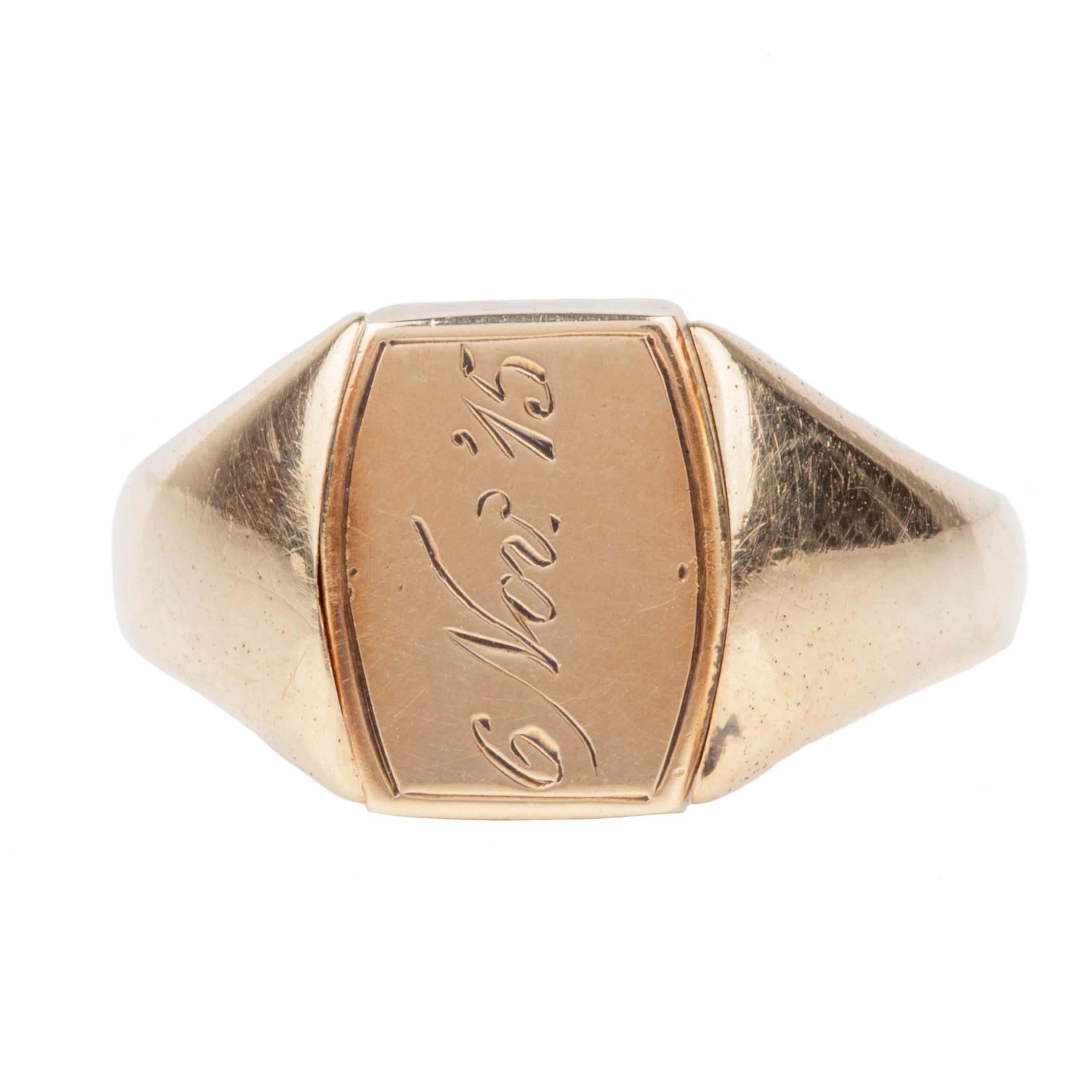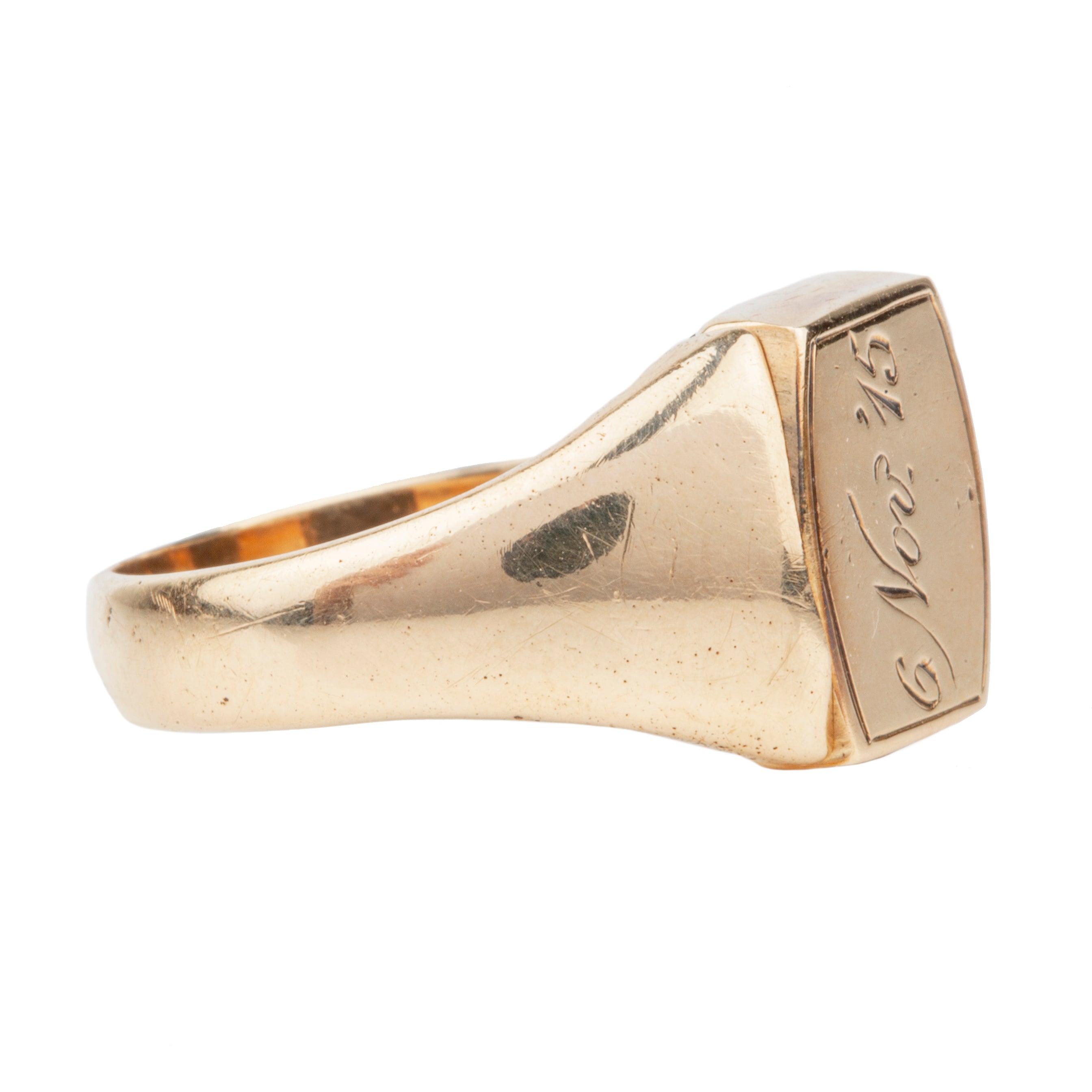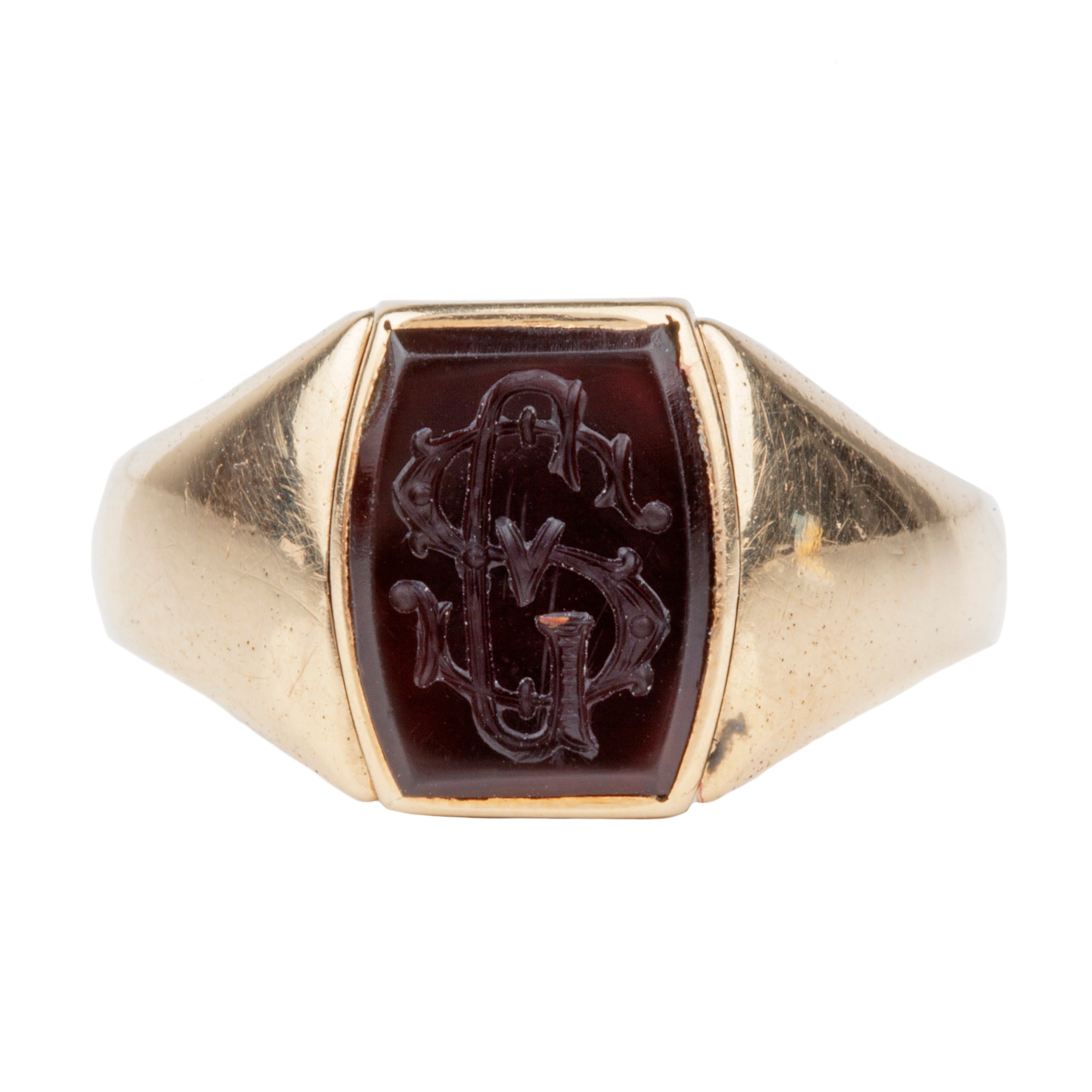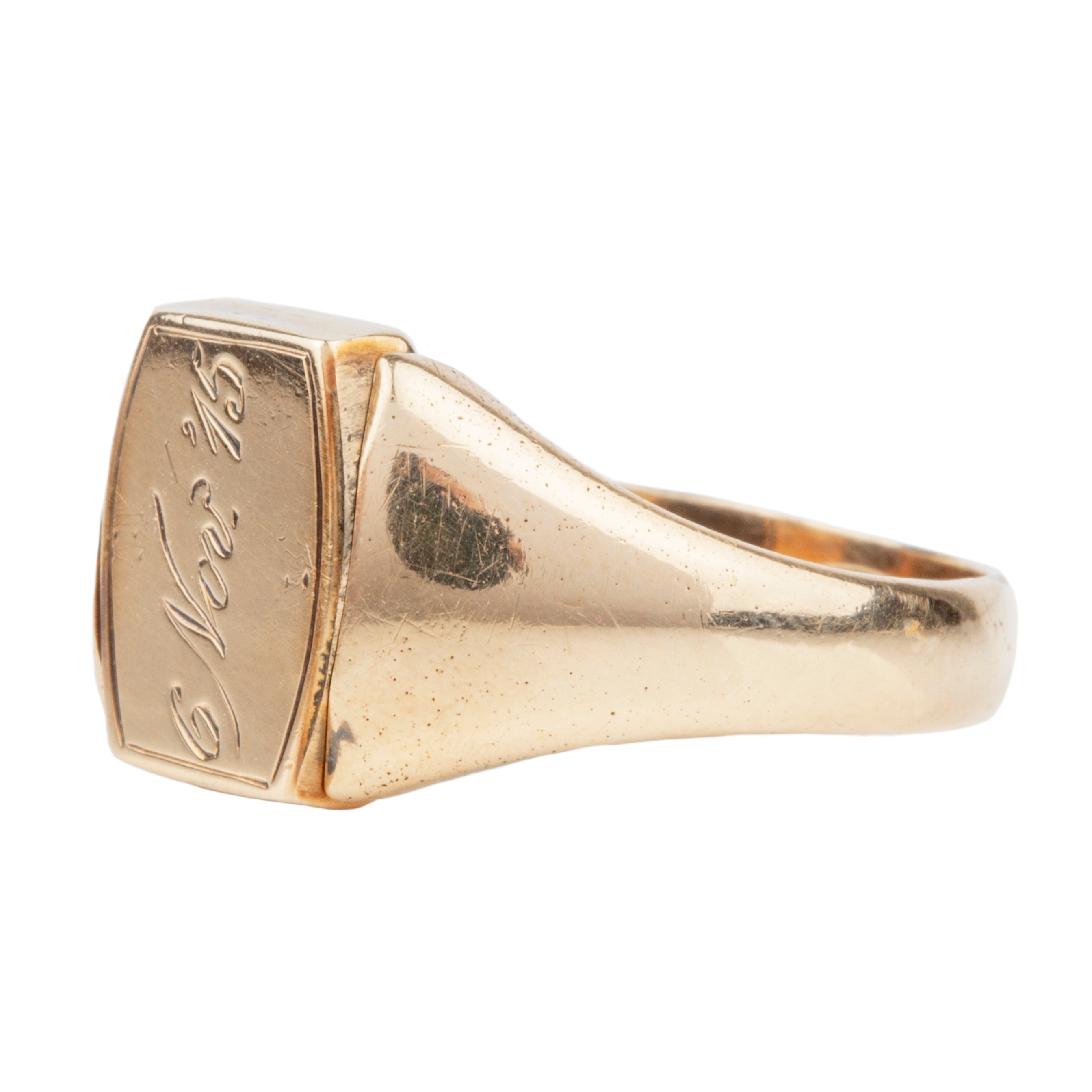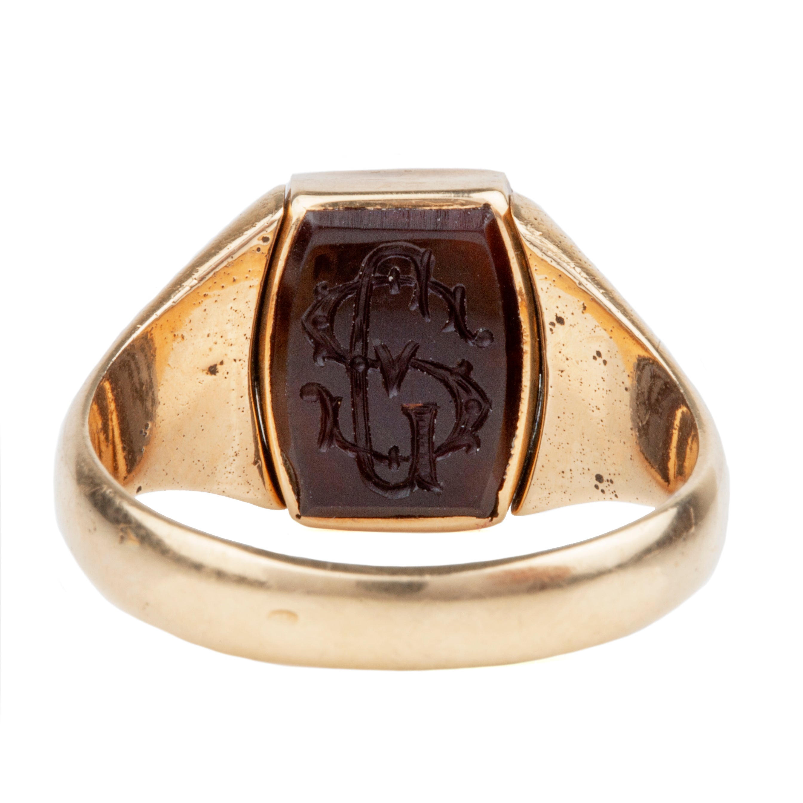 Antique agate intaglio swivel ring, in gold. Featuring "SG" or "GS" intaglio carving in carnelian, with a "6th, November 1915" engraved on verso. European in origin. Circa 1915.