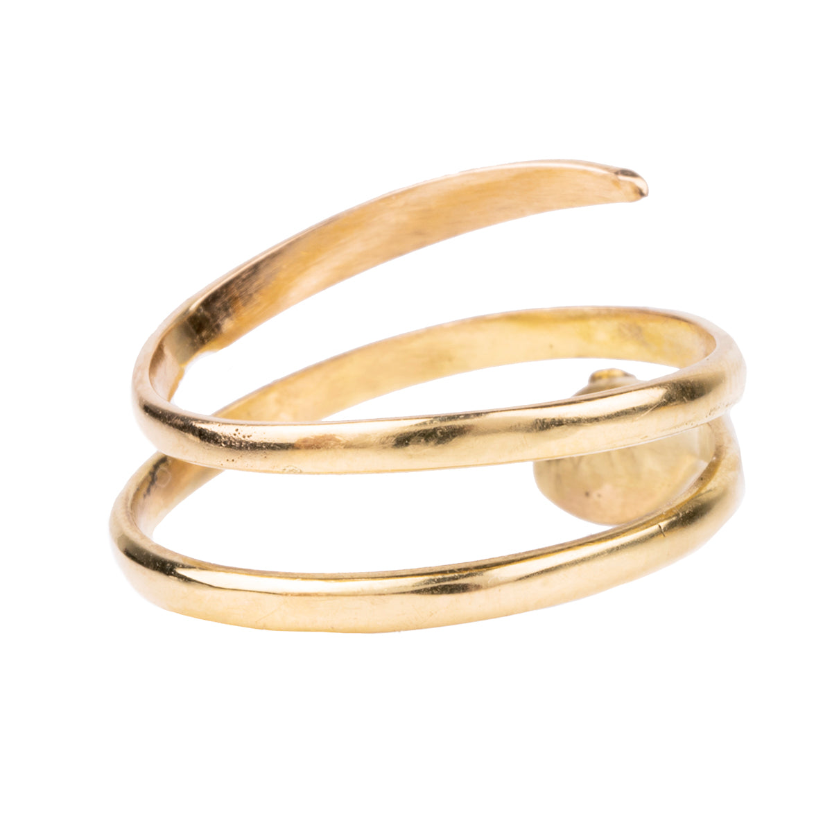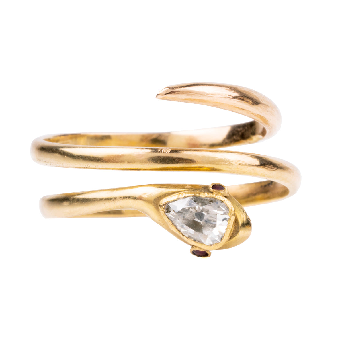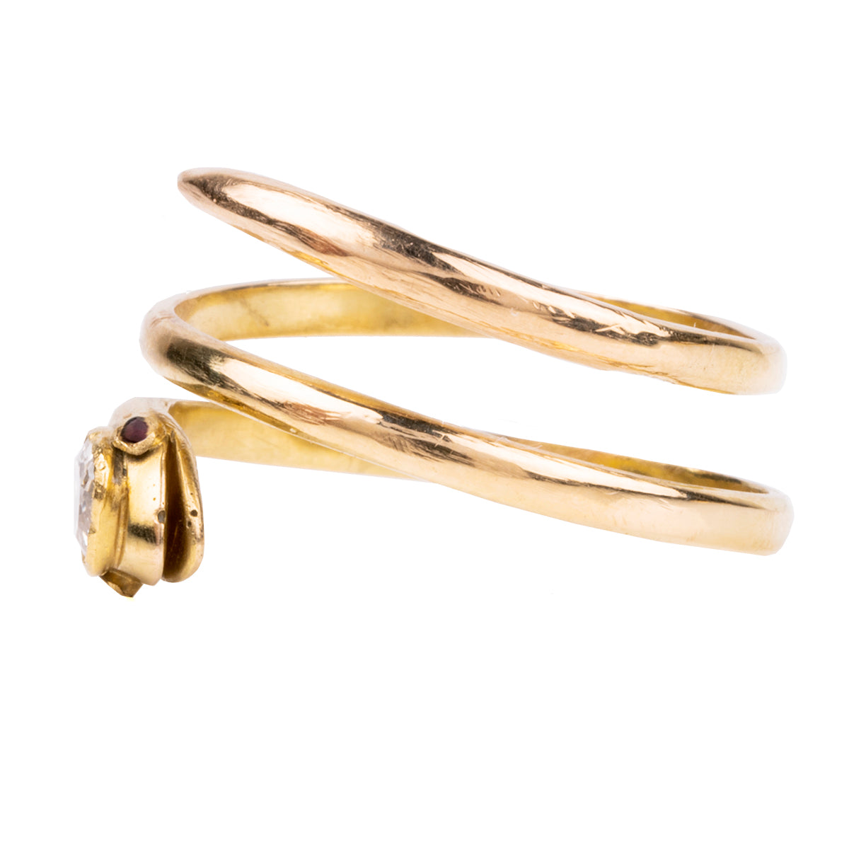 Victorian coiled diamond snake ring, in 18k gold. A pear shaped old mine cut diamond head with ruby eyes. This snake coils around the finger in three layers. English in origin. Circa 1870.