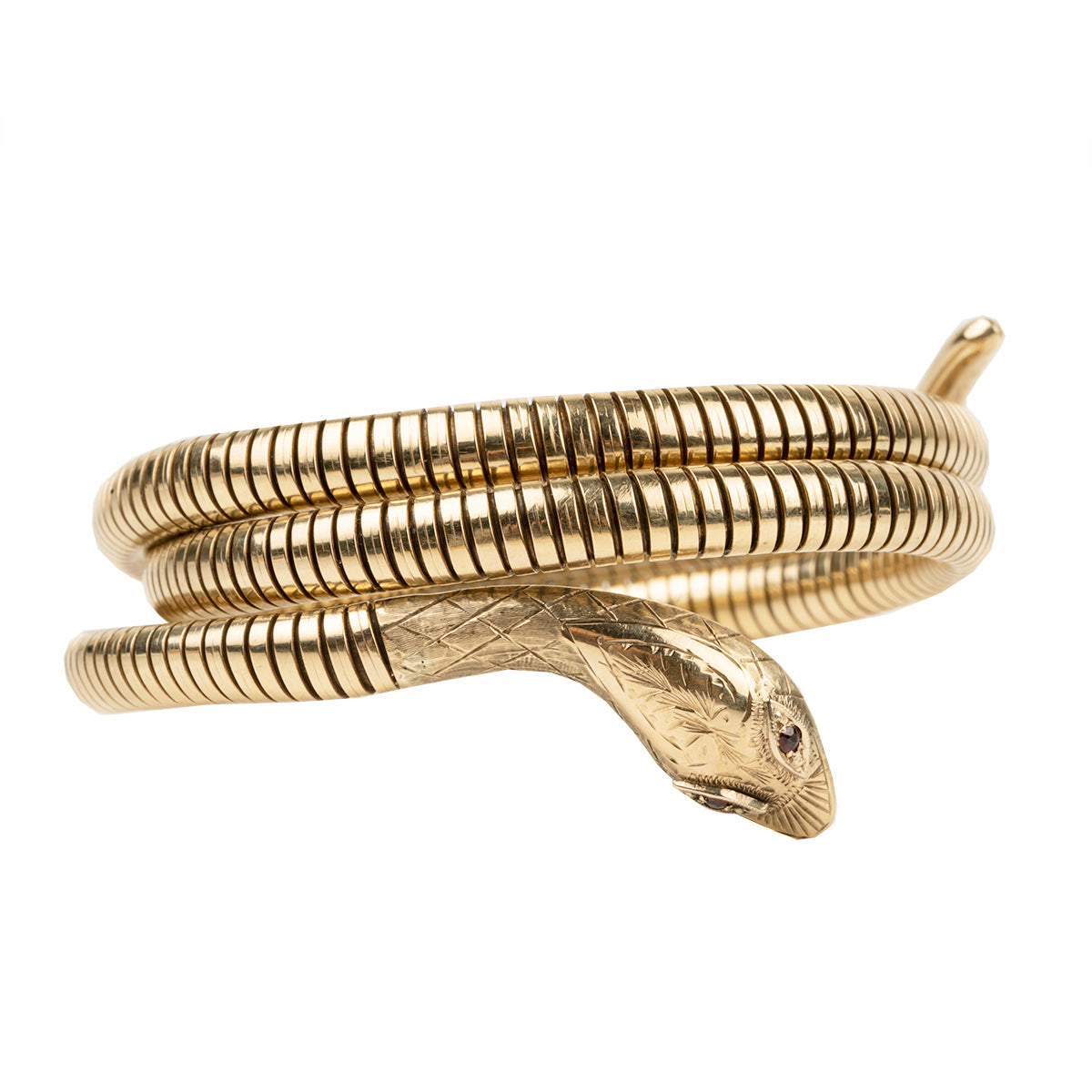 Victorian revival coiled snake wrap bracelets, in gold. Delicate hand engraved head with garnets for eyes. English in origin. Circa 1960.