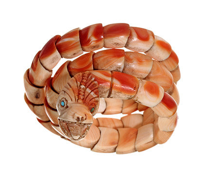 Victorian carved conch shell snake bracelet with turquoise stone eyes. Snake wraps around wrist and can fit most wrist sizes. Circa mid-19th century.