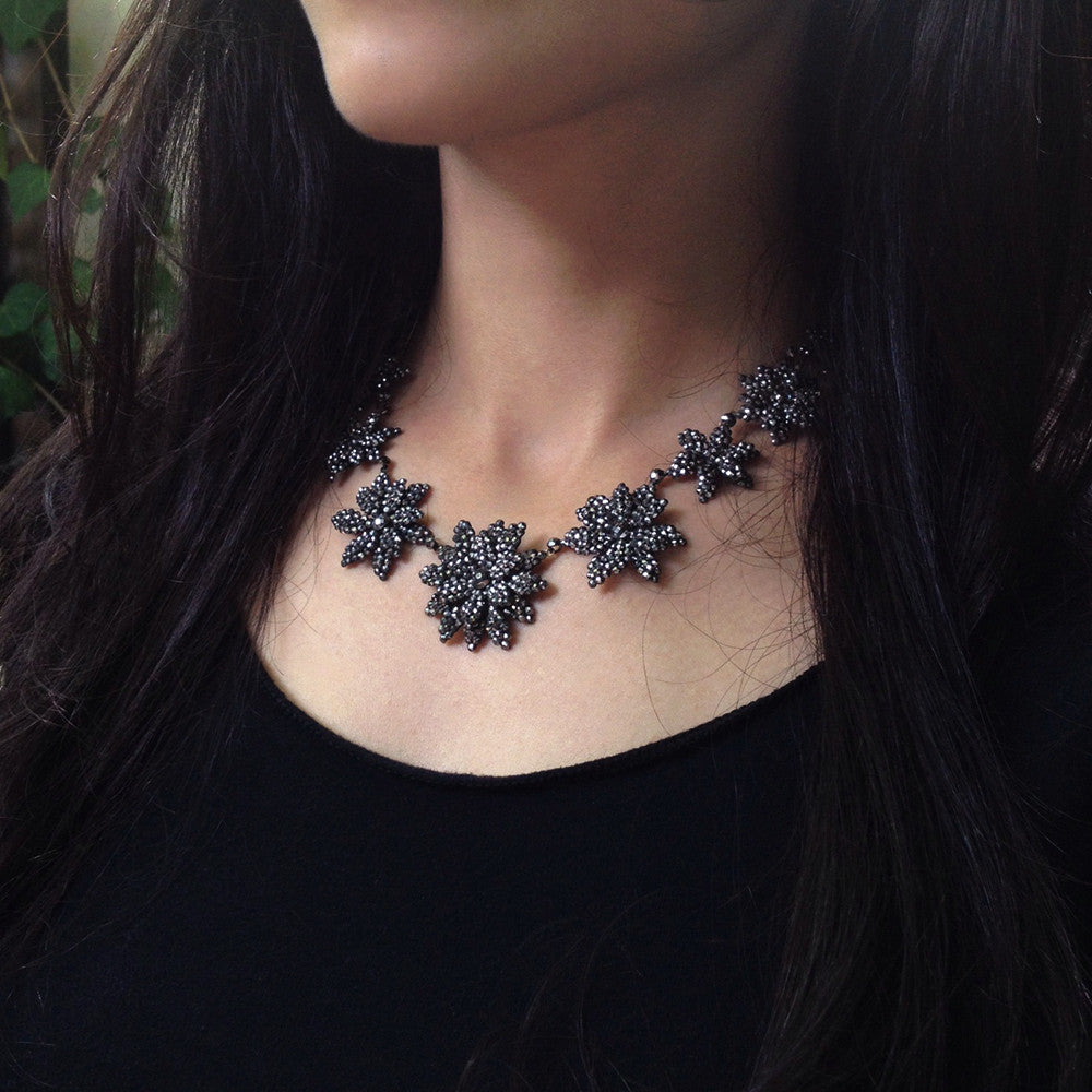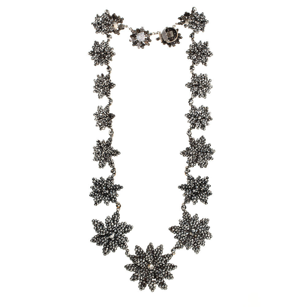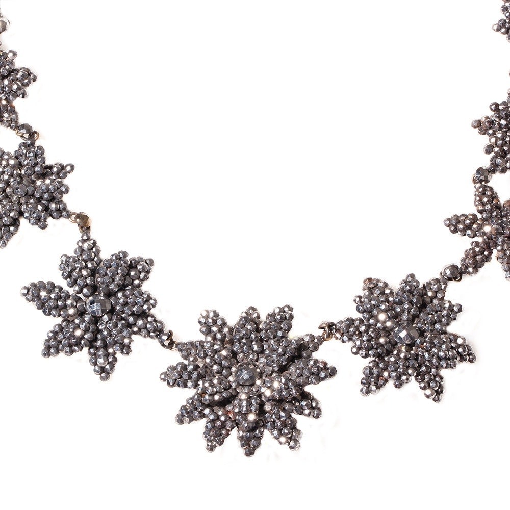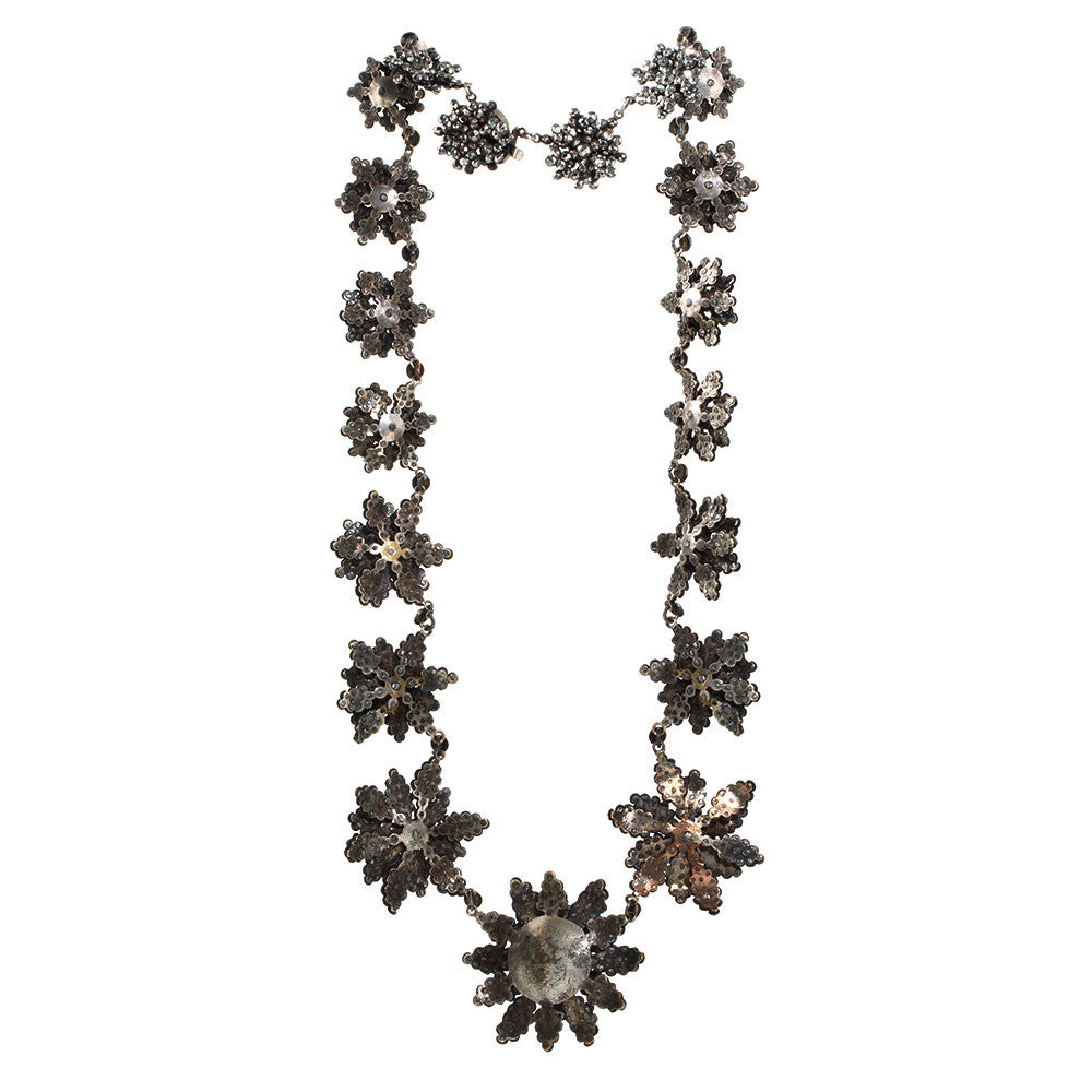 A nice example of an early 19th century cut steel necklace. 18 floral sections in descending size and a matching push button clasp make up this glittering steel necklace. Measuring a generous 17". It is difficult for the camera to capture the dark sparkle this necklace gives. Circa 1840, found in England.