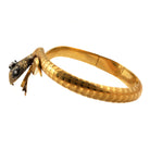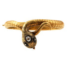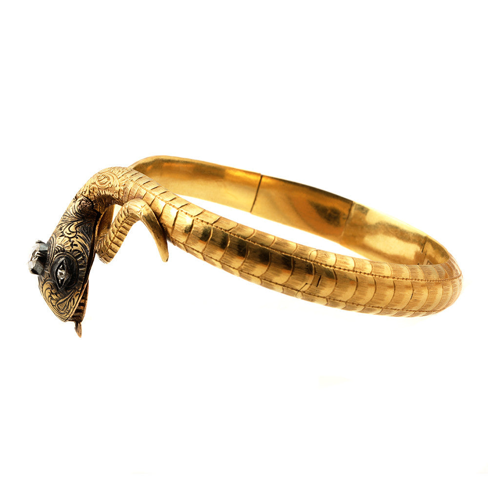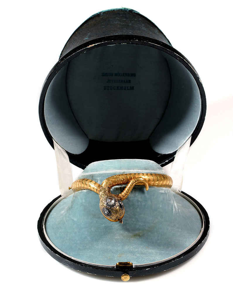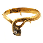 Victorian era gold snake bangle, in 18k gold. Rose cut diamond eyes and on the head, with beautiful hand engraving details and a arrow tongue. Two hidden locket compartments, one on the interior of the bangle revealing a lock of blonde hair and one underneath the head. Swedish in Origin, in Original Box. Hallmarks indicate a manufacture date of 1864.