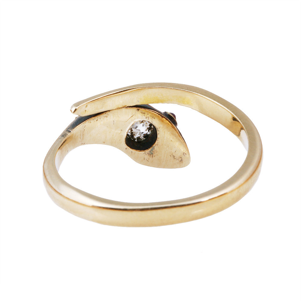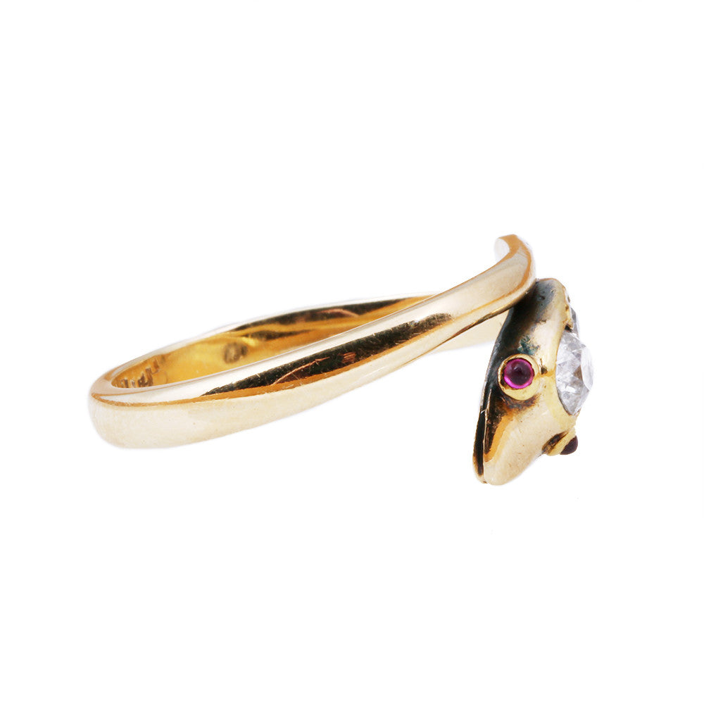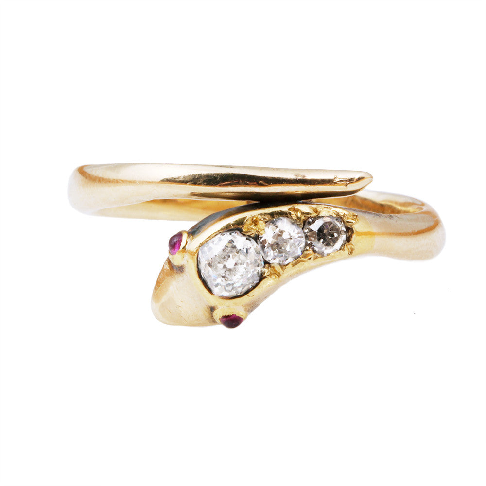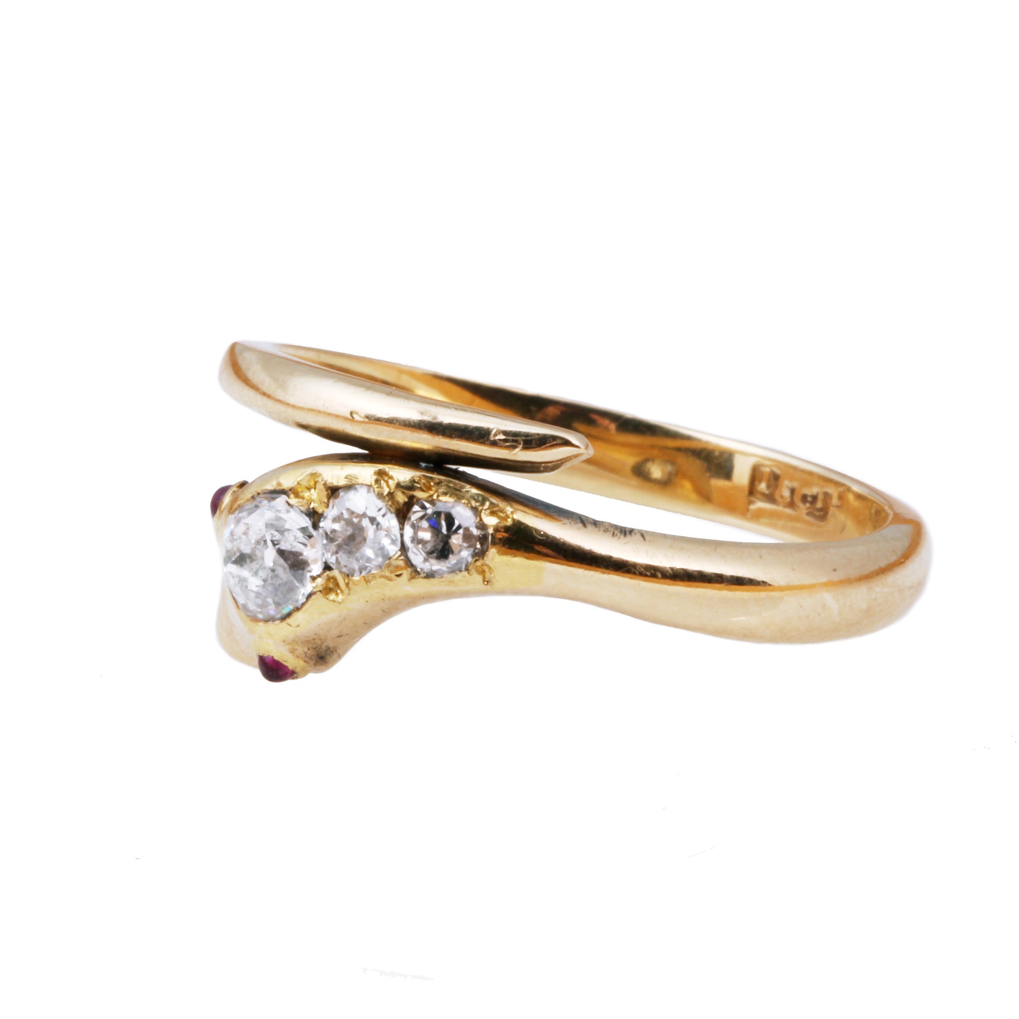 Victorian diamond snake ring, with rubies for eyes. . Three graduated old mine cut diamonds set in 18k gold. English in origin, Circa 1860 -1880. The snake was a popular Victorian-era symbol for eternal love.