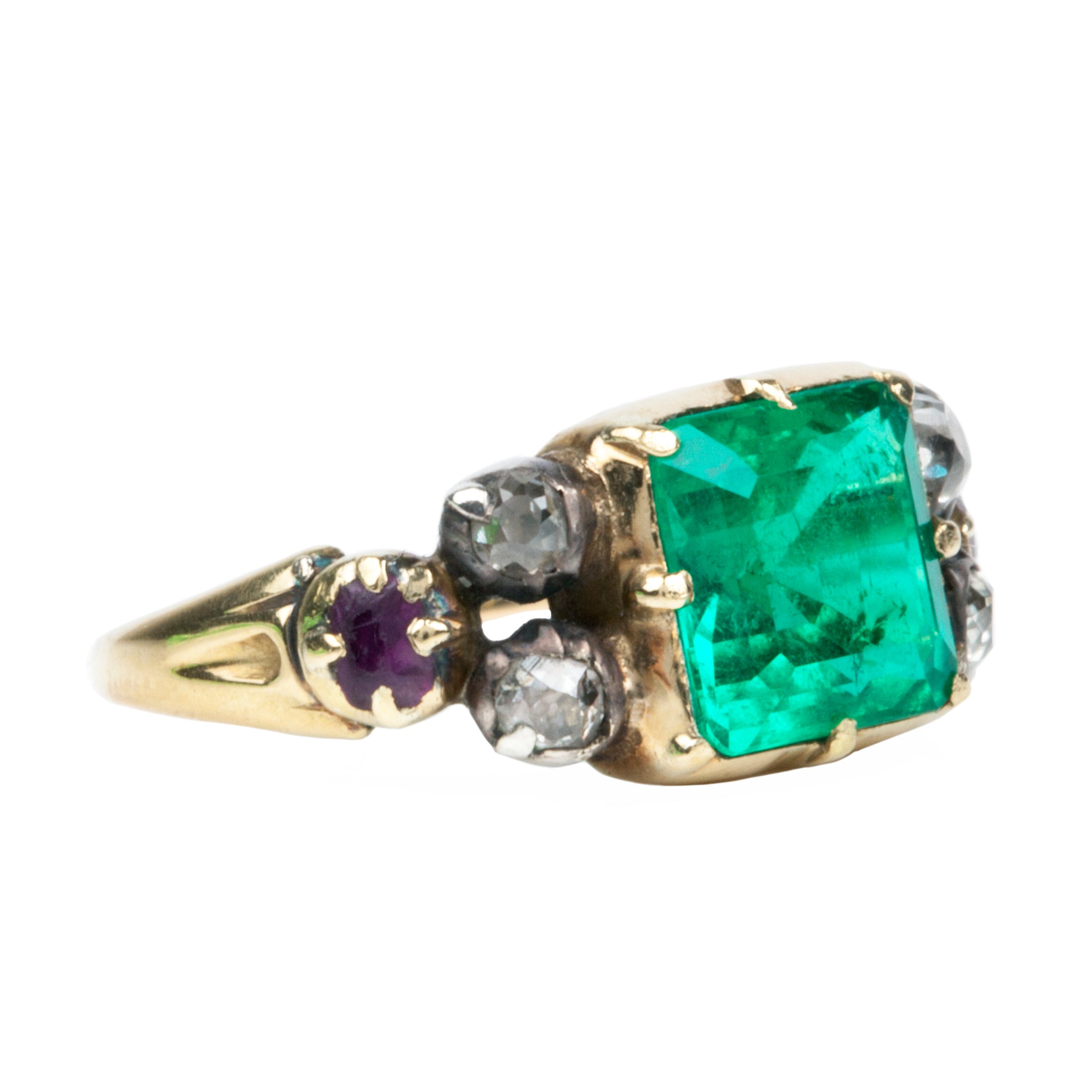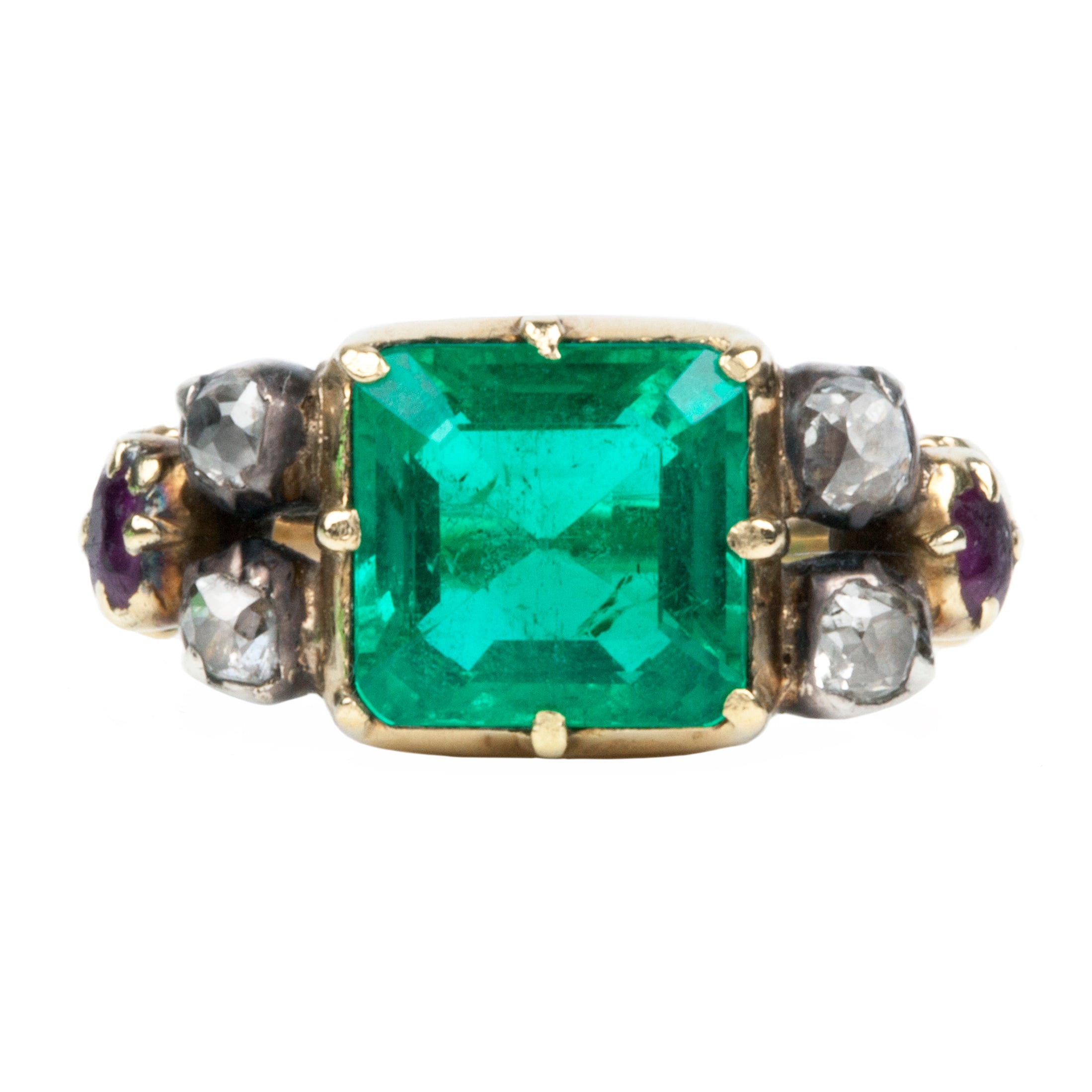 Rare Victorian era emerald ring. The emerald is a deep clear green and certified to be of Colombian origin, with minor oil treatment. Flanked by 4 old mine cut diamonds and the two rubies. The diamonds are set in silver and gold closed back settings. English in origin. Circa 1860