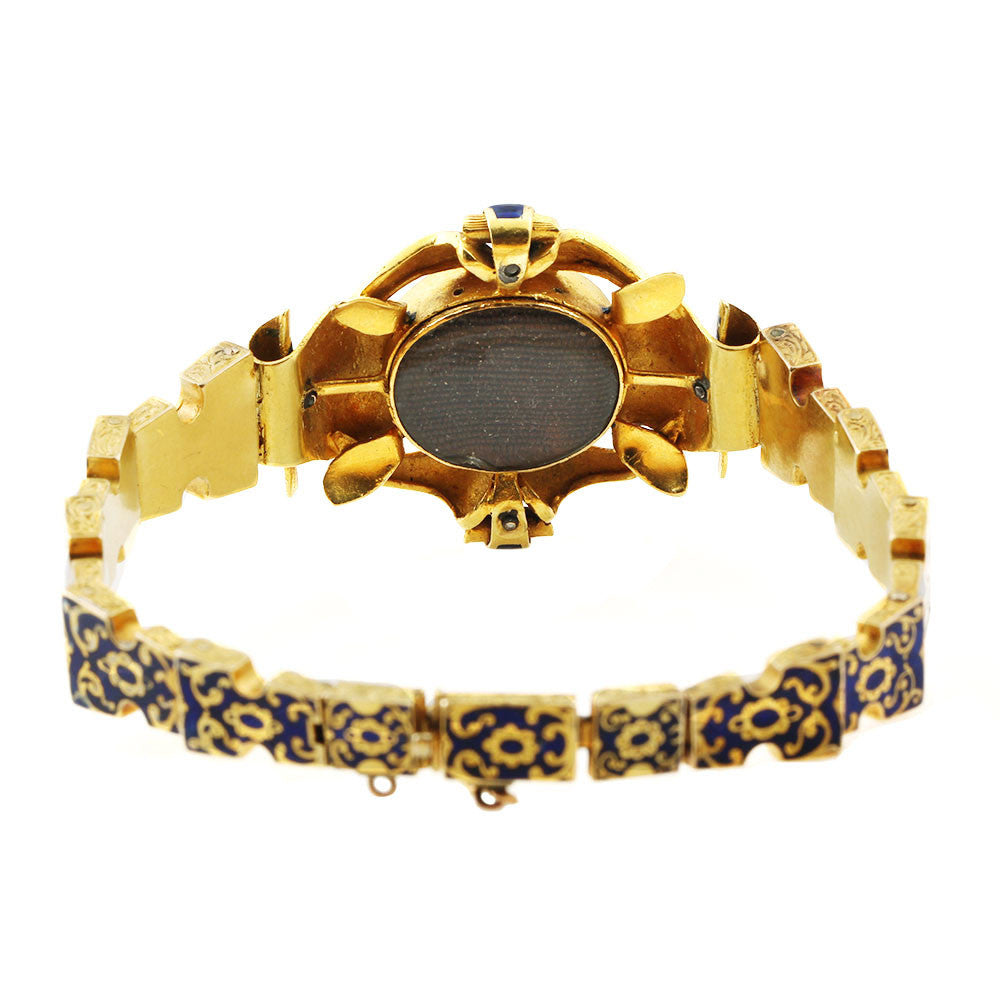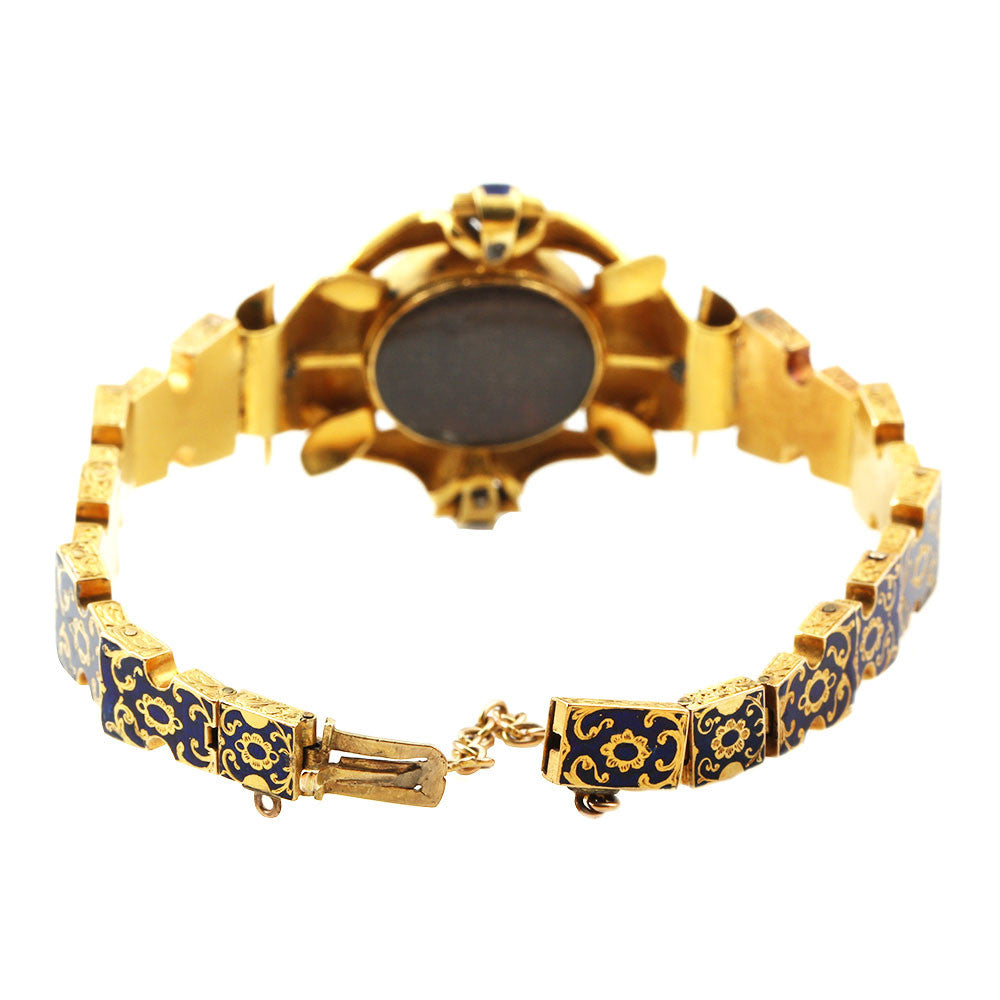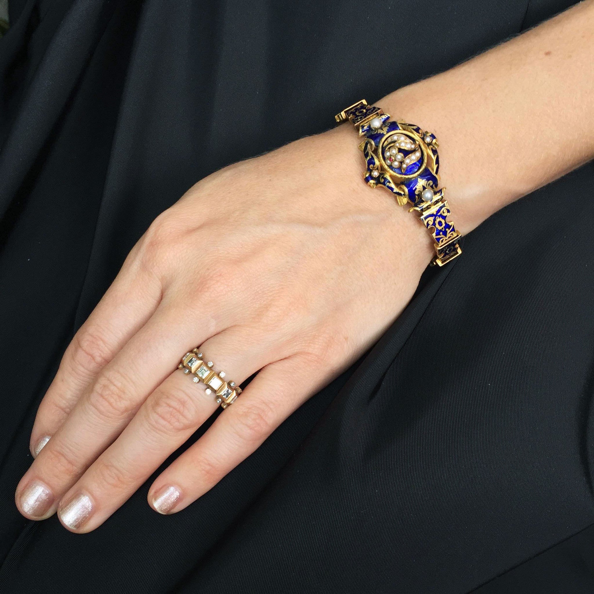 High Victorian era sentimental bracelet in 18k gold and enamel. Natural pearl details form a forget-me-not flower with a garnet center. On the reverse is a hidden locket compartment. Each link has cobalt blue enamel details. The bracelet is in excellent condition and remains in its original box. Circa 1860. English in origin.