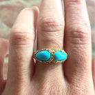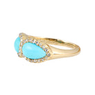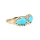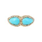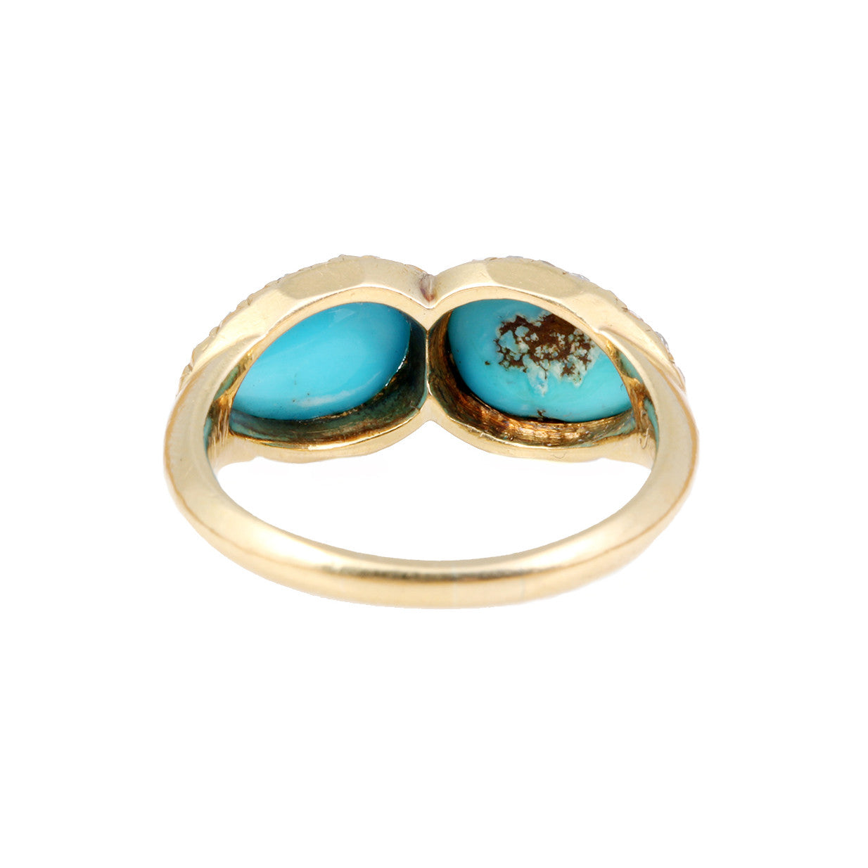 Victorian Persian turquoise & diamond ring in 15k gold. Rose cut diamonds surround two pear shaped turquoise stones in an infinity motif. English in origin, Circa 1856.