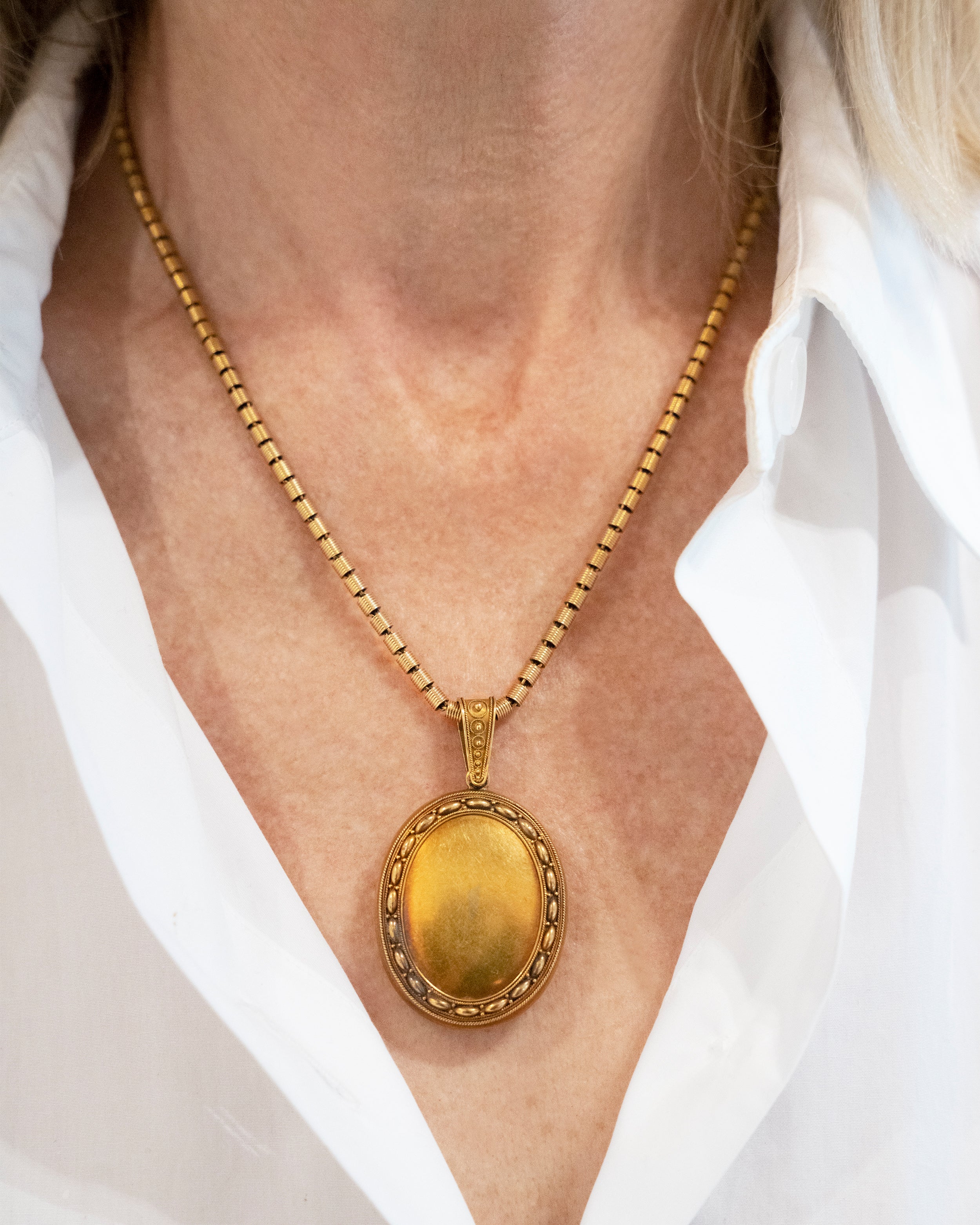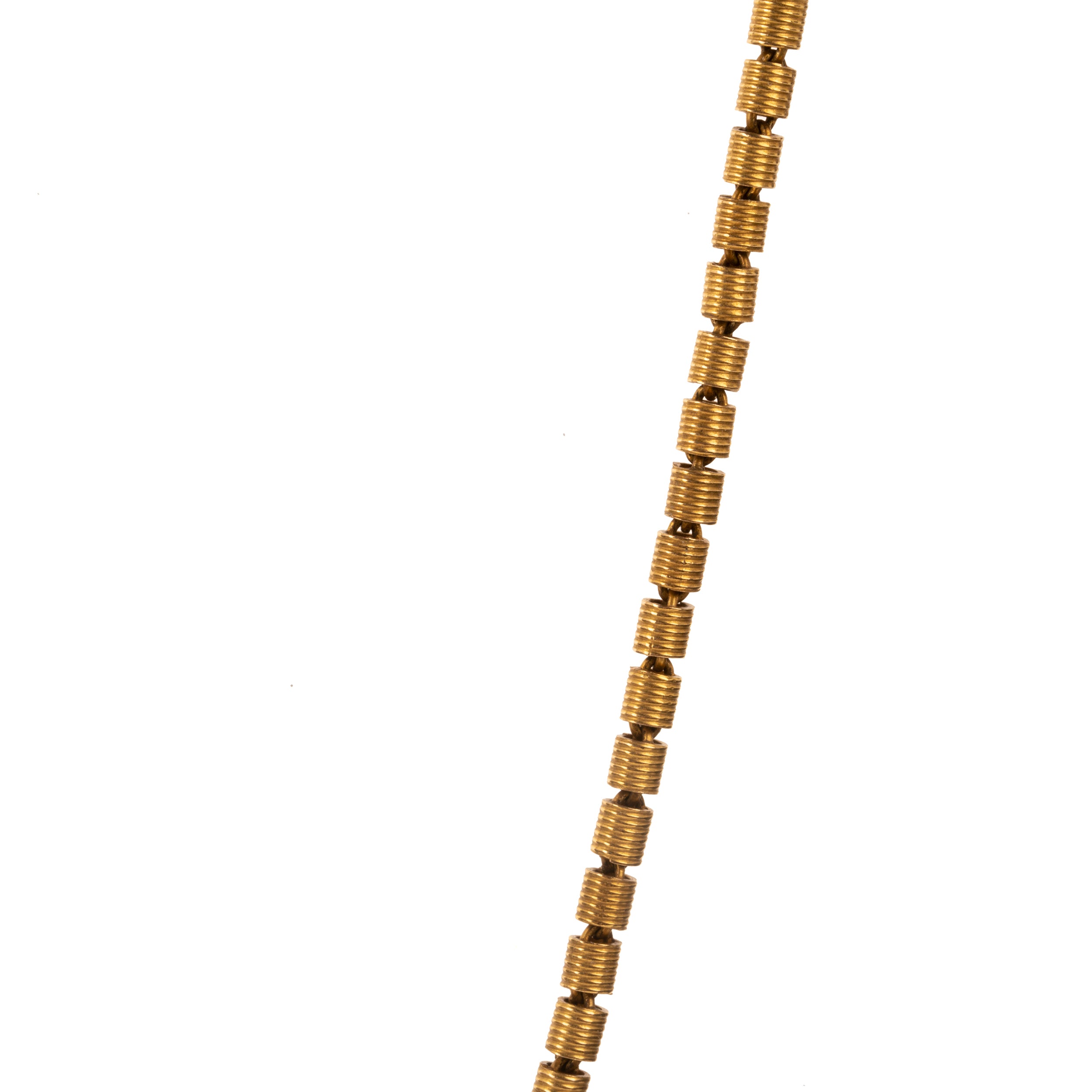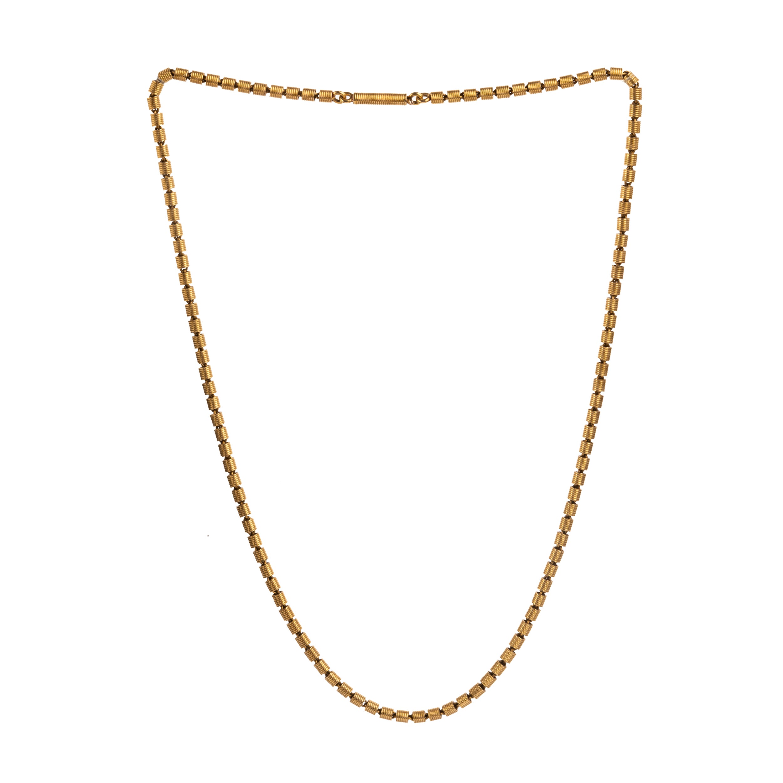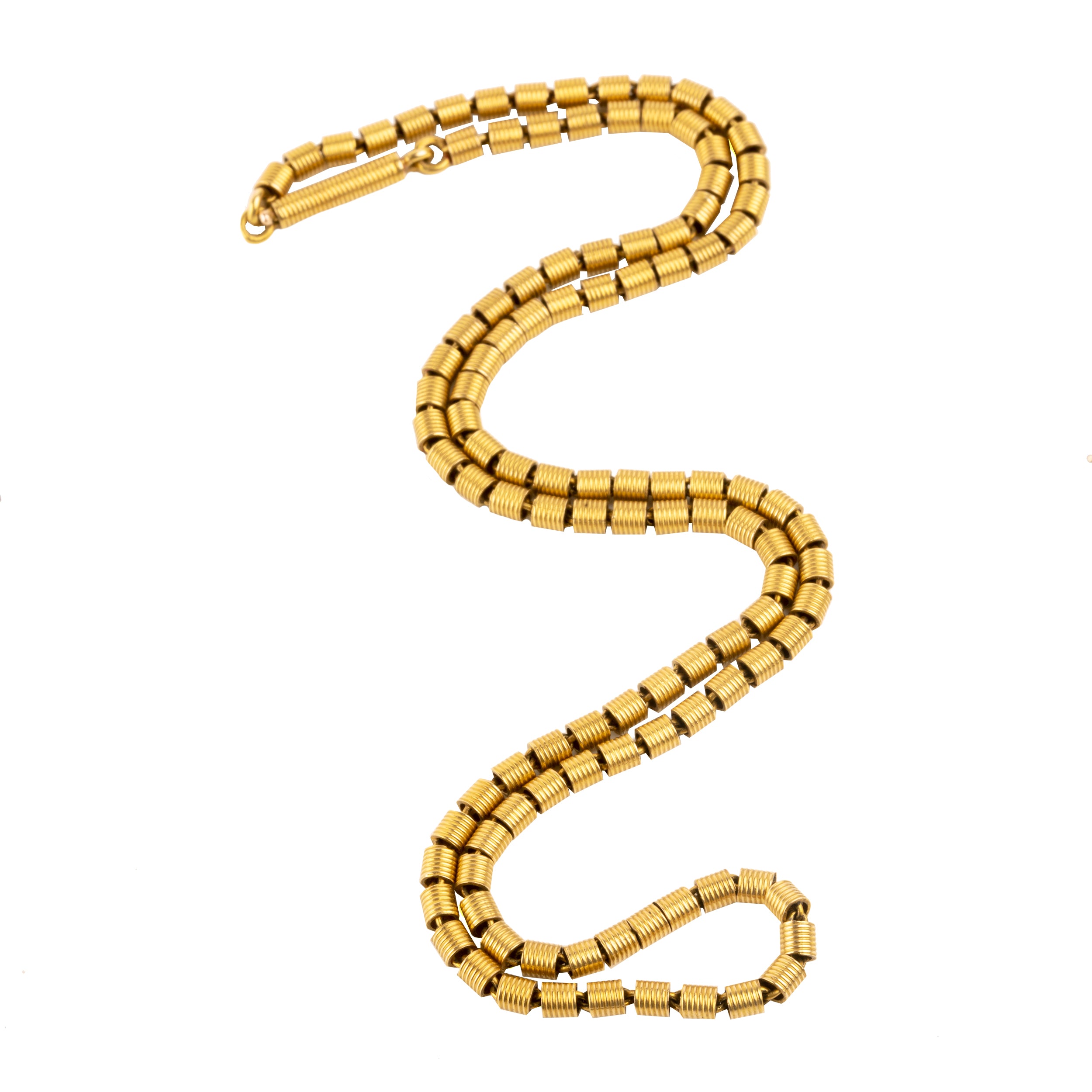 An unusual handmade chain dating to the late 19th century. A very nice heavy weight, each link is in a barrel shape with reeded detail. It looks like coiled wire but each link is a solid piece of gold. English in origin. Circa 1870.