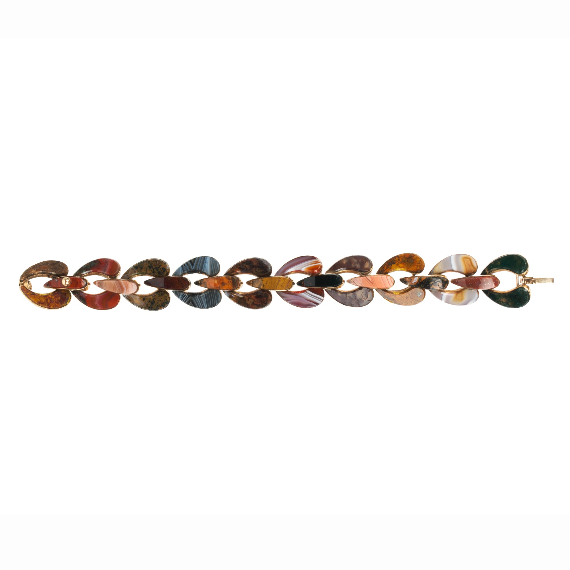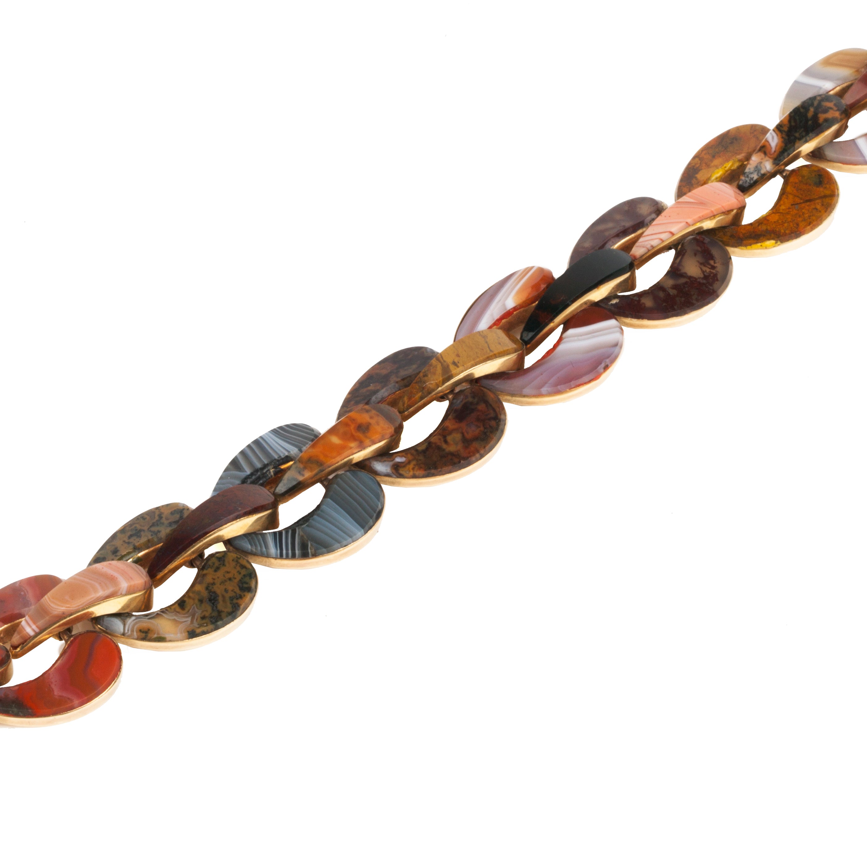 Victorian era agate link bracelet. Each stone is set and backed in 15k rose gold. Beautiful variation in stone pattern and color. English in Origin. Circa 1880.
