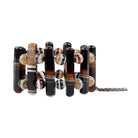 Victorian era agate bangle bracelet, in sterling silver. Banded agate stones are cut into cylindrical and round beads and strung on a stiff hinged bangle with an unusual silver closure. English in origin. Circa 1870.
