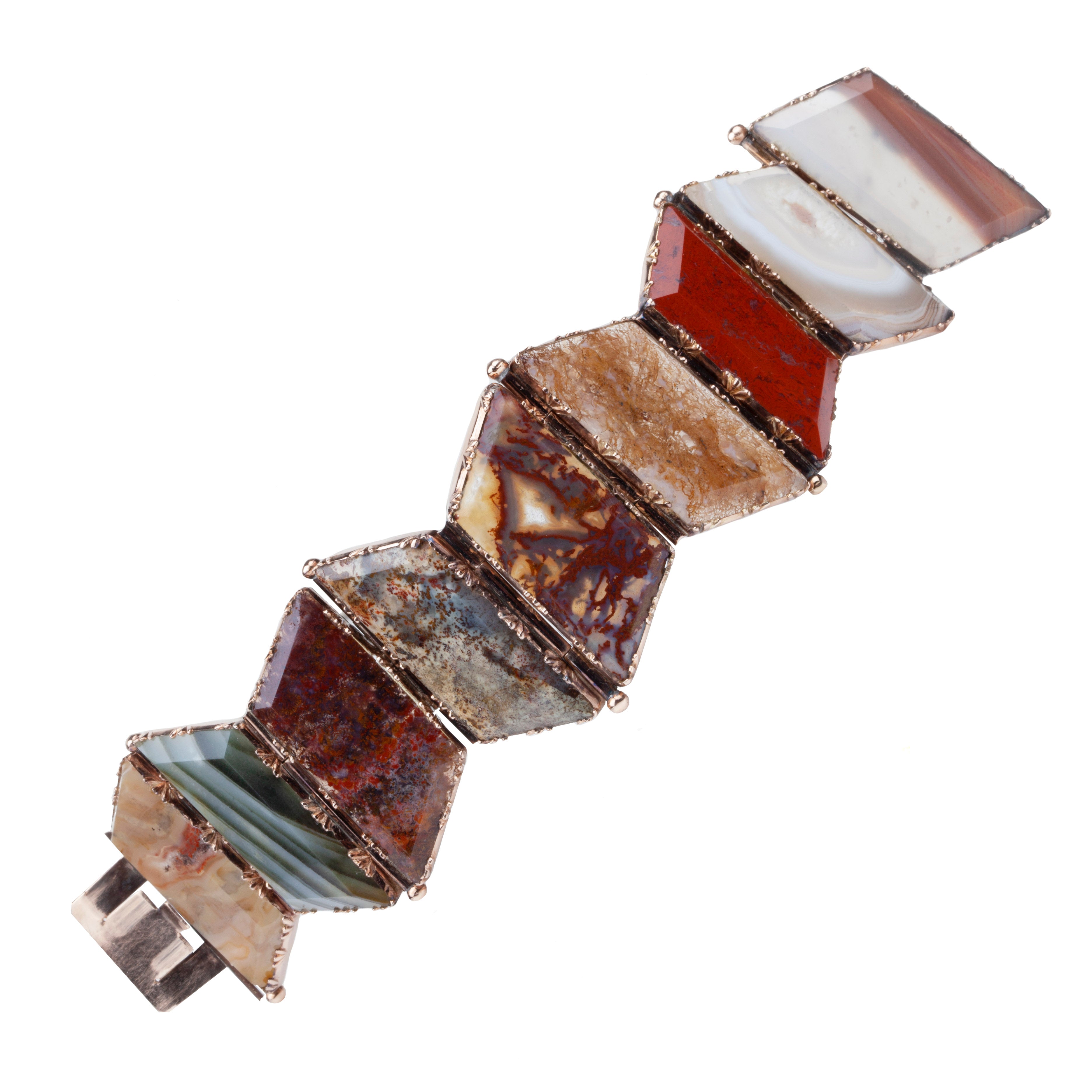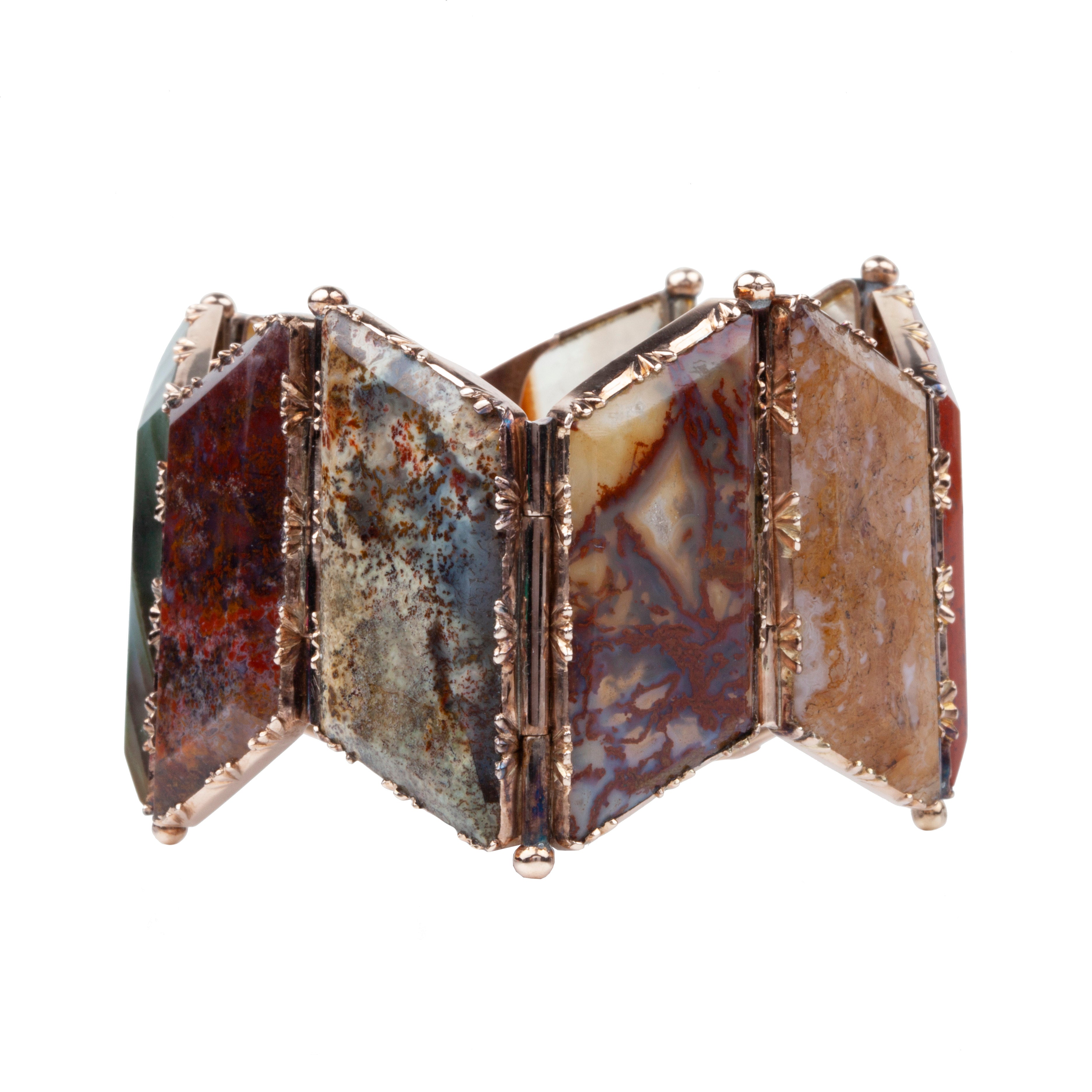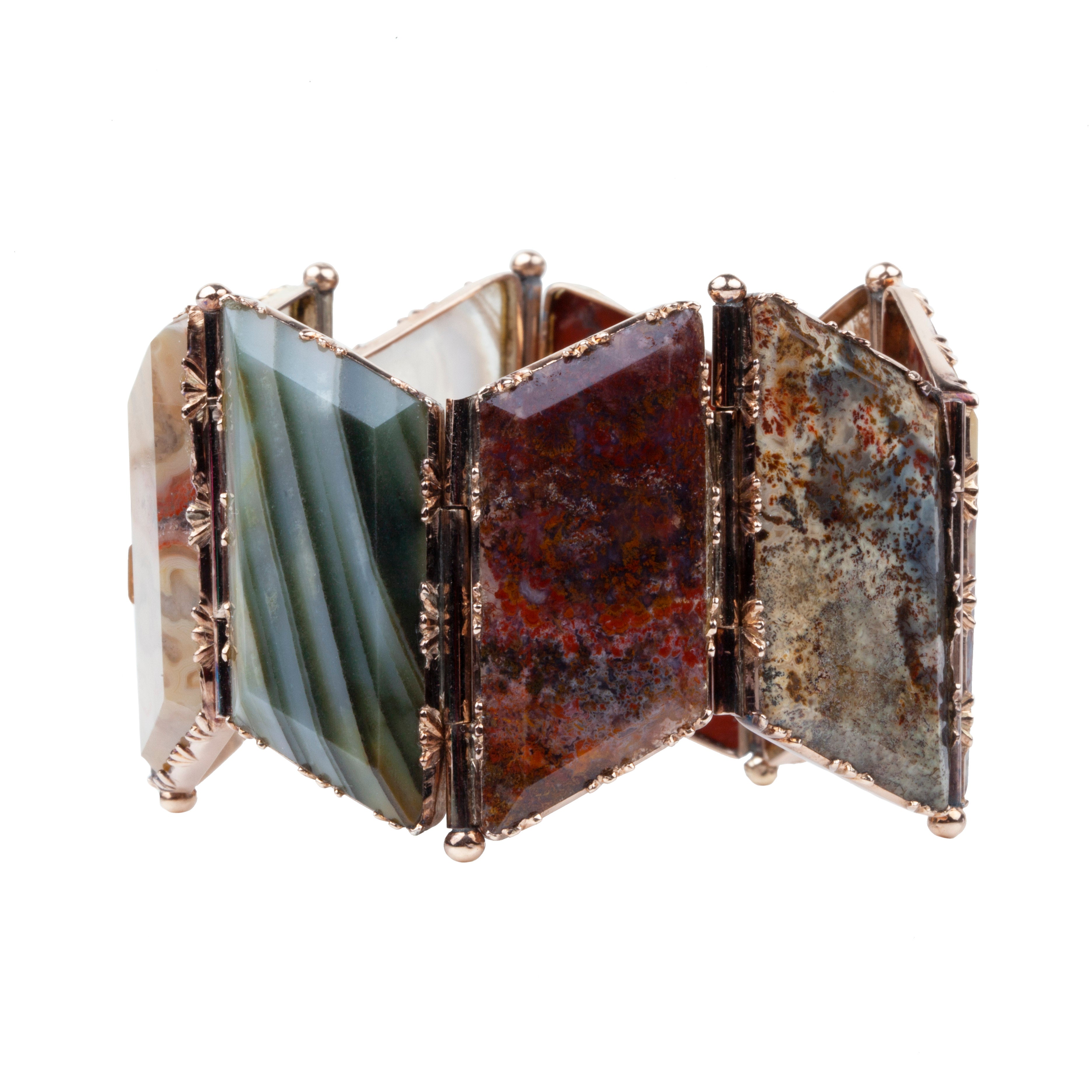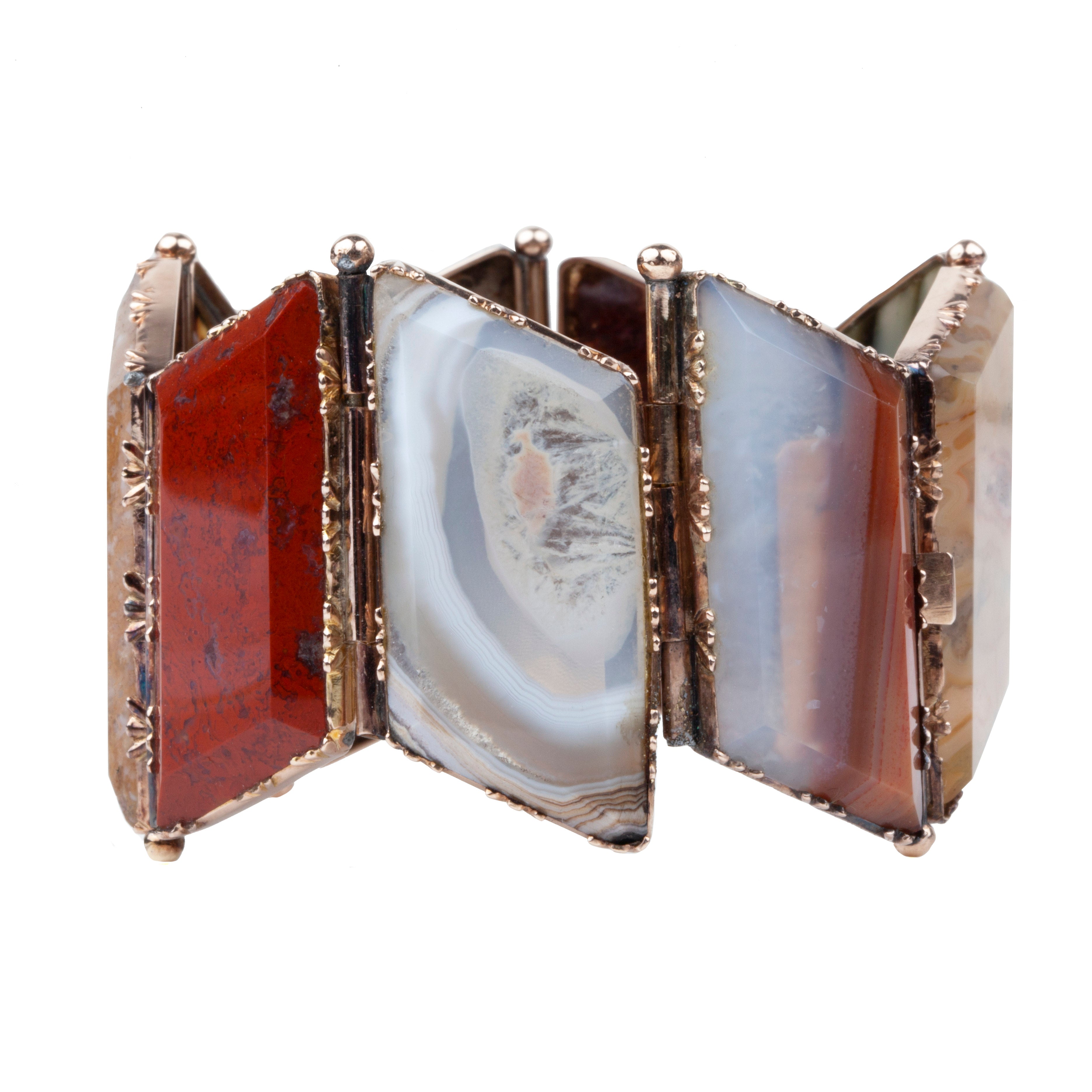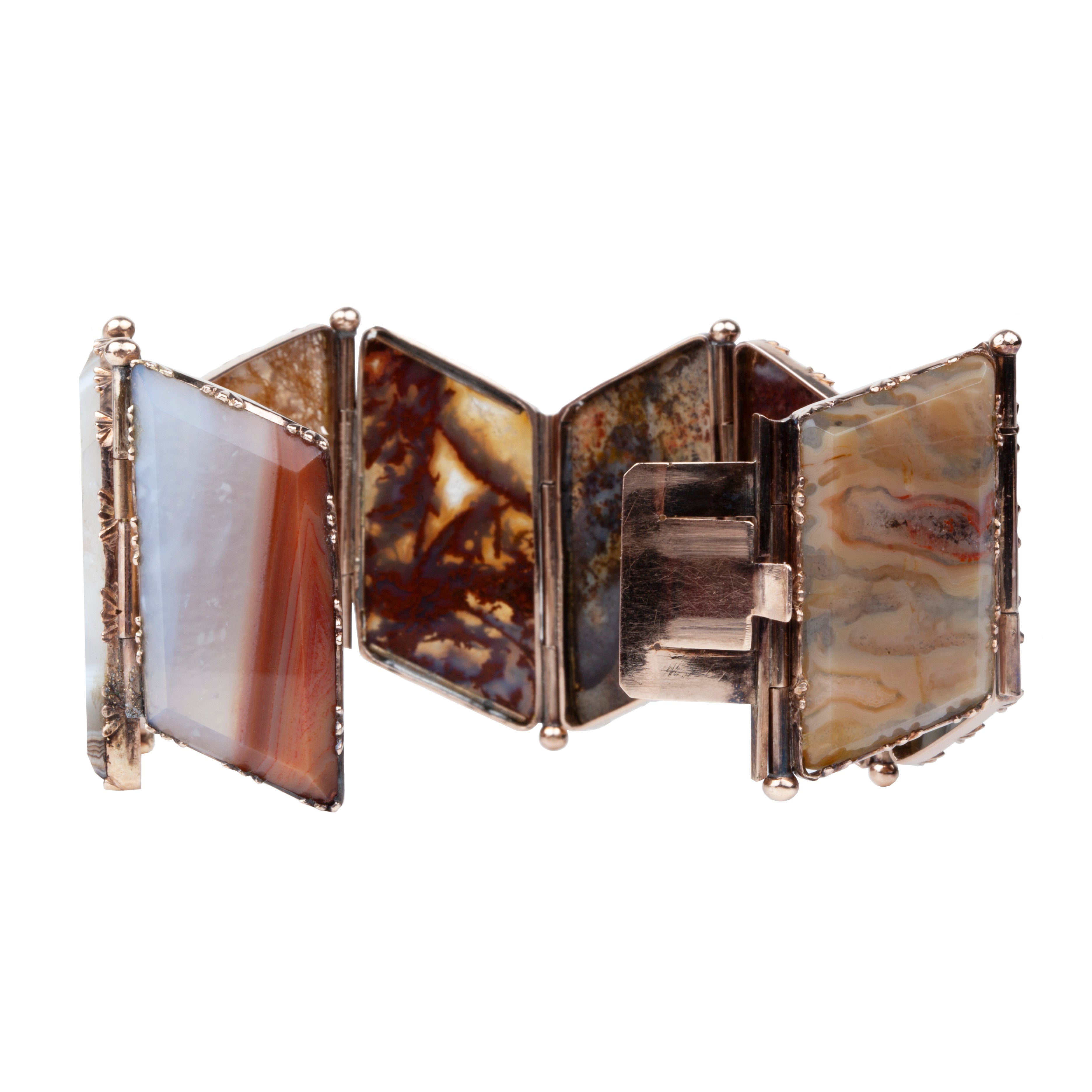Victorian era agate specimen bracelet, in 15k gold. Nine panels feature a different variety of hardstone agate. Each panel is set in a collett setting in an unusual zigzag pattern. Beautiful variation in stone pattern and color. English in Origin. Circa 1860.