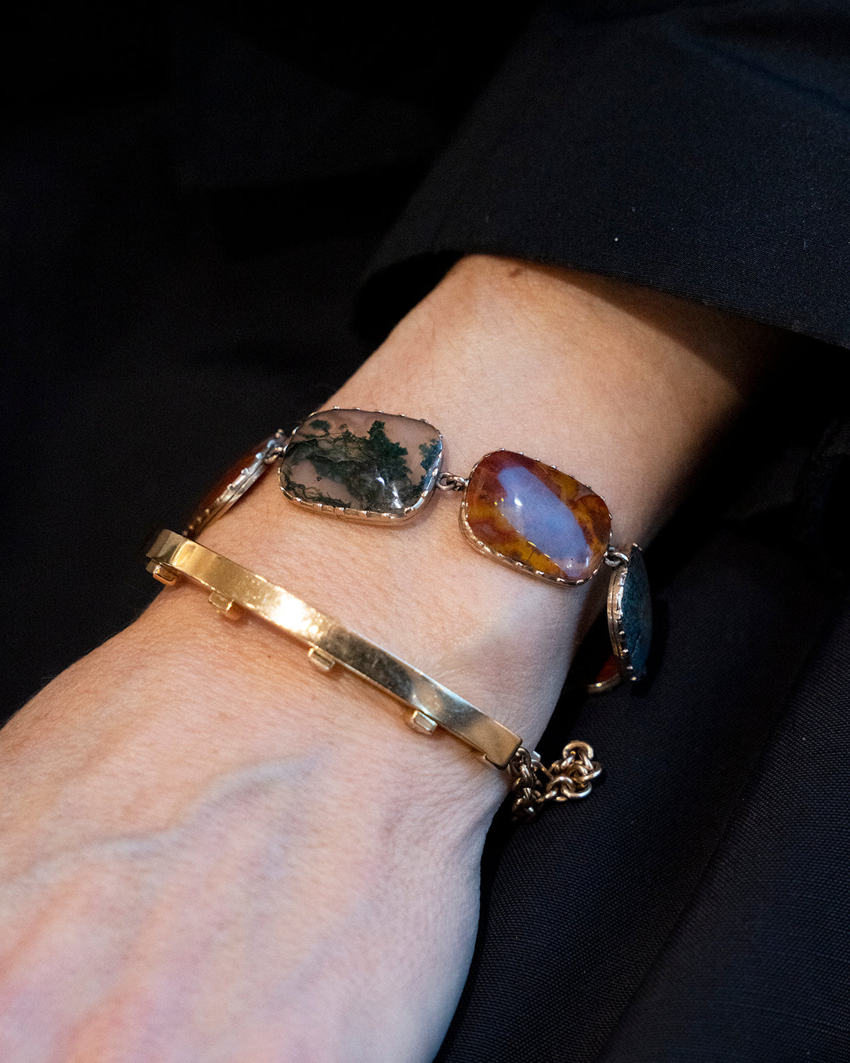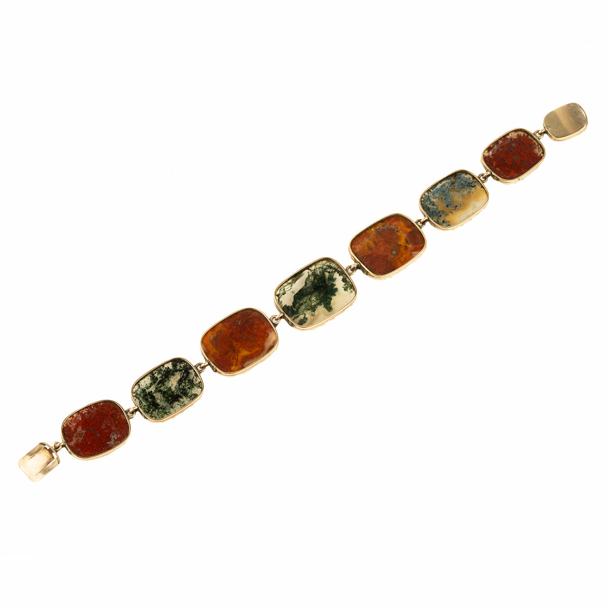 Early 19th century bracelet featuring translucent moss agate and hardstone agate panels, set in 9k gold cut down settings. English in origin. Circa 1820.