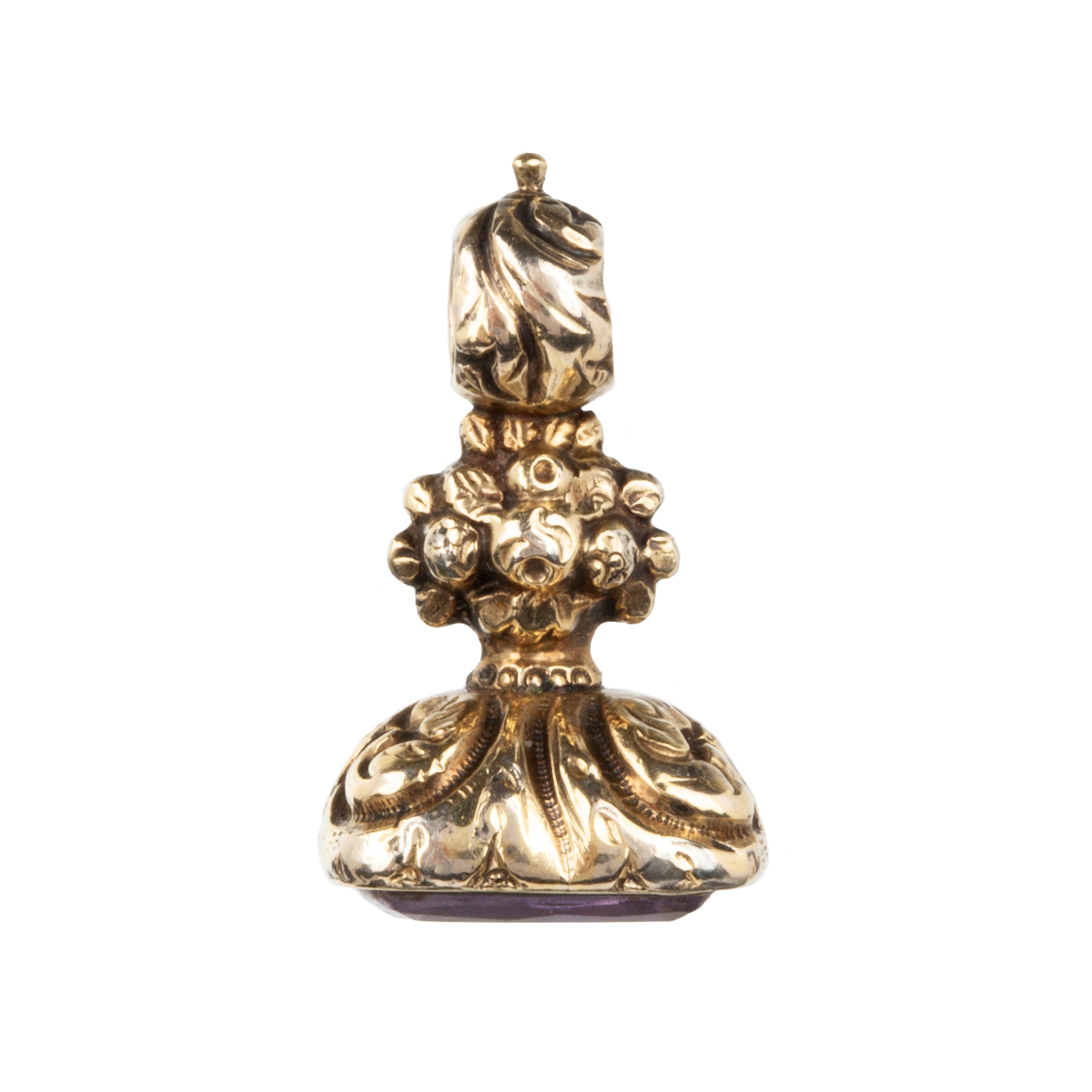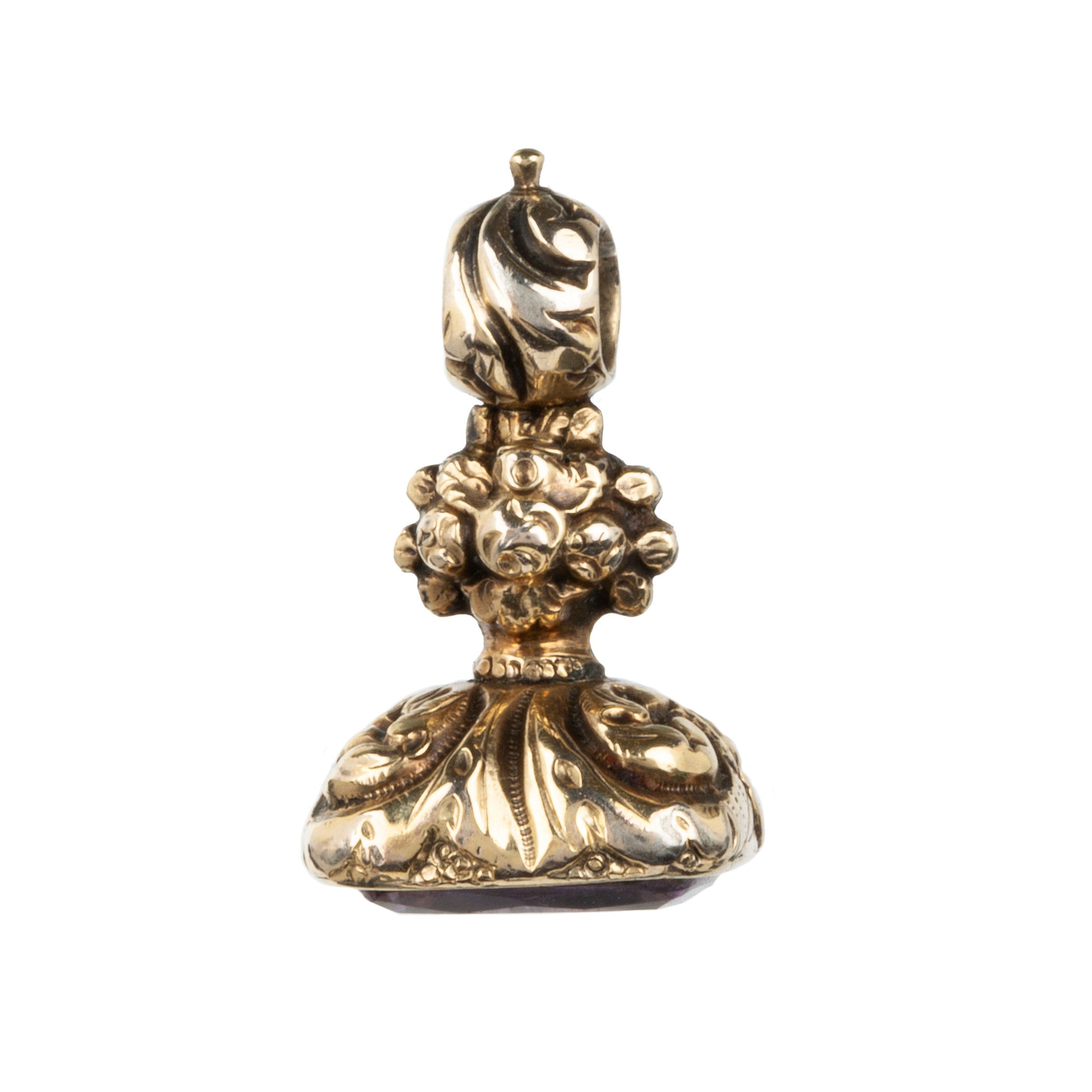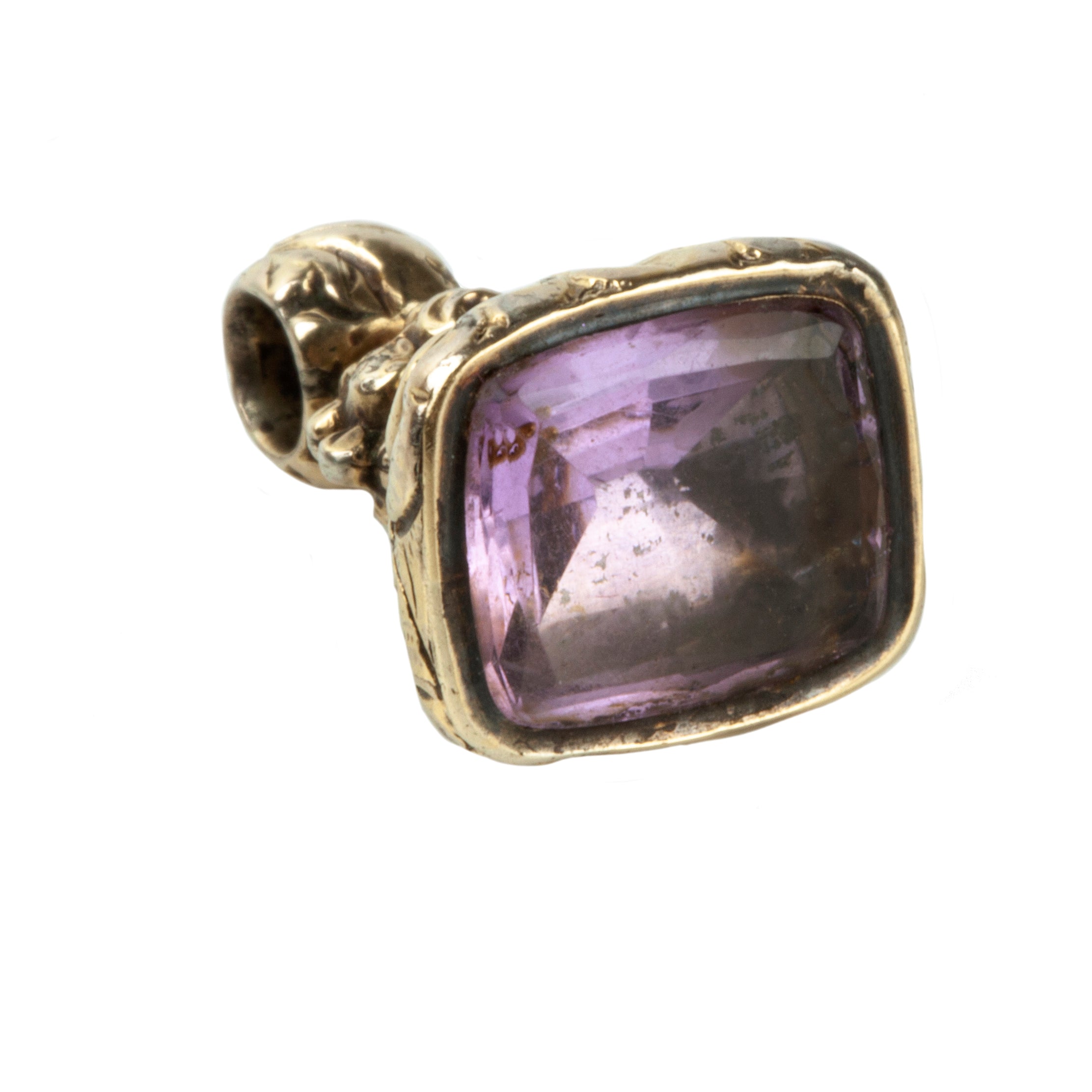 Victorian era amethyst watch fob, in gilded silver setting. Lovely chased ornamental detail. English in origin. Circa 1870.