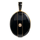 Victorian era black enamel and old mine cut diamond locket, in 18k gold. The original frame and glass is still intact. Personal images can be placed in the locket. English in Origin. Circa 1870.