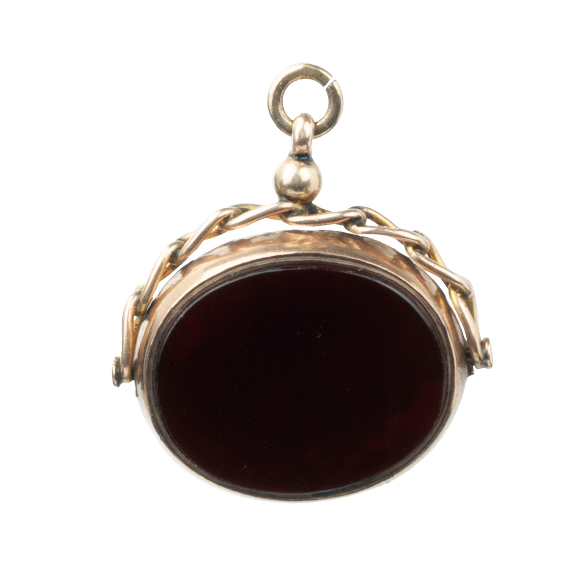 Victorian era spinning watch fob with bloodstone and carnelian panels, in 9k rose gold. Birmingham 1886 Hallmarks.