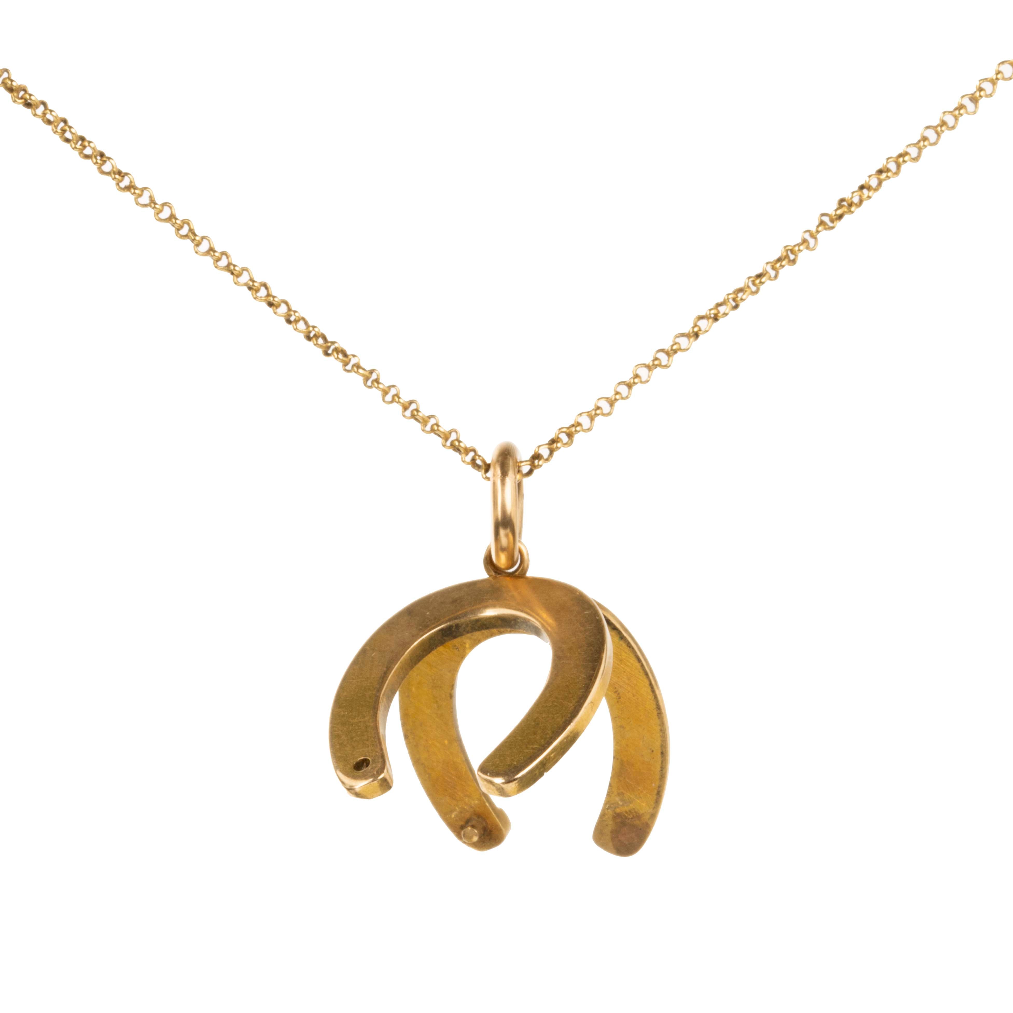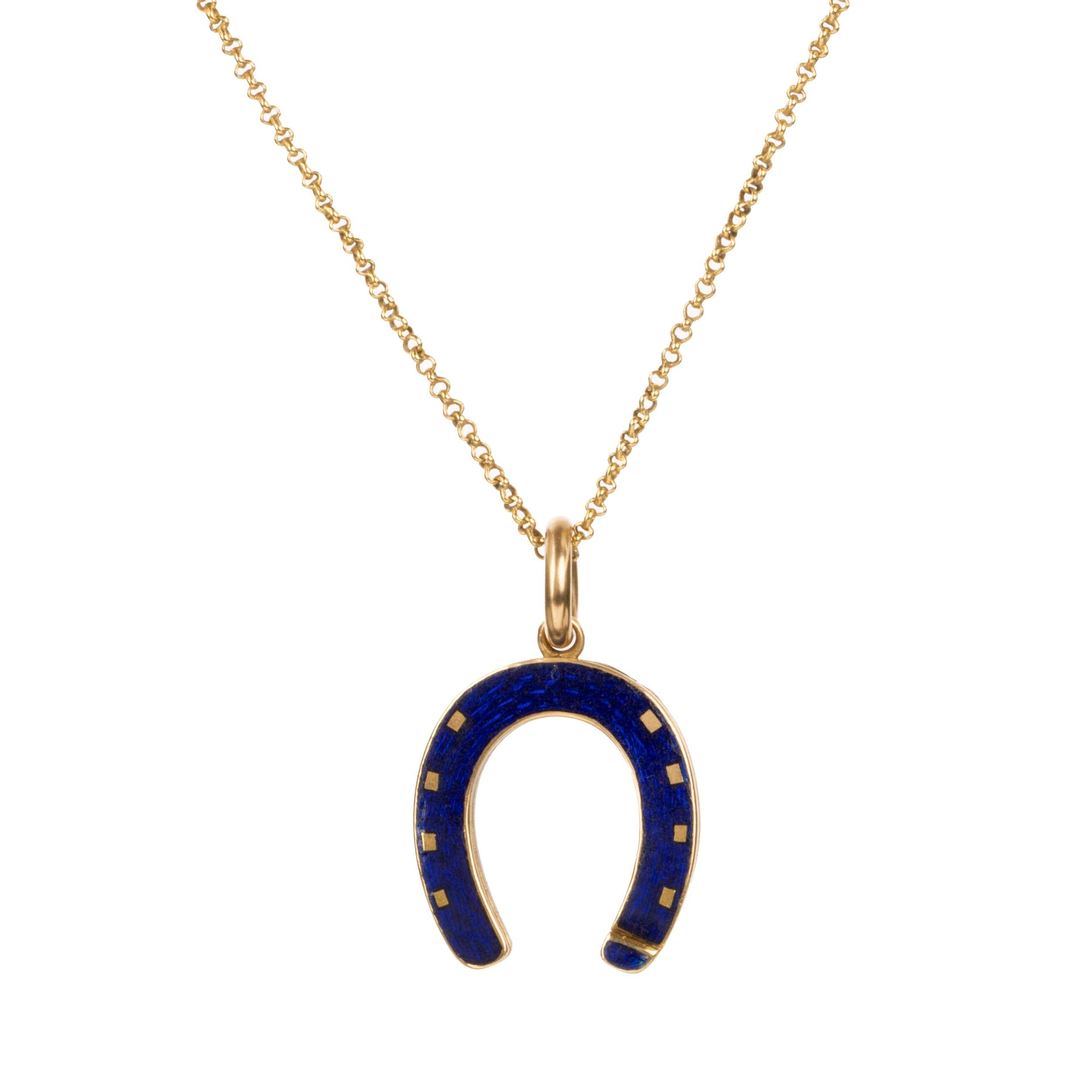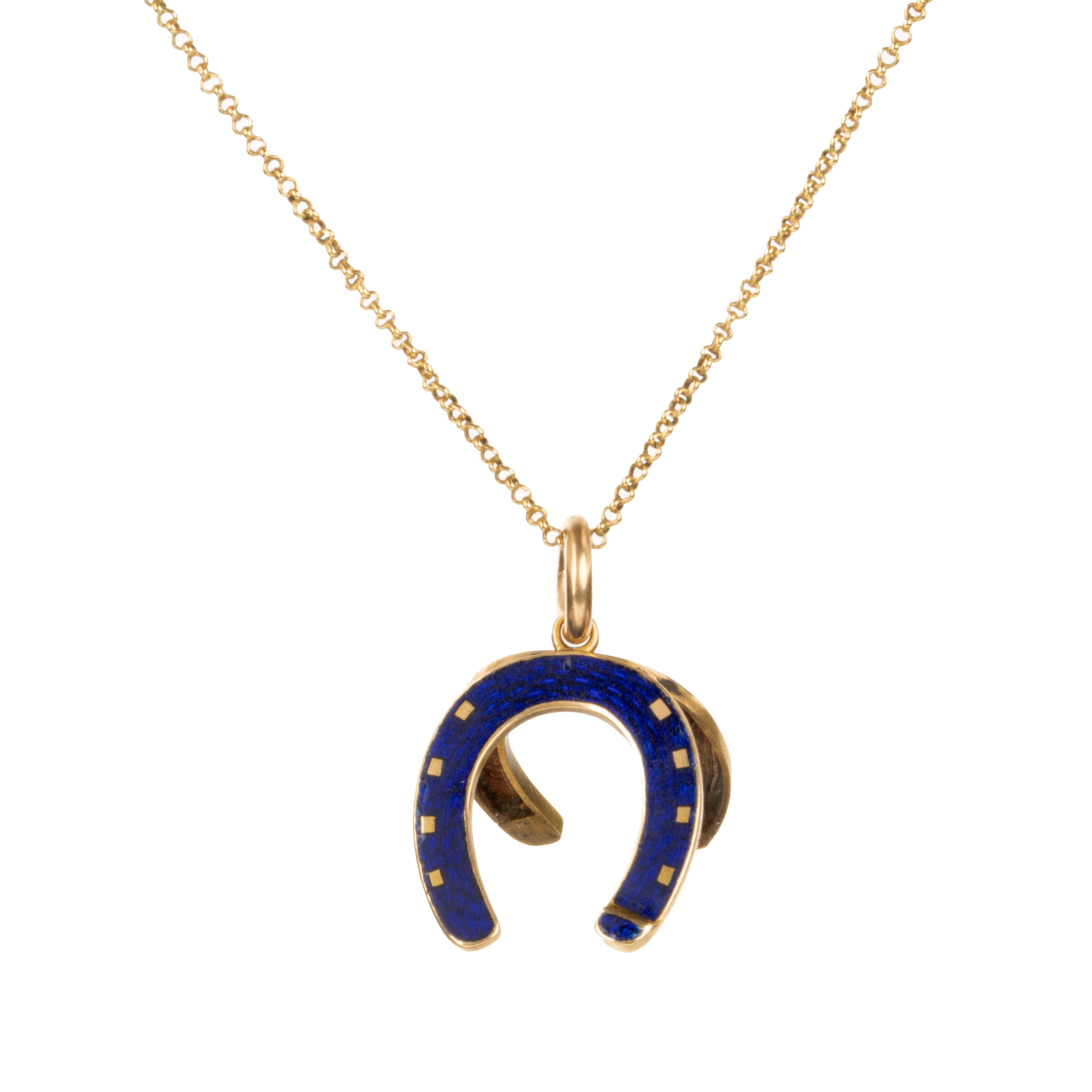 Diminutive Victorian era blue enamel horseshoe locket necklace, 18k gold. English in origin. Circa 1860.