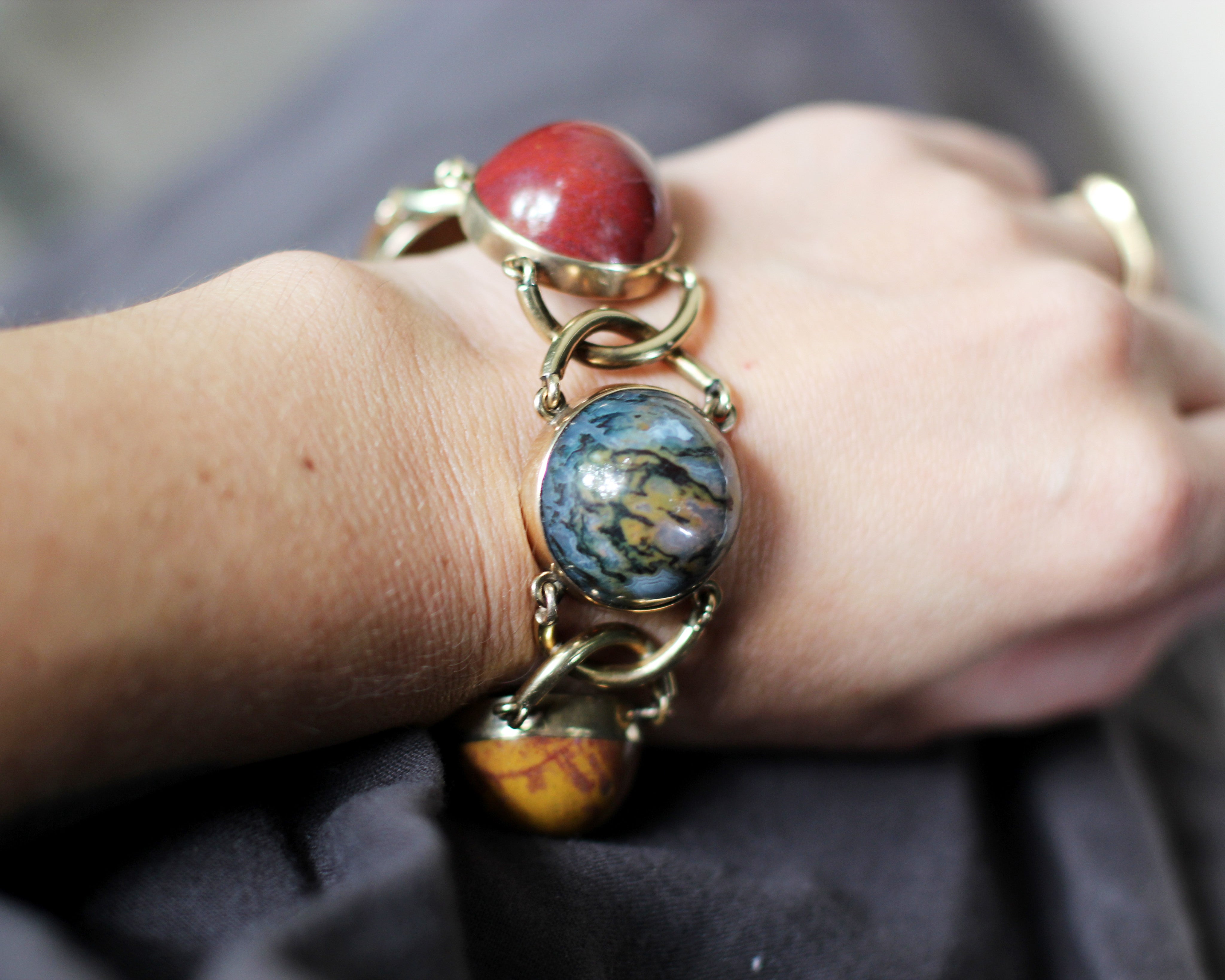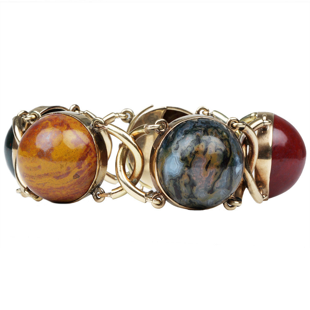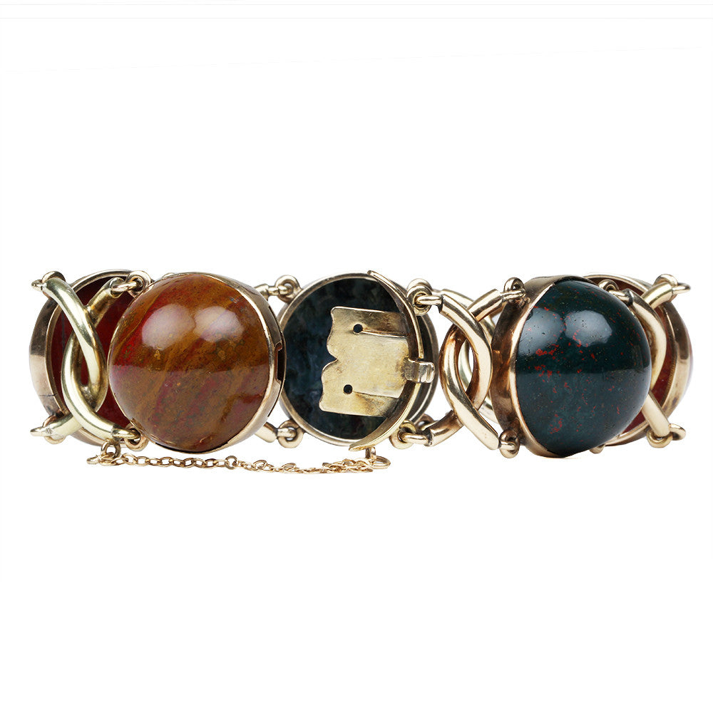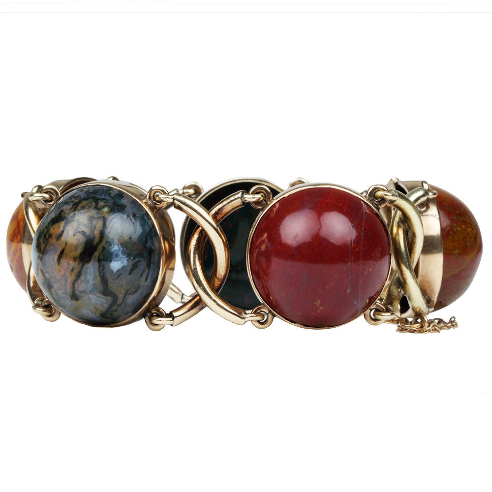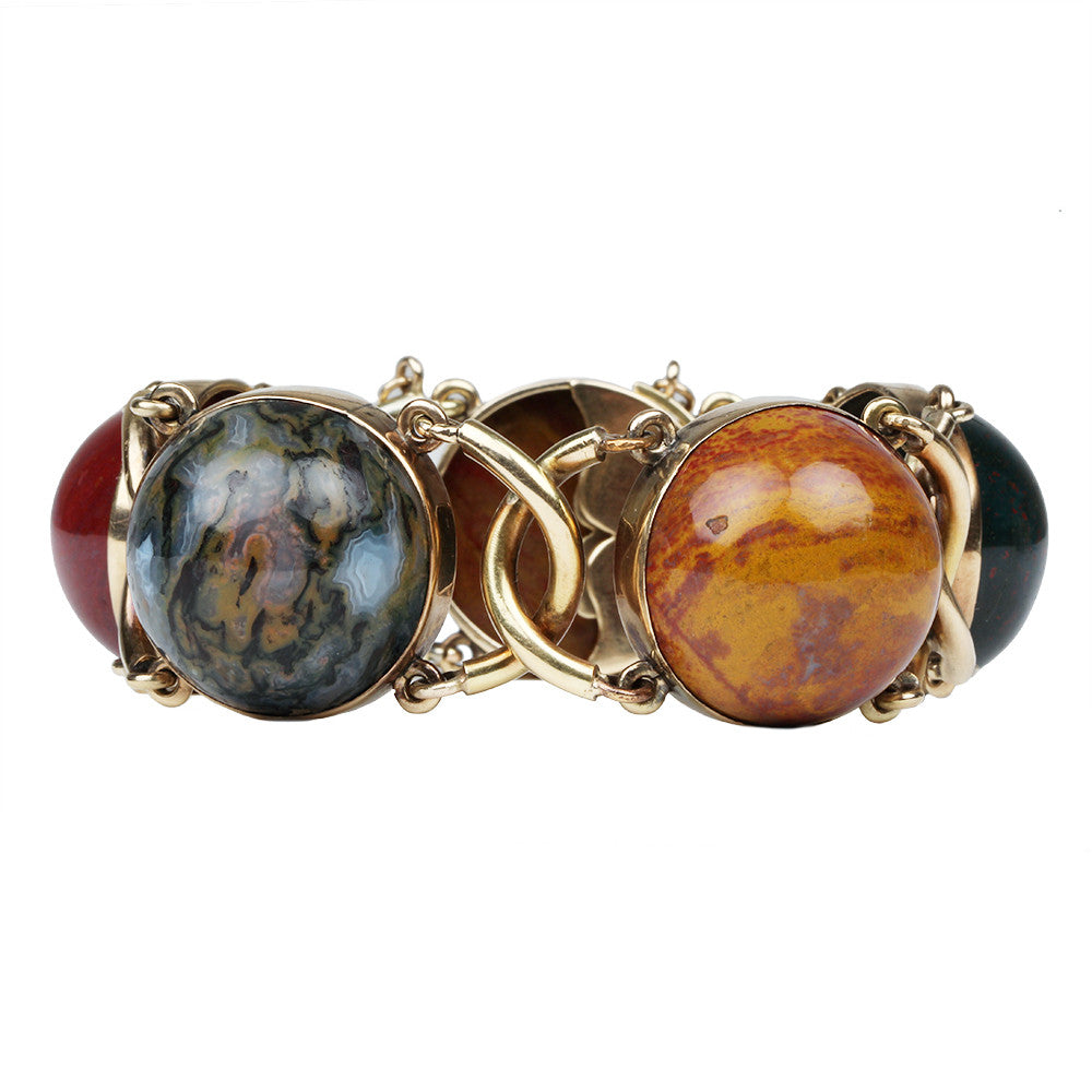 Victorian era multi colored hard-stone cabochon linked bracelet, 15k rose gold. It is unusual to find the Scottish hard-stones in gold, they are more typically found in silver. Scottish in origin. Circa 1870.